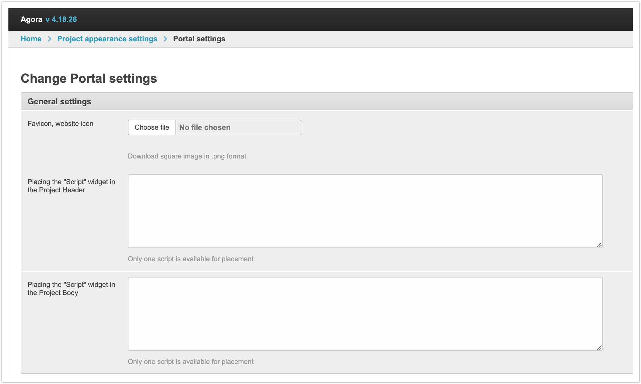 Favicon, website icon is the icon that is displayed for the site in the browser in the line with tabs. In this field, you can upload an image for the favicon. We recommend using a square png image sized 16x16px or 32x32px. Placing the "Script" widget in the Project Header and Placing the "Script" widget in the Project Body - in these fields you can enter the text of the script in the header or in the body, if it is required for third-party widgets and applications. The script is placed on all pages of the AGORA platform. It is possible to place only one script in each field. Installed scripts are run in the following sequence: first header, then body.