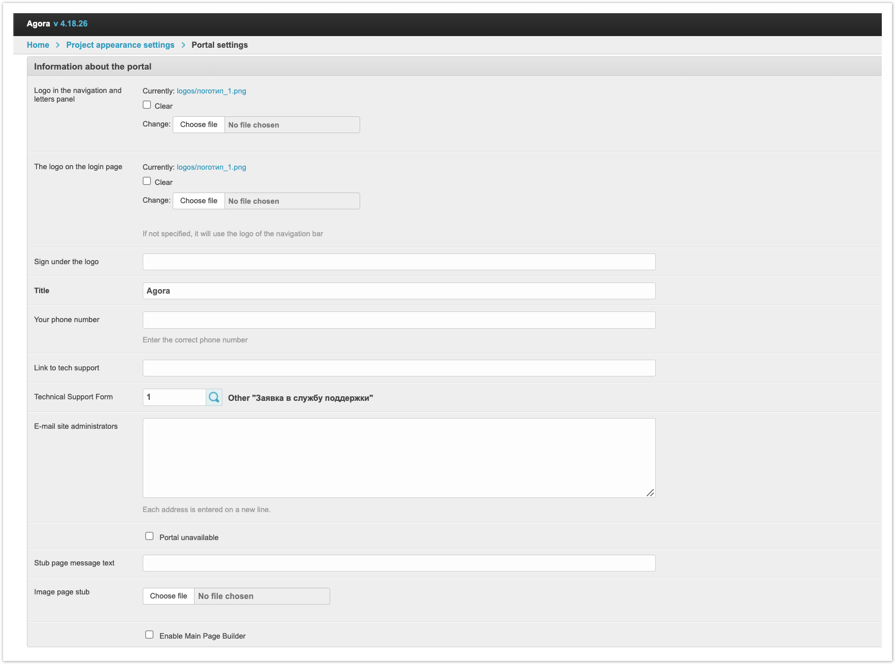 Technical Support Form - in this field you can select the form of contacting technical support. You must first create it through the Feedback Forms section in the admin panel. E-mail of site administrators - here you can specify the e-mail addresses to which notifications from the platform will be sent. Then there are three settings that allow you to restrict access to the platform for a while. For example, it is important to turn on the unavailability of the platform for the time when an inventory is being carried out or other internal processes that may be prevented by placing new orders by users. Portal Unavailable - This setting makes the platform unavailable to all users. That is, no user will be able to log in to the platform, view the catalog or place an order. To apply this setting, you need to restart the platform using the Restart the queue button in the admin panel. Stub page message text - in this field you can specify the text that will be displayed to users when the platform is unavailable. Image page stub - here you can upload an image that will be displayed to users when the platform is unavailable. The image can accompany the text specified in the previous field, or it can be used without text. After the inventory is completed, it is enough to turn off the Portal unavailable setting and restart the portal again. Enable main page builder - this setting is responsible for connecting the main page builder of the project. For flexible customization of the appearance of the main page, there is a separate block of settings in the admin panel - Main Page Settings. Company details