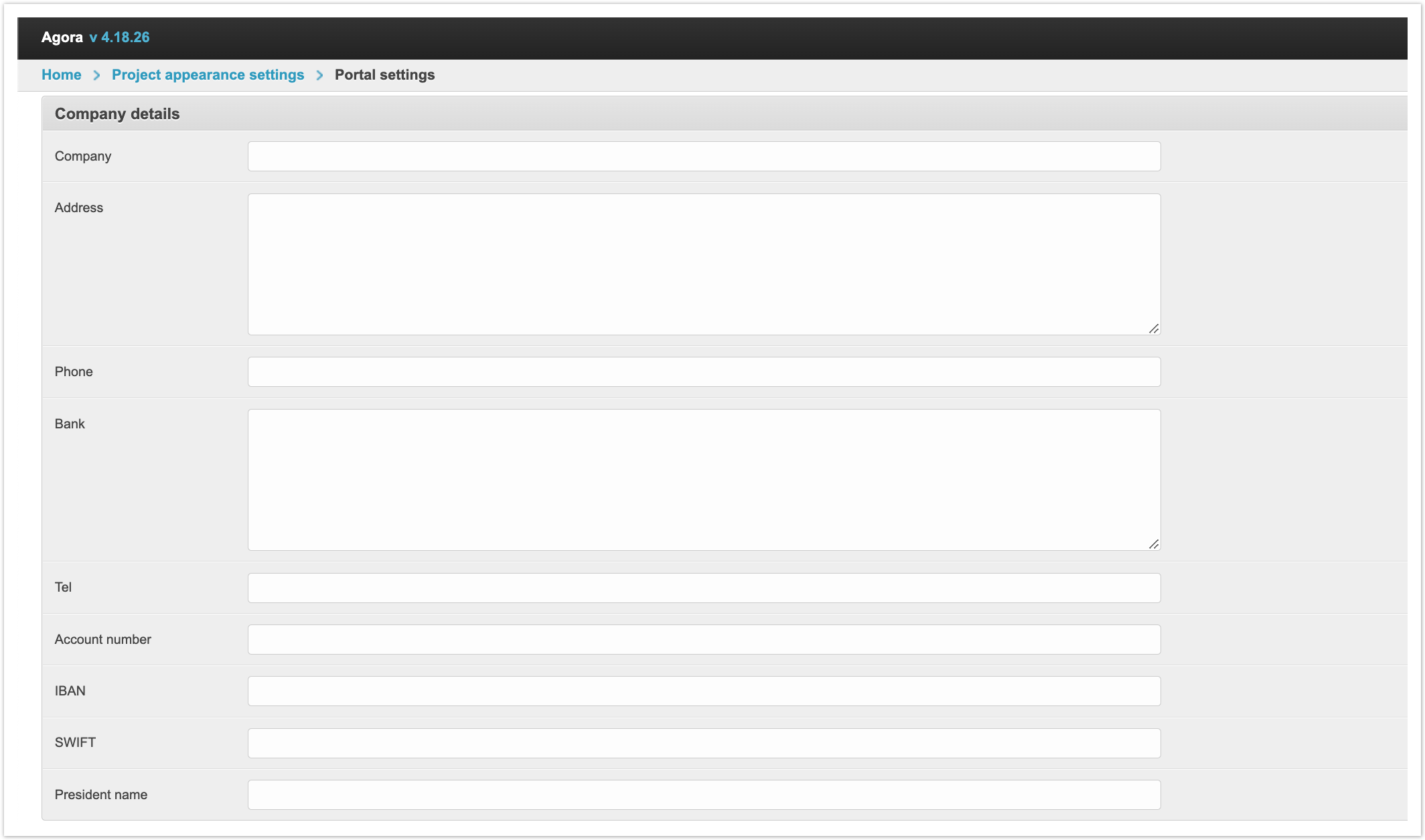 In this block, if necessary, you can fill in various details of the company: Company, Address, Phone, Bank, Account number, IBAN, SWIFT, President name. This data is mainly used for internal use. Sms