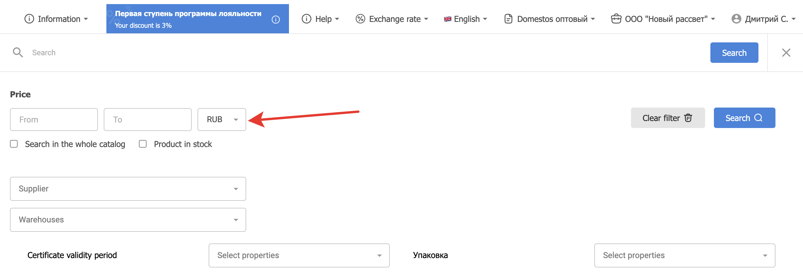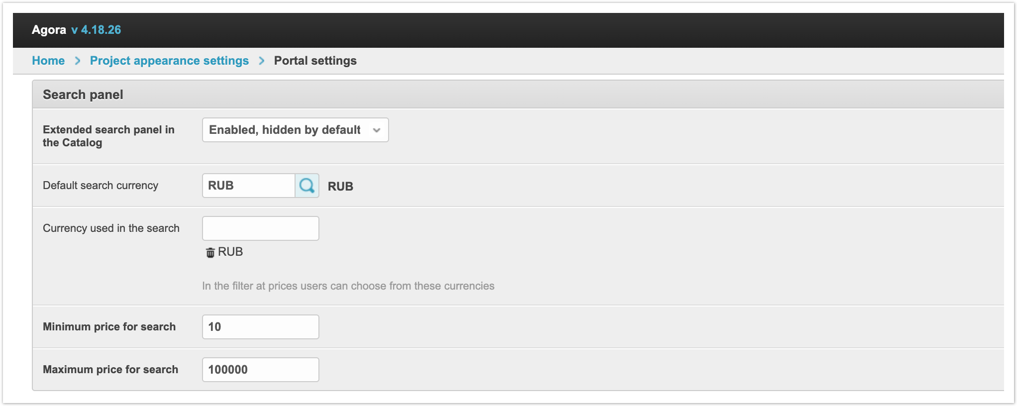 Extended search panel in the Catalog - there are three values in the drop-down list: Completely disabled, Enabled hidden by default, Enabled shown by default. Depending on the selected value, you can adjust the display of the panel for advanced search in the catalog. Through this panel, you can search for products in the catalog by properties. Default search currency - this field is filled with the currency that will be used by default when searching the catalog. Image Added