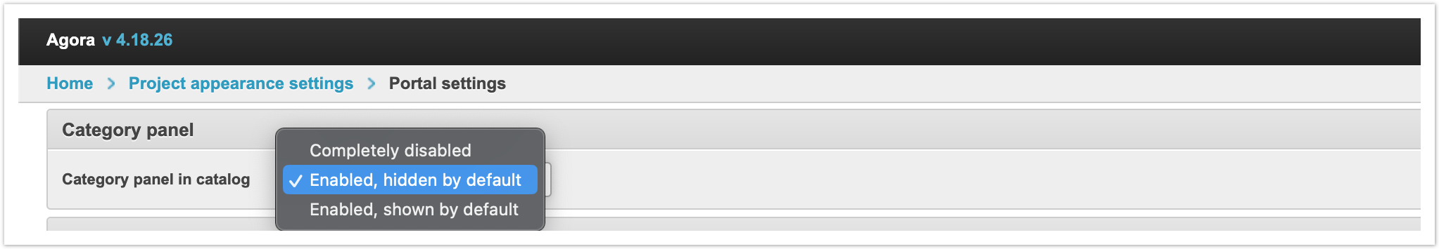 Category panel in the catalog - there are also three values in the drop-down list: Completely disabled, Enabled hidden by default, Enabled shown by default. Depending on the selected value, the category panel in the product catalog will be hidden or displayed. Image Added