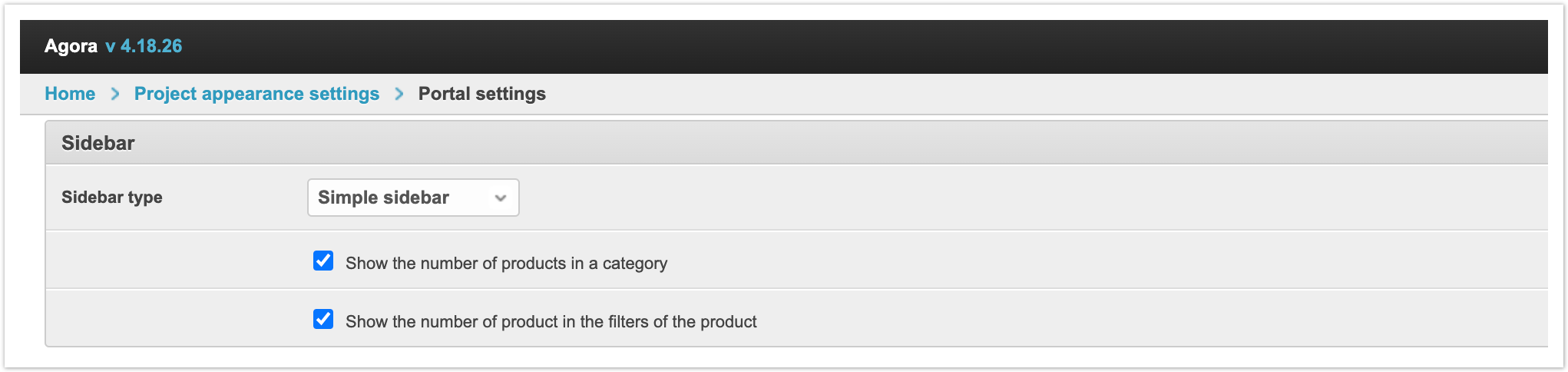 Sidebar type - in the drop-down list, you can choose from two values: Simple sidebar or Advanced sidebar. The visual display differs slightly for these options. Show the number of products in a category - this setting controls whether the quantity of products in each category will be indicated or not. Show the number of product in the filters of the product - this setting controls whether the product quantity will be displayed in product property filters or not. Additional panel