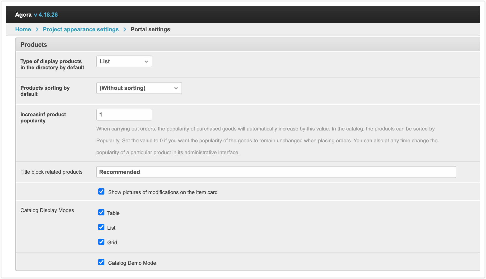 Products sorting by default - this field sets the sorting that will be automatically applied in the catalog for all users. You can sort in ascending or descending order by the following data: Price, Name, Popularity, Newest, Article, Availability of photo. If necessary, the user can set the sorting of products he needs manually. Increasinf product popularity - this field specifies the value for automatic popularity growth, and further, when placing an order for a product, its popularity will automatically increase by the growth value. The popularity parameter is relevant when sorting products by popularity. With the help of automatic increase in popularity, you can display the most popular products to customers at the top of the list. If it is necessary that the popularity of products does not change when placing orders, then you need to set the growth value to "0". Title block related products - this title will be displayed in the product card for the block with recommended products.