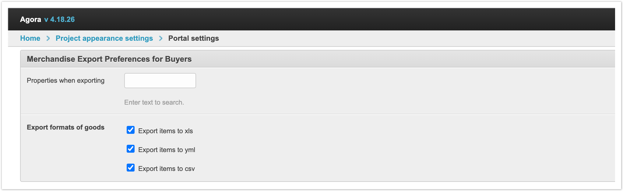 Properties when exporting - in this field you can select those properties that should be written and uploaded in the export file. Export is used by buyers to upload product data to a file and then upload it to trading platforms. Export formats of goods - this setting allows you to select those goods export formats that should be available to buyers in your personal account. Catalog