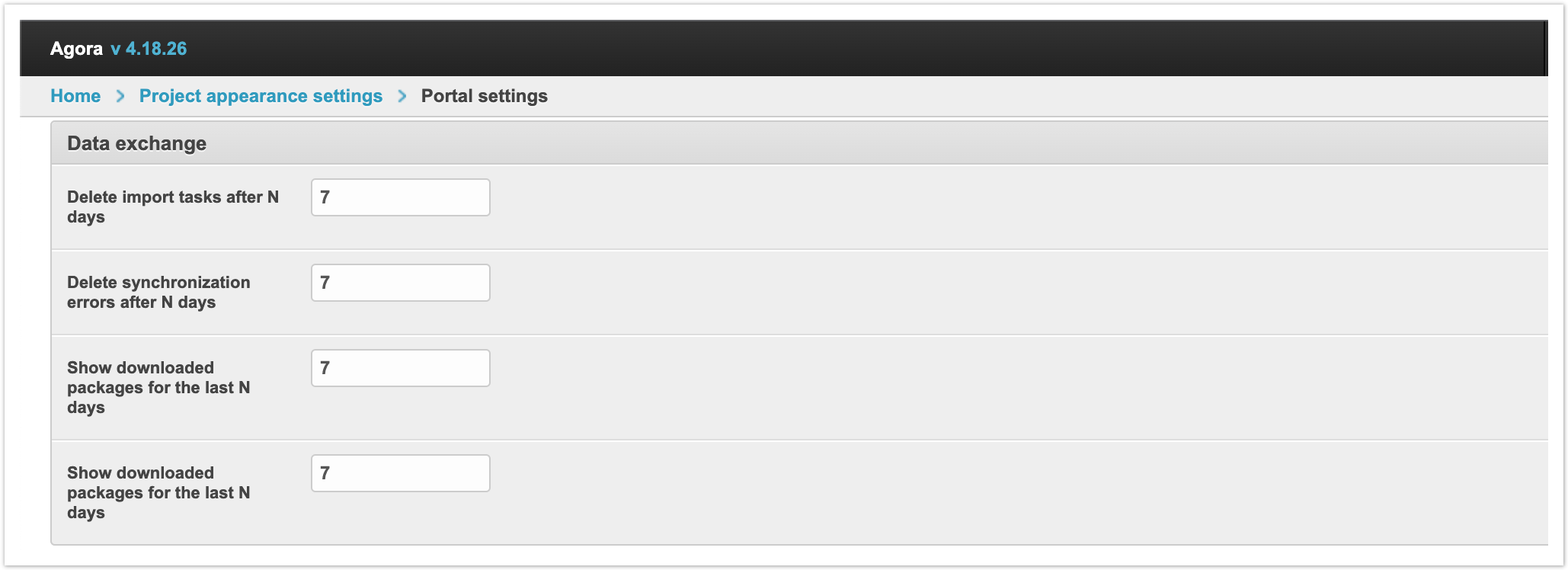 This section configures the display of data packages, deletion of tasks and errors when exchanging data with other information systems. Delete import tasks after N days - specifies the number of days after which packages are removed from the exchange queue. This data is displayed in the administrative panel, section Exchange queue. Delete synchronization errors after N days - indicates the number of days after which errors that occurred during the exchange with external accounting systems are deleted. Data on errors is displayed in the administrative panel, section Sync errors. Show downloaded packages for last N days - specifies the number of days after which import packages are deleted. This data is displayed in the administrative panel, section Exchange packages Import. Show unloaded packages for the last N days - specifies the number of days after which export packages are deleted. This data is displayed in the administrative panel, section Exchange packages Export. Enter the site