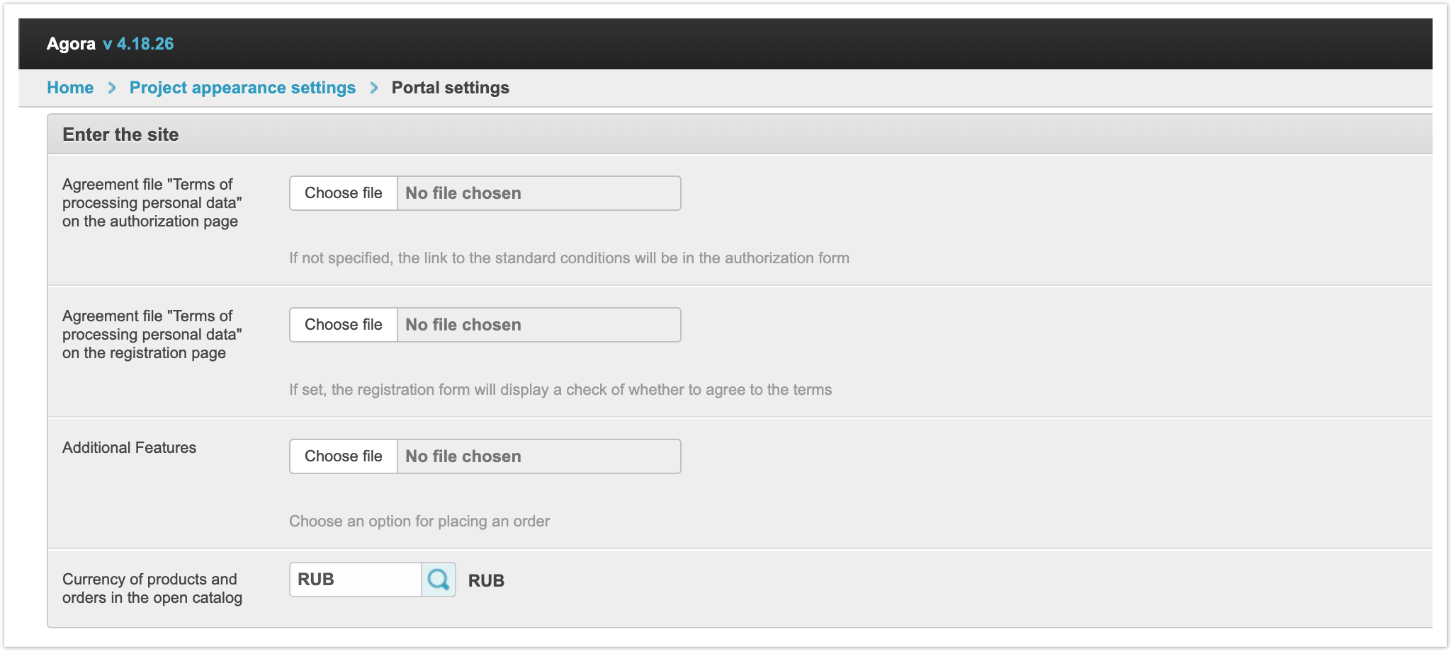 Agreement file "Terms of processing personal data" on the authorization page - in this field, you can upload a file with the conditions for processing personal data to be displayed to the user during authorization on the platform.