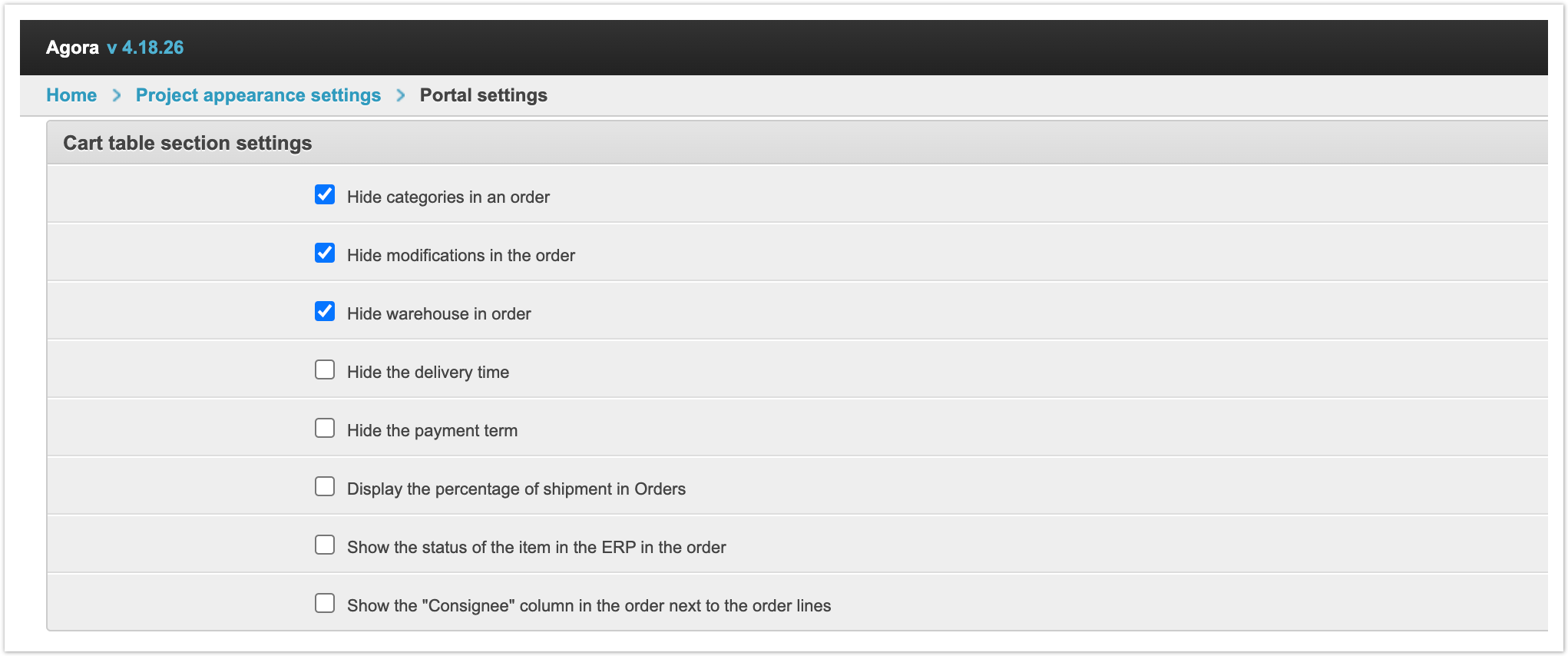 Hide categories in the order, Hide modifications in the order, Hide warehouse in the order, Hide delivery time, Hide payment term - these settings allow you to hide certain data from the order card in the Cart and in the Orders section. Display the percentage of shipment in Orders, Show the status of the position in ERP in the order, Show the "Consignee" column in the order next to the order lines - these settings allow you to display additional data on the order in the buyer's personal account in the Cart and in the Orders section.