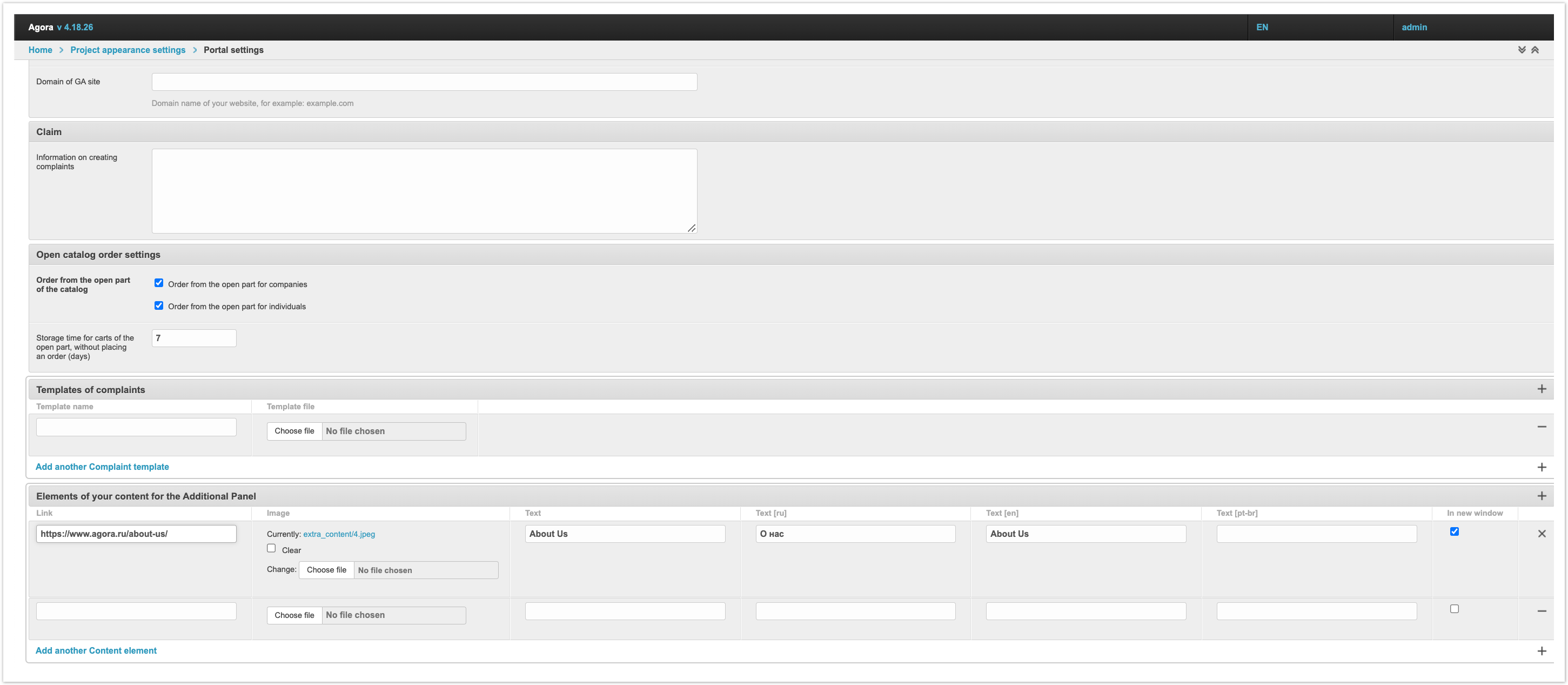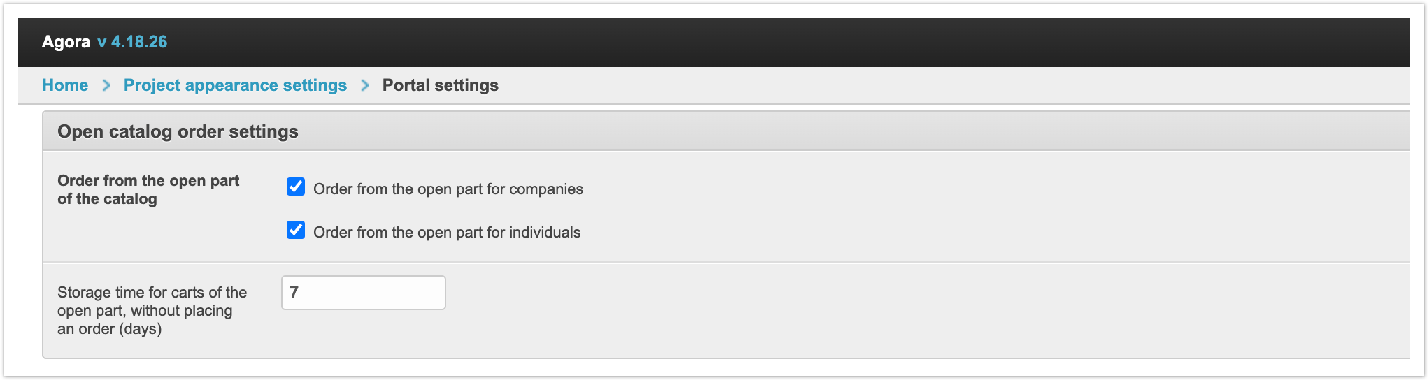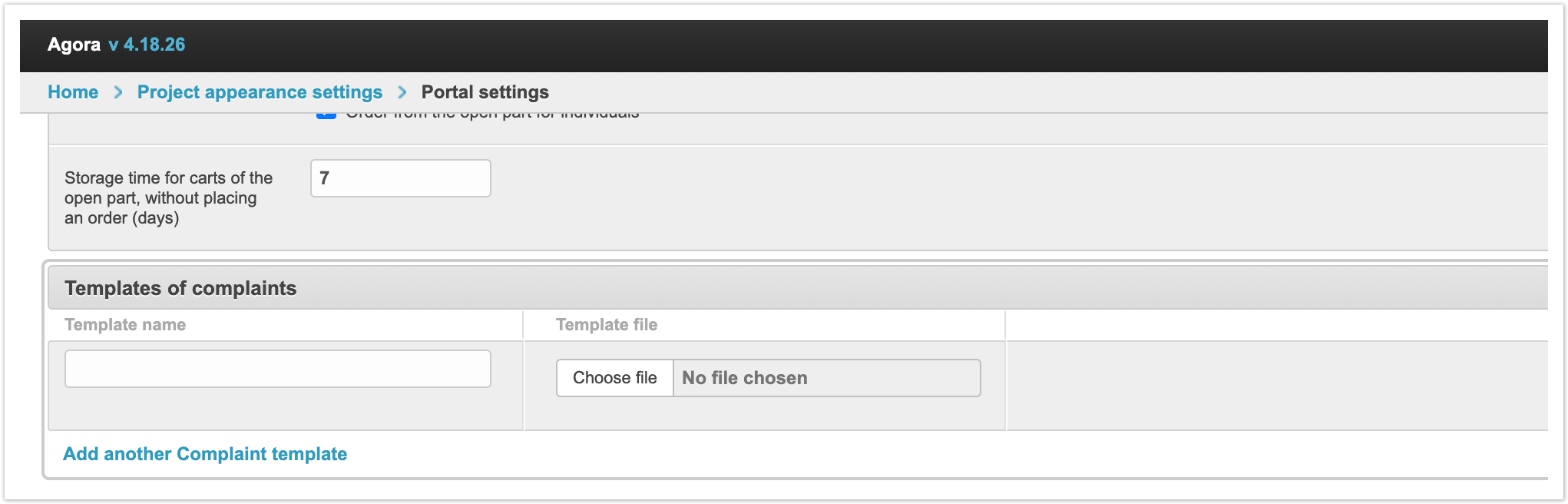 Order from the open part of the catalog - this setting controls the ability to place an order without registration for legal entities and individuals. Storage time for carts of the open part, without placing an order (days) - here you can specify the number of days during which the basket will be stored, even if the order has not been placed. Templates of complaints