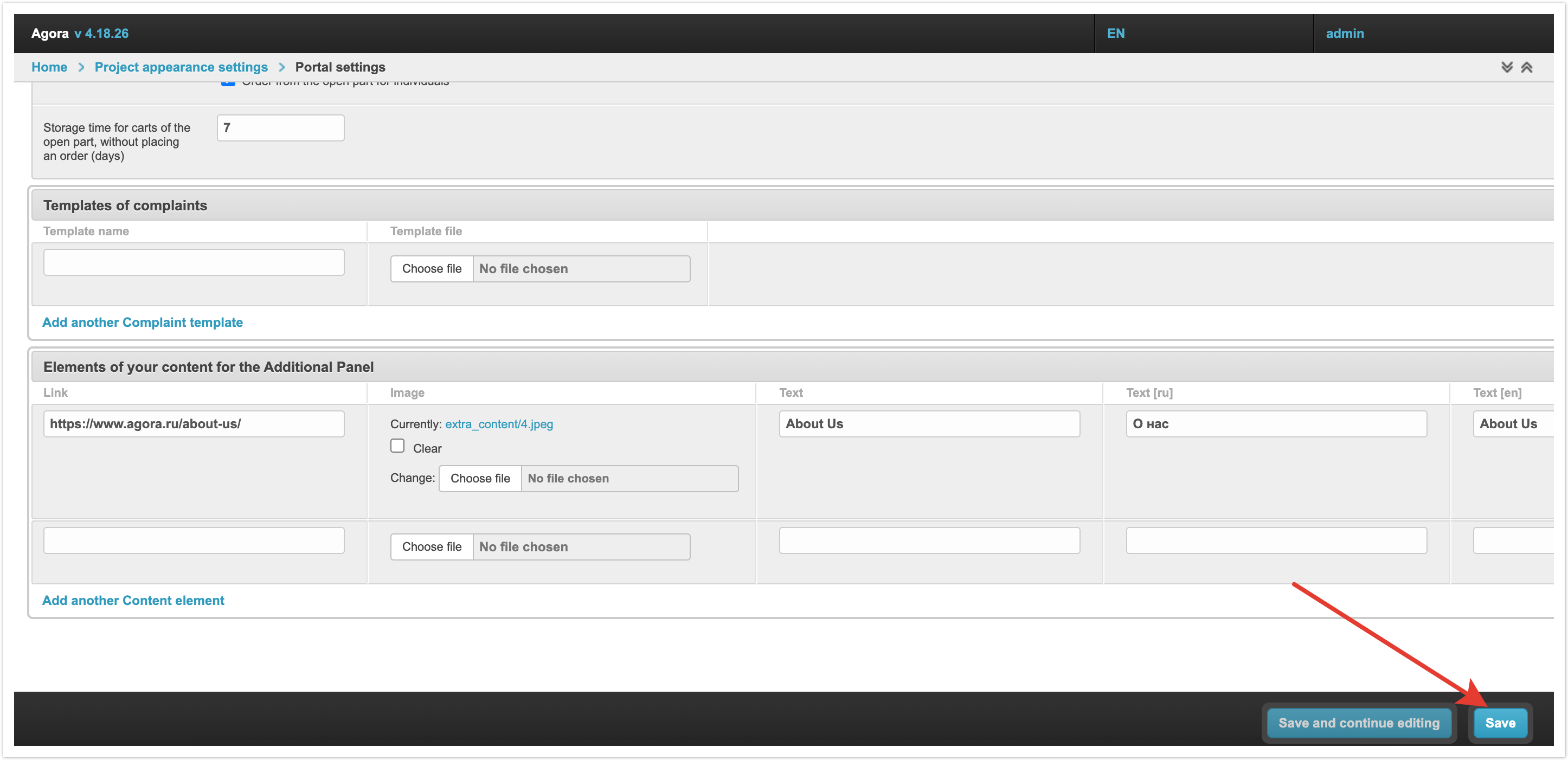 In the last block, you can configure additional content elements if their output has been connected. To add your content elements to the additional panel, you need to specify the URL of the page, and then you can upload an image and fill in the Text for link field. Text can be specified in different languages if multilanguage is used. In New window setting allows you to open the page in a new window without leaving the platform page. To save all the changes made, click the Save button in the lower right corner of the page.