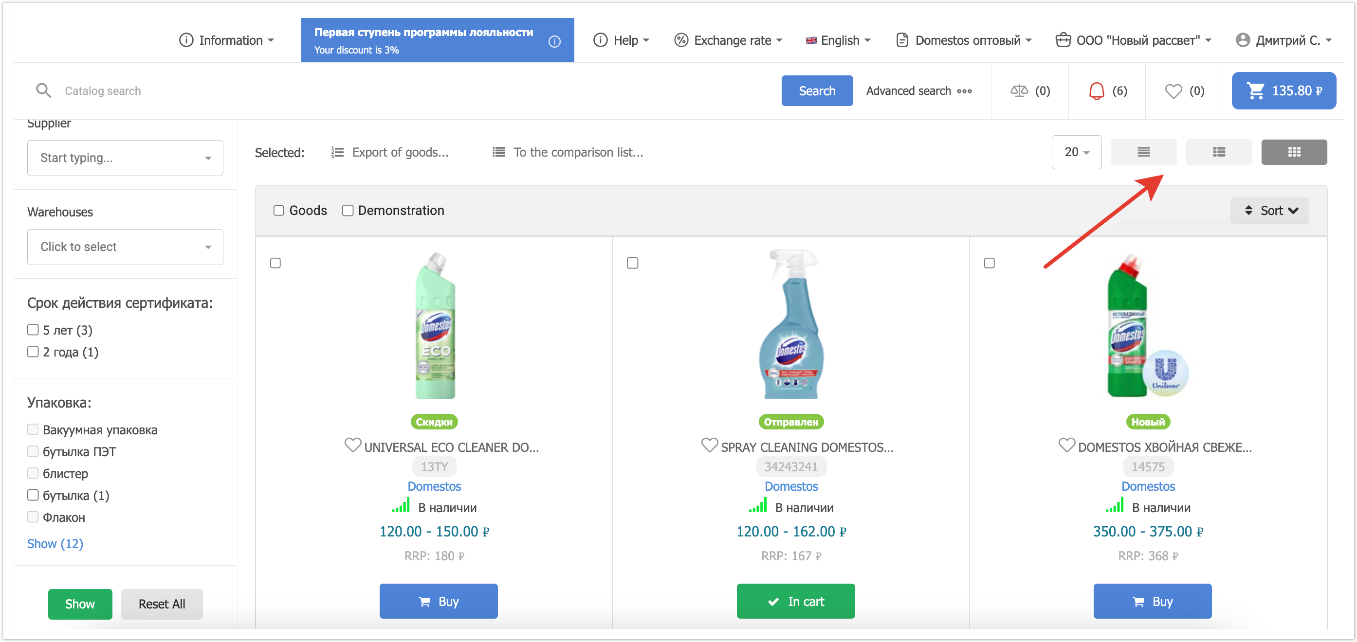Type of display products in the directory by default - there are 3 values in the drop-down list: Table, List, Grid. Depending on the selected value, the products in the catalog in the personal accounts of users will take on the specified display type. If necessary, the user can change the view of the catalog display in his personal account manually.