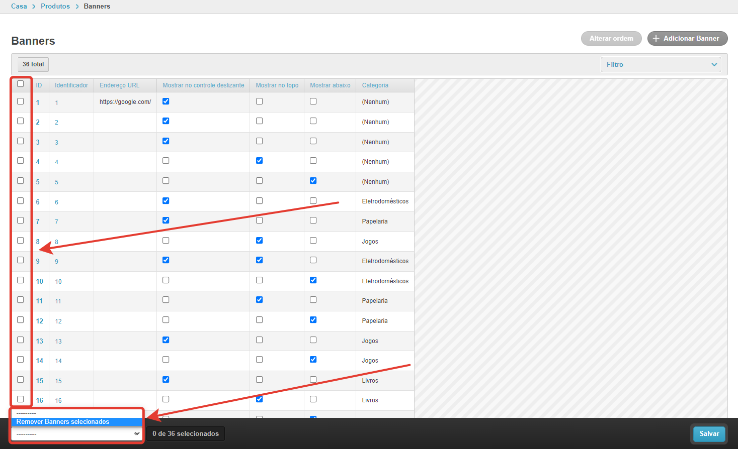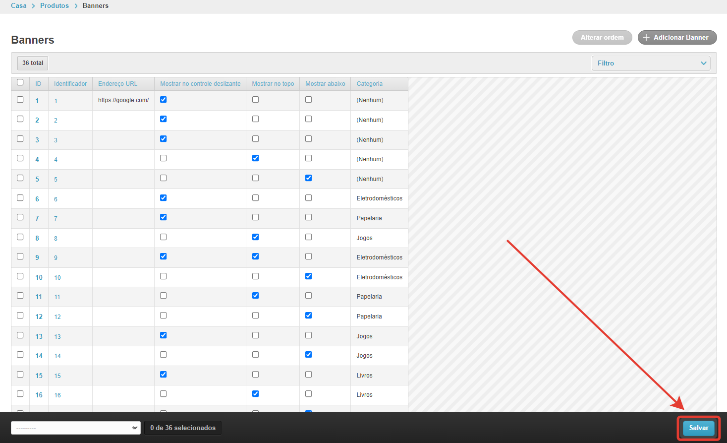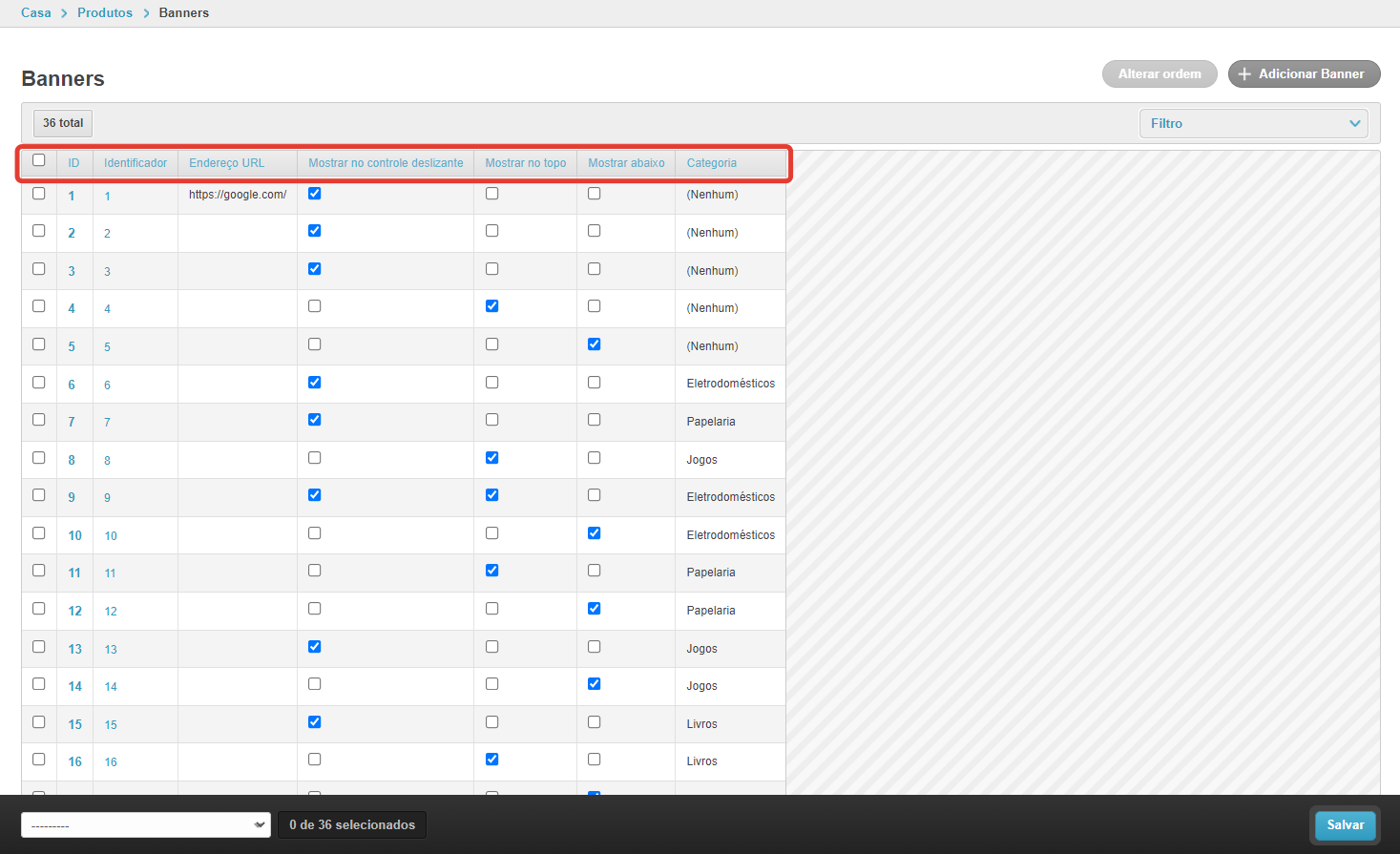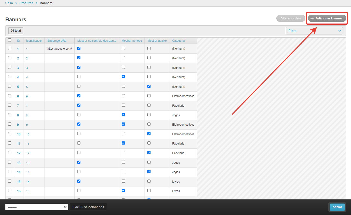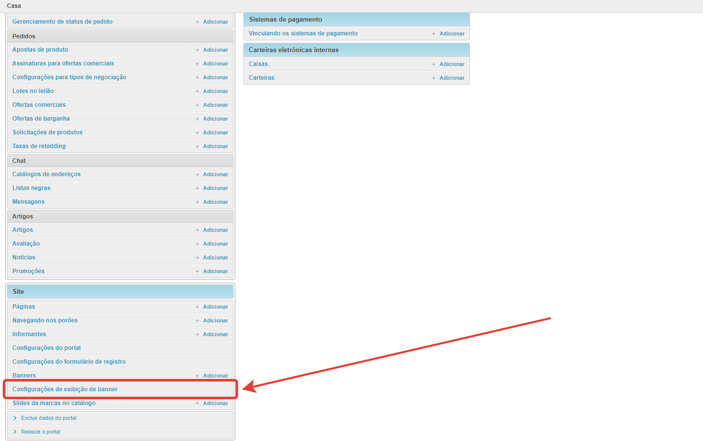 Criando bannersOs banners estão configurados no painel administrativo do projeto. Após autorização no painel administrativo, vá para a seção Banners. Para adicionar um novo banner, clique no botão Adicionar banner: Na janela que abre, defina as condições para exibir o banner. Imagem — especifique o caminho local para o arquivo (banner). Banner deslizante — o tamanho da imagem carregada que será exibida na seção Slides. Banner superior/inferior — o tamanho da imagem enviada, que será exibida na seção Banners (parte superior/inferior). Endereço de URL — é preenchido, se o banner precisar ser clicável, ao clicar no banner, a transição para a URL especificada será realizada. Identificador — um valor único para cada banner. Esse valor é necessário para o armazenamento correto do arquivo banner no projeto e a conveniência de gerenciar a configuração do display do banner no diretório. Show (No controle deslizante/Superior/Inferior) — caixa de seleção, segundo a qual a lógica de exibição de banners está definida. Categoria — uma categoria de mercadorias, quando você vai para onde este banner será exibido. Se a categoria do produto não for especificada, os banners serão exibidos na página Catálogo e Informação. Se a categoria do produto for especificada, o banner será exibido apenas na página desta categoria no Catálogo. Depois de especificar todas as configurações, clique no botão Salvar na parte inferior da página. Gerenciamento de bannersVocê pode ver todas as configurações na tabela pivô, bem como gerenciar quais páginas do projeto exibirão banners, usando as caixas de seleção da seção Banners do painel administrativo. ID — número do banner. Identificador — o valor atribuído durante a criação de cada banner. Endereço URL — o link que será clicado ao clicar no banner. Mostrar no controle deslizante — o banner será exibido no controle deslizante. Mostrar no topo — a imagem será exibida na parte superior, à direita do controle deslizante. Mostrar abaixo — a imagem será exibida na parte inferior, à direita do controle deslizante. Categoria — indica em qual categoria do catálogo do Agora o banner será exibido. Quando nada for instalado, o banner será exibido na raiz do diretório. Quando terminar, clique em Salvar. É possível excluir um ou mais banners usando o botão Remover Banners selecionados. Configurações de exibição de bannerNesta seção do painel administrativo, o tipo e o método de exibição de banners no catálogo são alterados. Exibir banners no diretório — a caixa de seleção permite/desativa banners em todos os diretórios. Exibir banners no painel de informações — permite exibir banners na seção Informação da conta pessoal do usuário. Rolagem automática de banners — com a caixa de seleção instalada, as imagens serão invertidas automaticamente. Quando as configurações estiverem concluídas, Salve as alterações. |