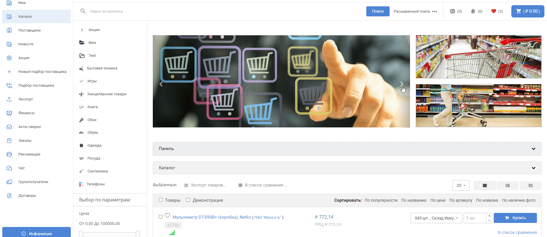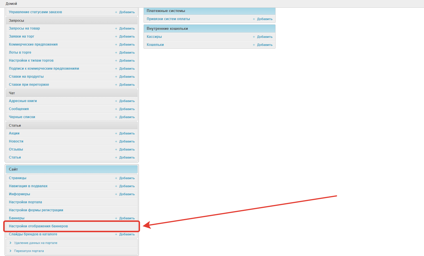Создание баннеровОсуществляется в административной панели проекта. После авторизации в панели администратора перейдите в раздел Баннеры, затем нажмите кнопку Добавить баннер: В открывшемся окне задайте условия отображения. Изображение — путь к файлу на локальном компьютере. Баннер слайдера — размер загруженного изображения, который будет отображаться в разделе Слайды. Верхний/нижний баннер — размер загруженного изображения для раздела Баннеры (верхний/нижний). URL адрес — заполняется, если баннер необходимо сделать кликабельным, при клике будет осуществляться переход на указанный URL-адрес. Идентификатор — уникальное значение для каждого баннера. Это значение нужно для верного хранения файла баннера на проекте и удобства управления настройкой отображения баннера в каталоге. Показывать (В слайдере/Вверху/Внизу) — чекбокс, в соответствии с которым задается логика показа баннеров. Категория — категория товаров, при переходе в которую будет отображаться данный баннер. Если категория товара не указана, то баннеры будут показаны на странице Каталог и Информация. Если категория товара указана, то баннер будет показан только на странице этой категории в Каталоге. После указания всех настроек нажмите кнопку Сохранить в нижней части страницы. Управление баннерамиВы можете видеть все настройки в сводной таблице, а также управлять, на каких страницах проекта будут отображаться баннеры, с помощью чекбоксов раздела Баннеры административной панели. ID — номер баннера. Идентификатор — присвоенное при создании значение для каждого баннера. URL адрес — ссылка, по которой будет совершен переход при клике по баннеру. Показывать в слайдере — баннер будет отображаться в слайдере. Показывать вверху — изображение отобразится вверху, справа от слайдера. Показывать внизу — изображение отобразится внизу, справа от слайдера. Категория — показывает, в какой категории каталога Agora будет отображаться баннер. При установленном Ничего баннер будет выведен в корень каталога. Закончив настройки, нажмите кнопку Сохранить. Есть возможность удалить один или несколько баннеров с помощью кнопки Удалить выбранные Баннеры. Настройки отображения баннеровВ этом разделе административной панели изменяется тип и способ вывода баннеров в каталоге. Выводить баннеры в каталогах — чекбокс включает/отключает баннеры во всех каталогах. Выводить баннеры на информационном дашборде — позволяет отображать баннеры в разделе Информация личного кабинета пользователя. Автоматическое пролистывание баннеров — при установленном чекбоксе изображения будут перелистываться автоматически. По завершении настроек Сохраните изменения. |