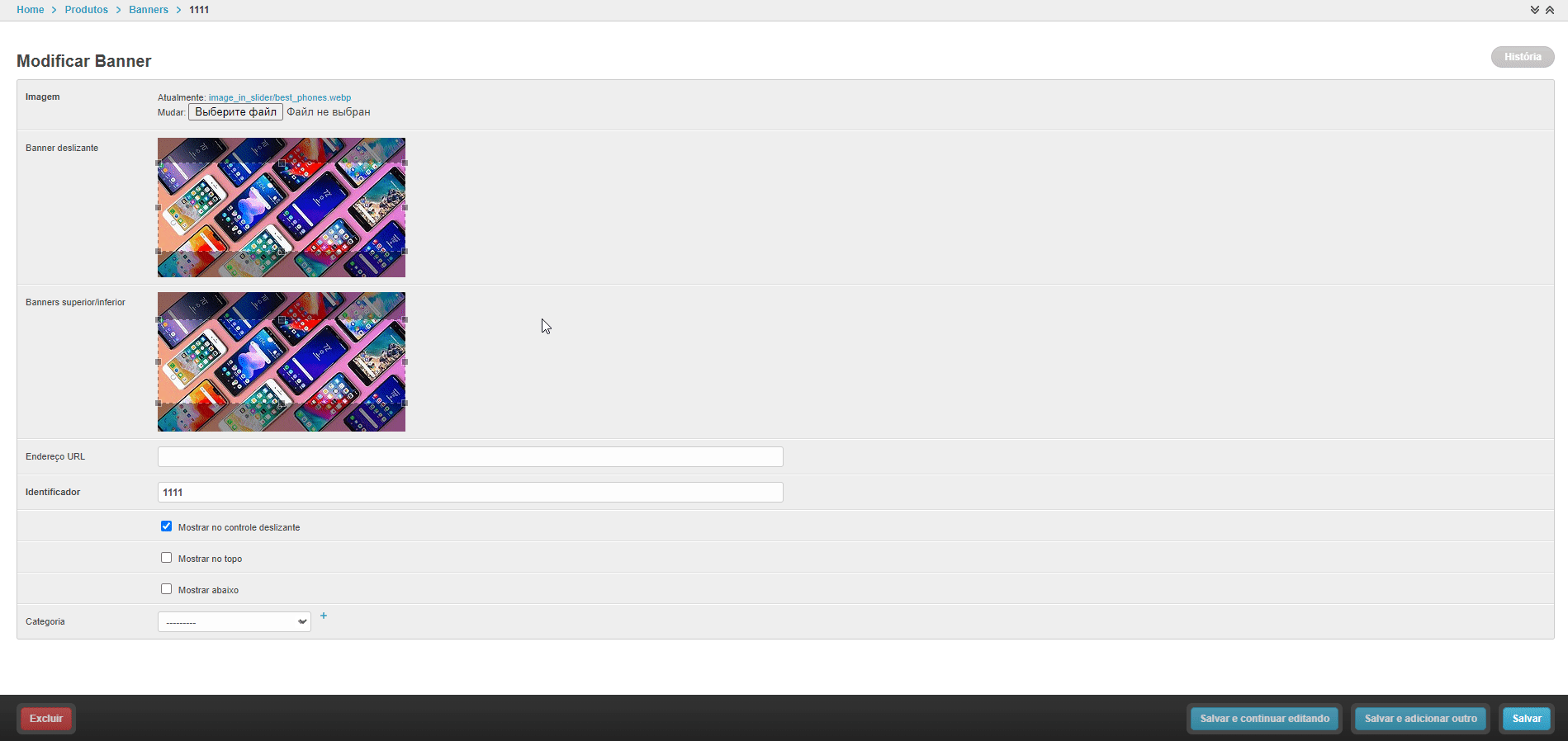 Slider de banner — permite especificar várias imagens que são invertidas automaticamente ou manualmente. Banner superior/inferior — uma imagem estática exibida sem efeitos. Para exibição correta, recomenda-se usar banners dos seguintes tamanhos: