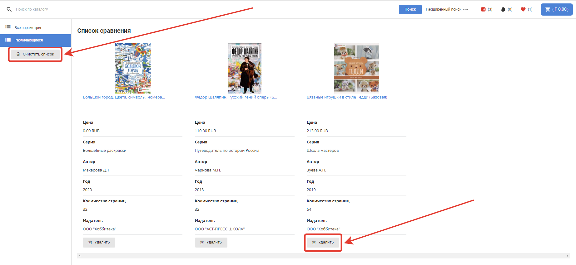 To add a product to the comparison list, click the In the comparison list button. If you want to add several products at once, you can select the products using the checkboxes and then click on the In the comparison list button at the top. To go to the comparison list, click on the icon . The page will display the products, and you can compare their characteristics. It is possible to compare both in all parameters, and in different ones. It is also possible to delete individual products and clear the entire comparison list. |