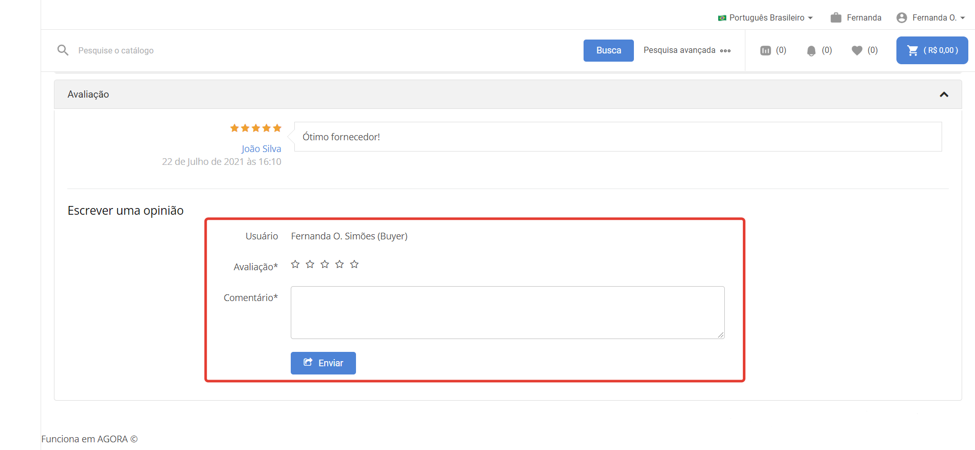 Ver classificação do fornecedorPara ver a classificação do fornecedor, o comprador deve ir até sua conta pessoal, abrir a seção Fornecedores, clicar no nome do fornecedor de interesse.