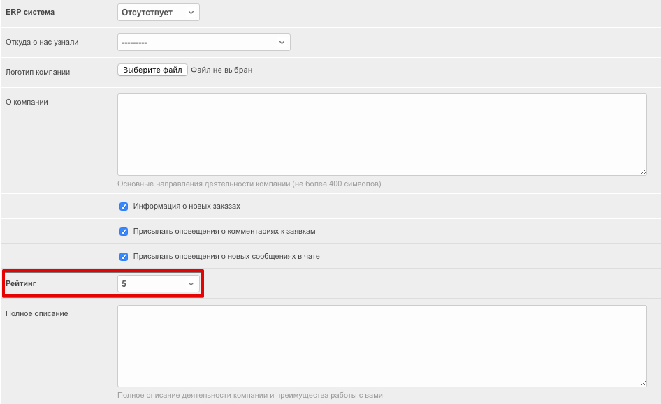 4. A classificação da empresa fornecedora também pode ser definida pelo administrador do Sistema no painel administrativo. Vá para a seção Fornecedores, selecione o fornecedor desejado clicando em seu nome, na janela que abre, vá até a seção Perfil do Fornecedor e encontre o campo Classificação. Neste campo, defina o valor de classificação de 1 a 5: 1 é 1 estrela, 5 - 5 estrelas. |