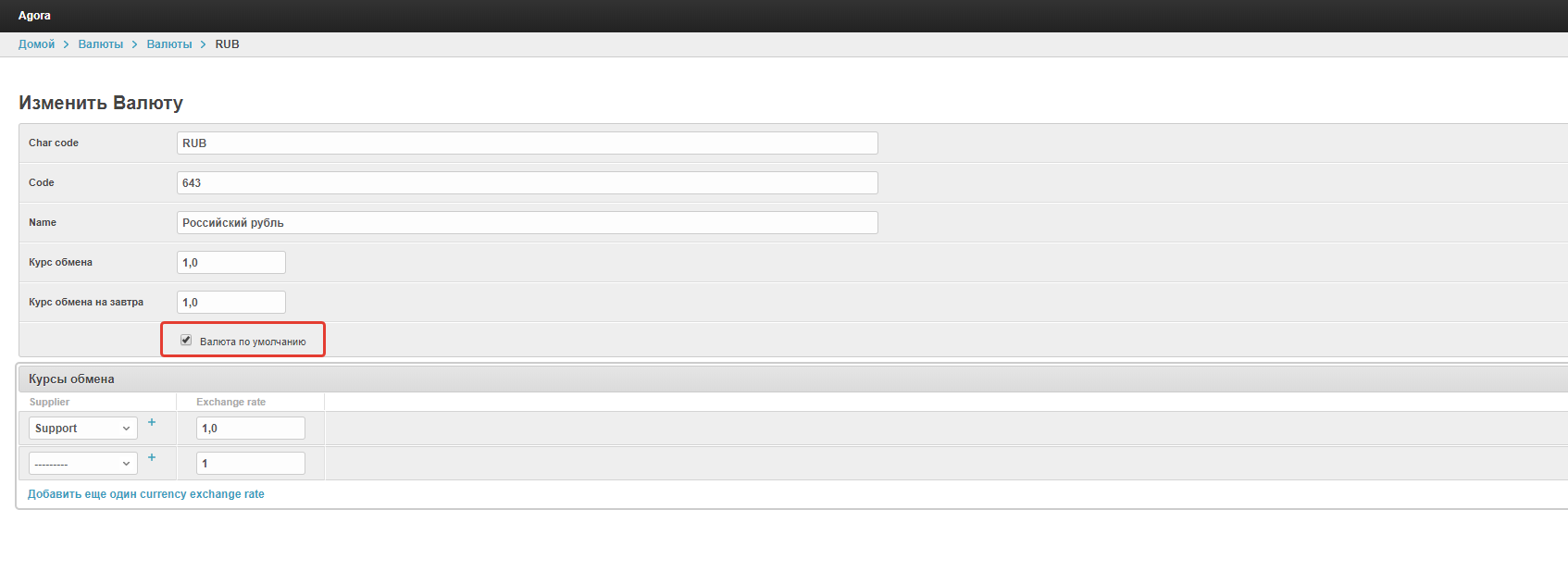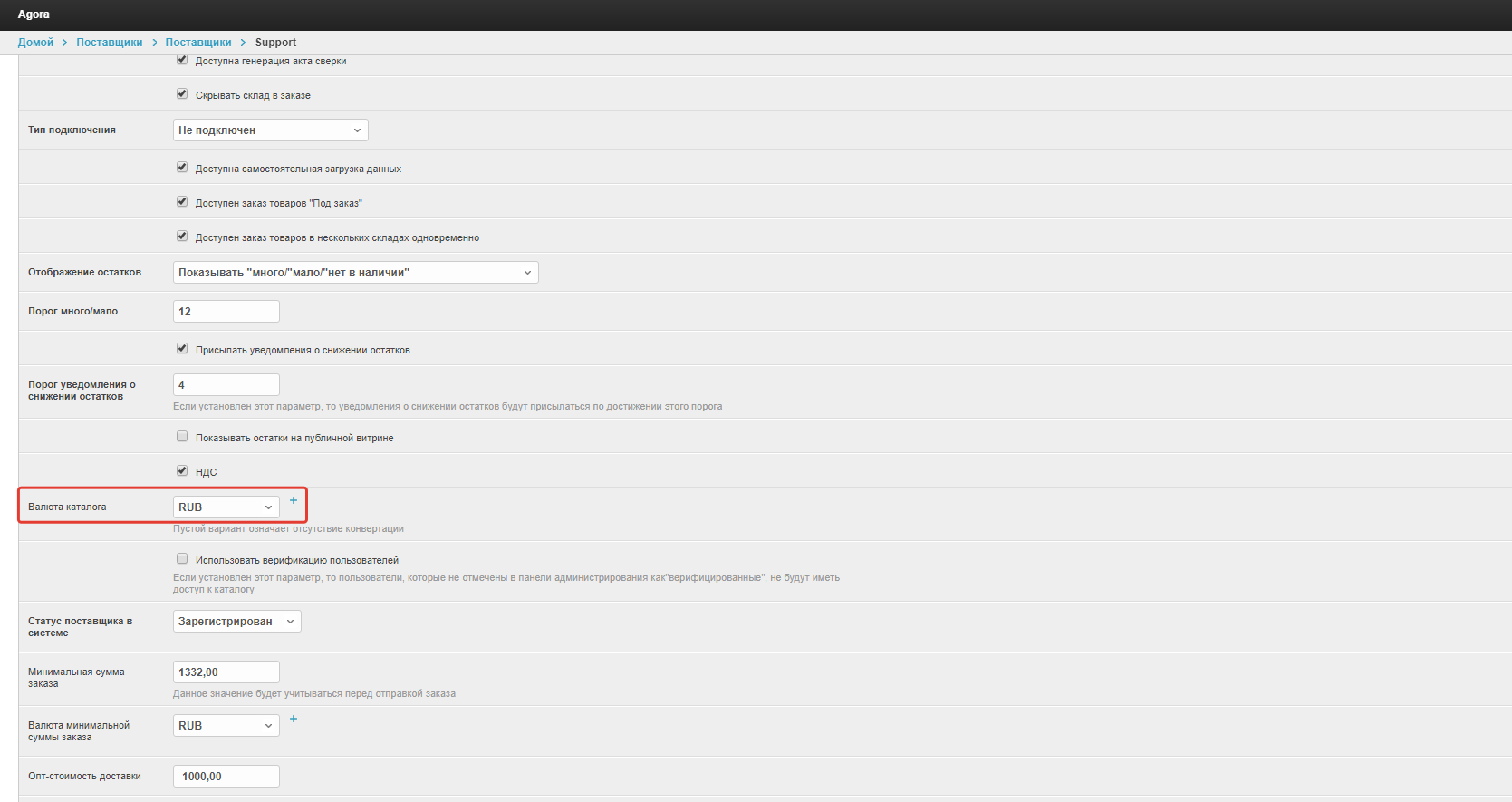 The currency for displaying the catalog on the portal is displayed according to the set of settings that are set. Currency receipt is determined sequentially in several ways. If one option is not executed, then it is tried to be obtained in the following way and so on. Methods of obtaining currency: 1. Currency from the contract between the supplier and the buyerIt is indicated in the "Buyers" section of the specific customer’s card in the "Agreement" field. 2. Field “Directory Currency” in the supplier’s settings.It is indicated in the "Suppliers" section of the supplier’s card in the "Catalog currency" field. 3. Under an active user agreement.It is indicated in the "Users" section of a specific user’s card in the "Active agreement" field. 4. Currency of the portal which is set by default.It is indicated in the "Currencies" section of the card for a specific currency in the checkbox "Default currency".