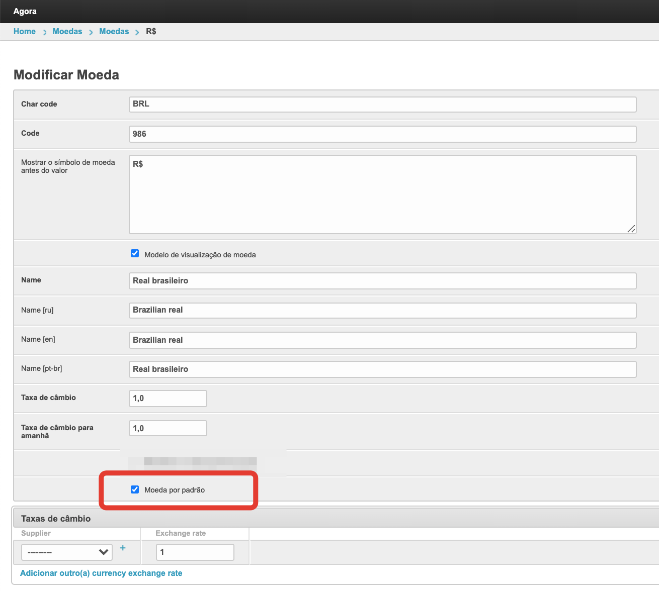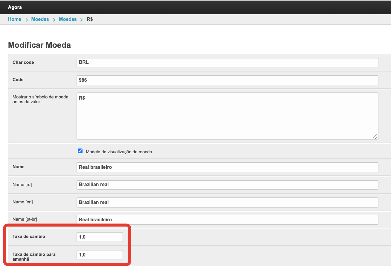 A taxa de conversão é definida na seção "Moedas" do cartão de uma determinada moeda nos campos "Taxa de câmbio" e "Taxa de Câmbio para amanhã". |