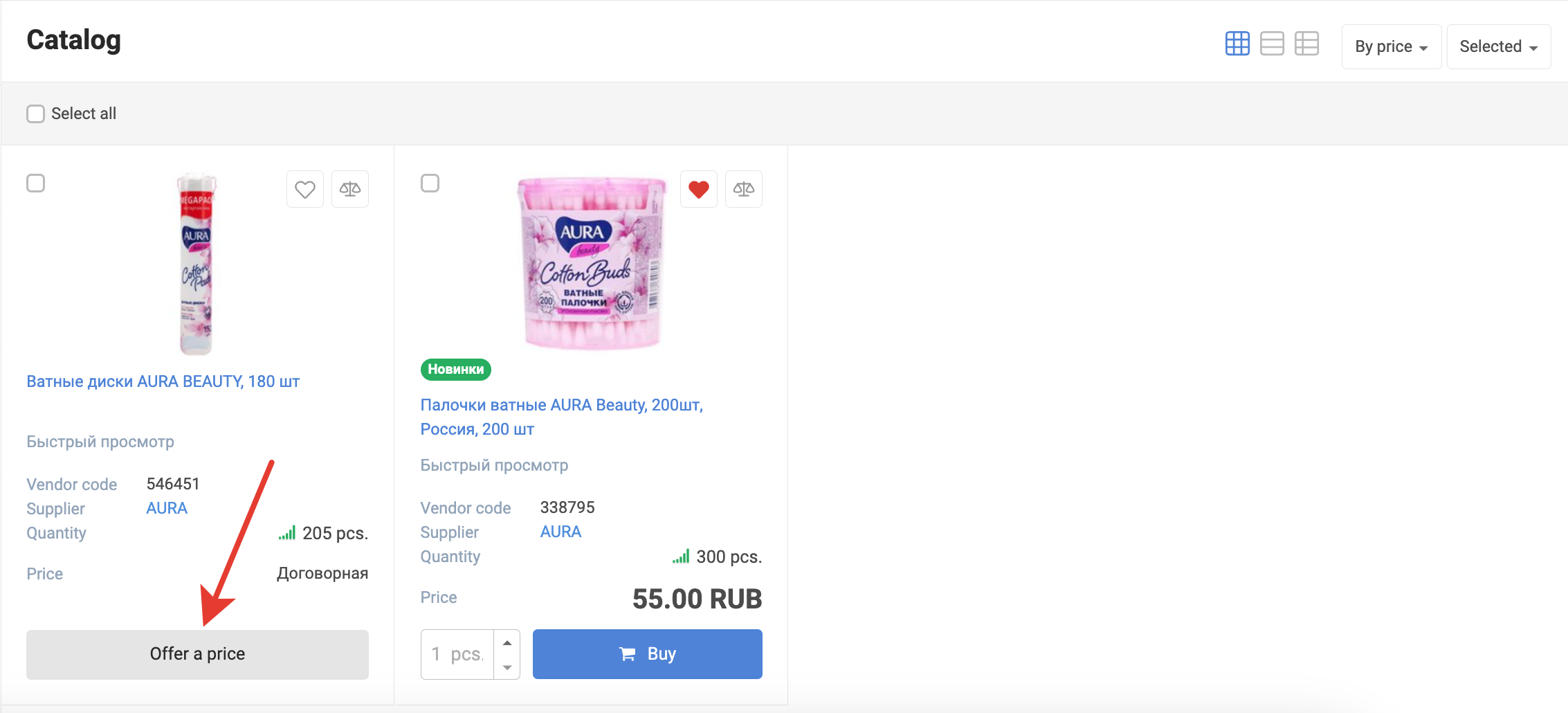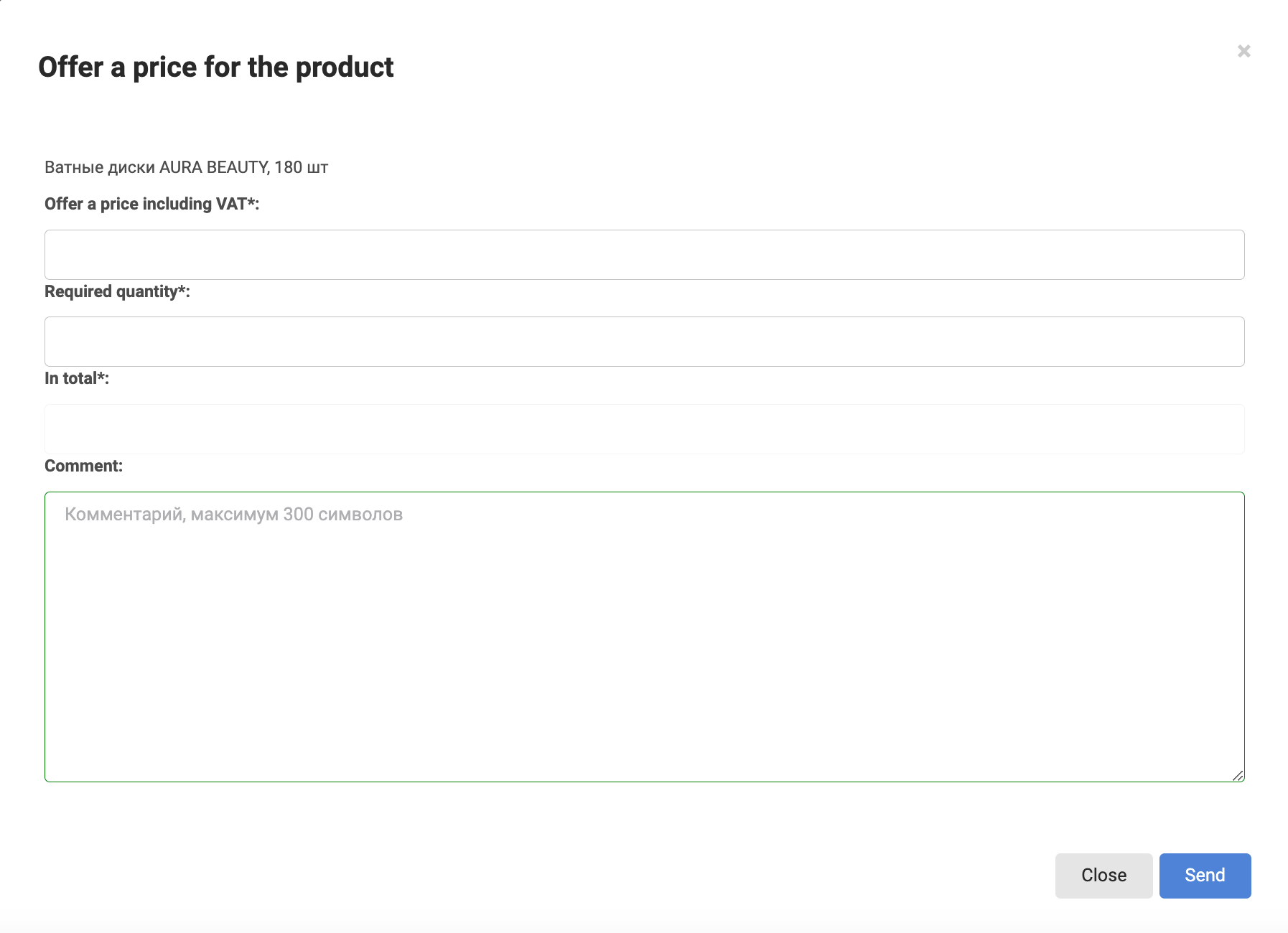 To find products with a bargain price, sort the catalog by price: from low to high. If a vendor has cataloged products with price offer, you'll see them first in the list. Then click the Offer a price button. You'll see a form in which you need to enter the price with VAT for which you are ready to buy the product and quanity of it. You can add a comment if needed. Сlick on the Send button — the supplier will receive an email notification with your proposal. In the course of further correspondence with the supplier, you will be able to discuss the terms of the purchase and the method of placing the order. |