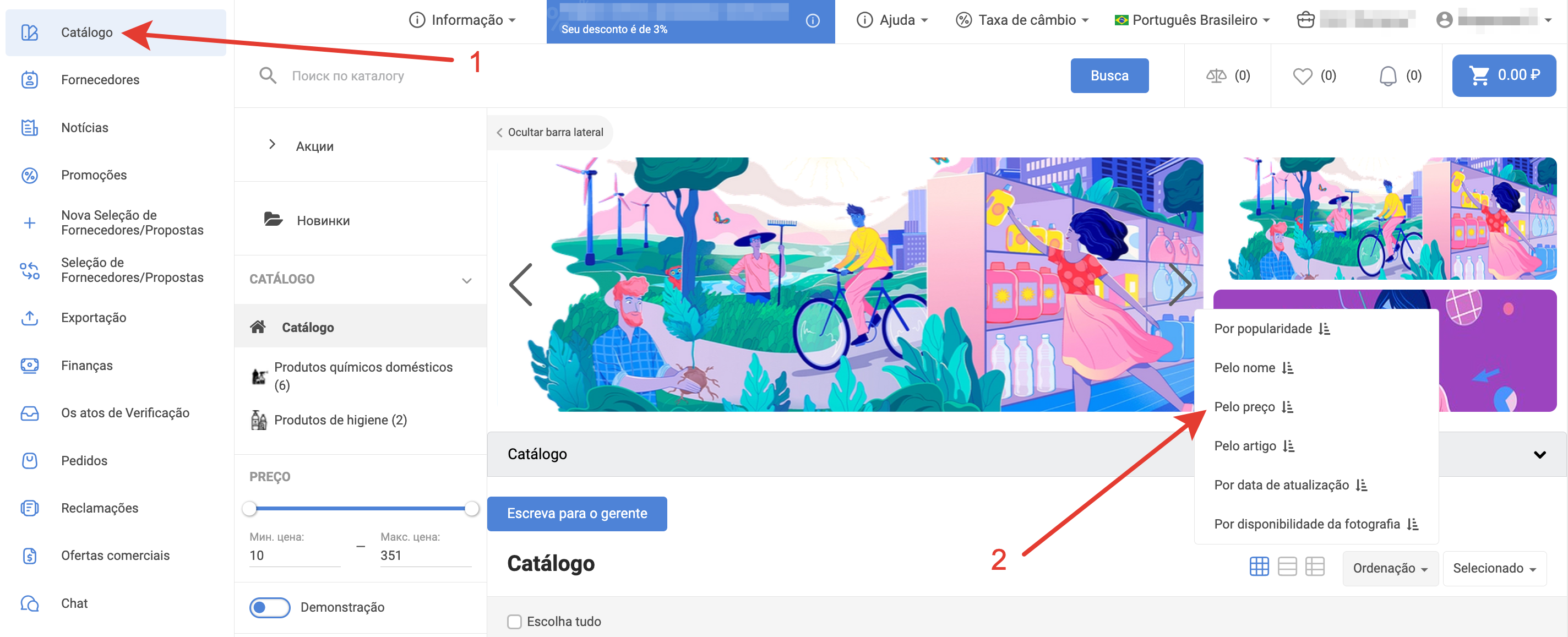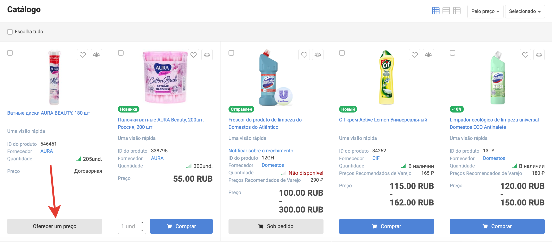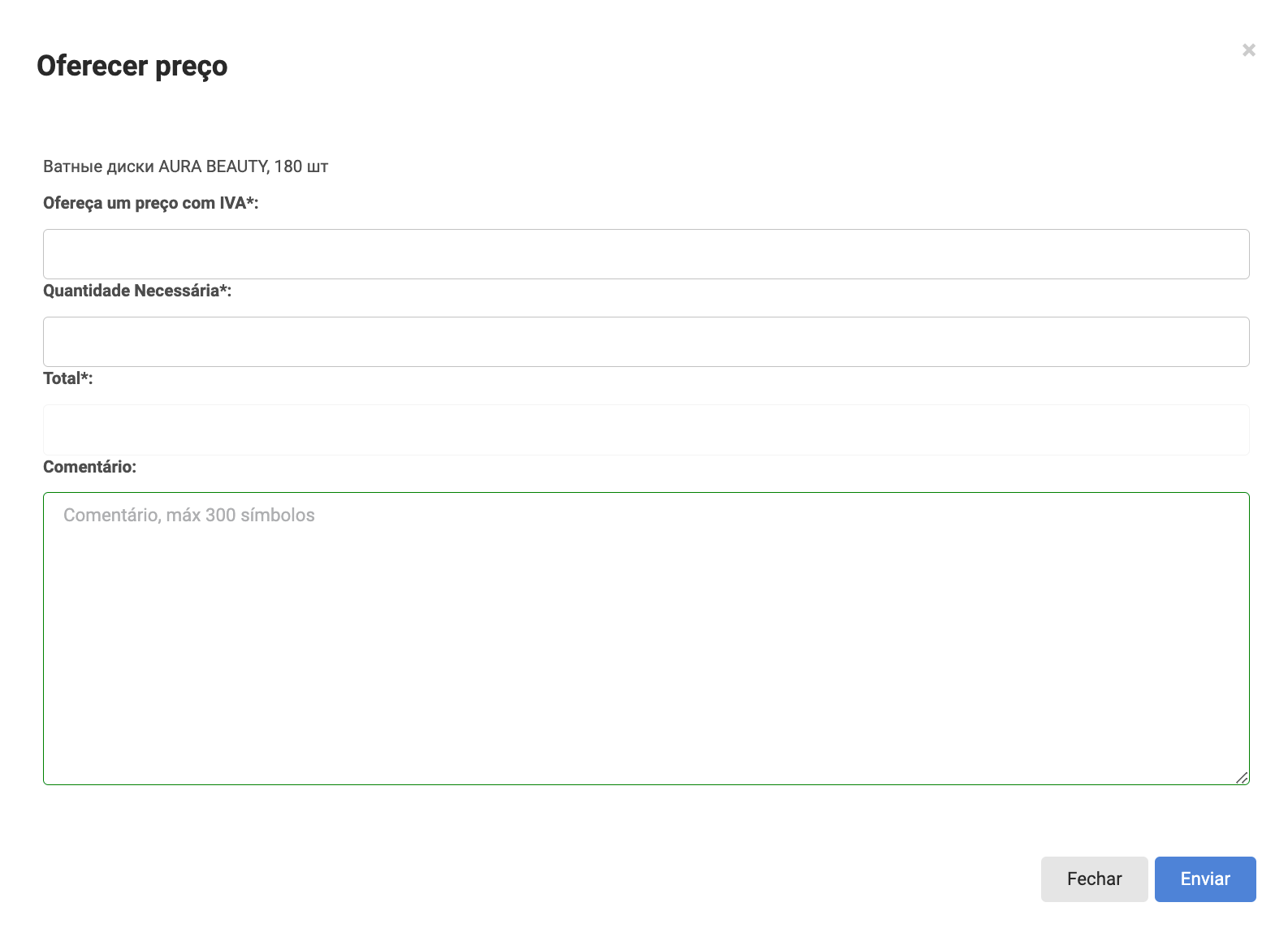 Para encontrar produtos com um preço negociado, ordenar o catálogo por preço ascendente. Se um fornecedor adicionado produtos com a capacidade de oferecer um preço no catálogo, você irá vê-los primeiro na lista. Depois de clicar no botão Oferecer um preço, aparecerá no ecrã um formulário no qual necessita de especificar o preço do IVA para o qual estará pronto para comprar os bens e a quantidade necessária. Adicione um comentário, se necessário. Em seguida, clique no botão Enviar — o fornecedor receberá uma notificação por e-mail com a sua oferta. Durante a correspondência subsequente com o fornecedor, você poderá discutir os termos da compra e o método de fazer o pedido. |