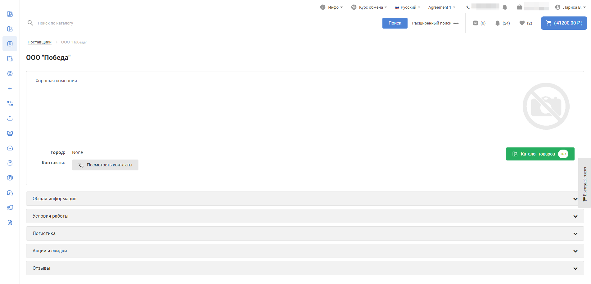 To open this section, in the buyer's personal account located at project_name.agora.ru, select Suppliers. A list of suppliers will open, which can be filtered by name, company class, country, city. After clicking on the View Contacts (1) button - the contact information of the supplier will open: city, phone, e-mail and website. After clicking on the button Catalog (2) of goods - a catalog with the goods of a specific supplier will open. By clicking on the name of the supplier, you can view general information, conditions of work with the supplier, logistics, reviews, promotions and discounts (information is entered in the administrative panel in the Suppliers section). Each supplier can be rated in the Reviews section (on request, this functionality can be disabled). |