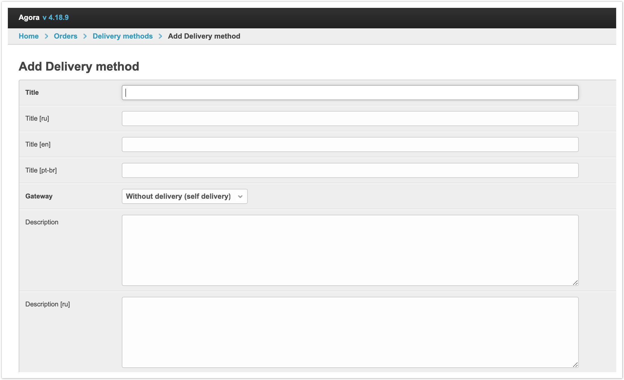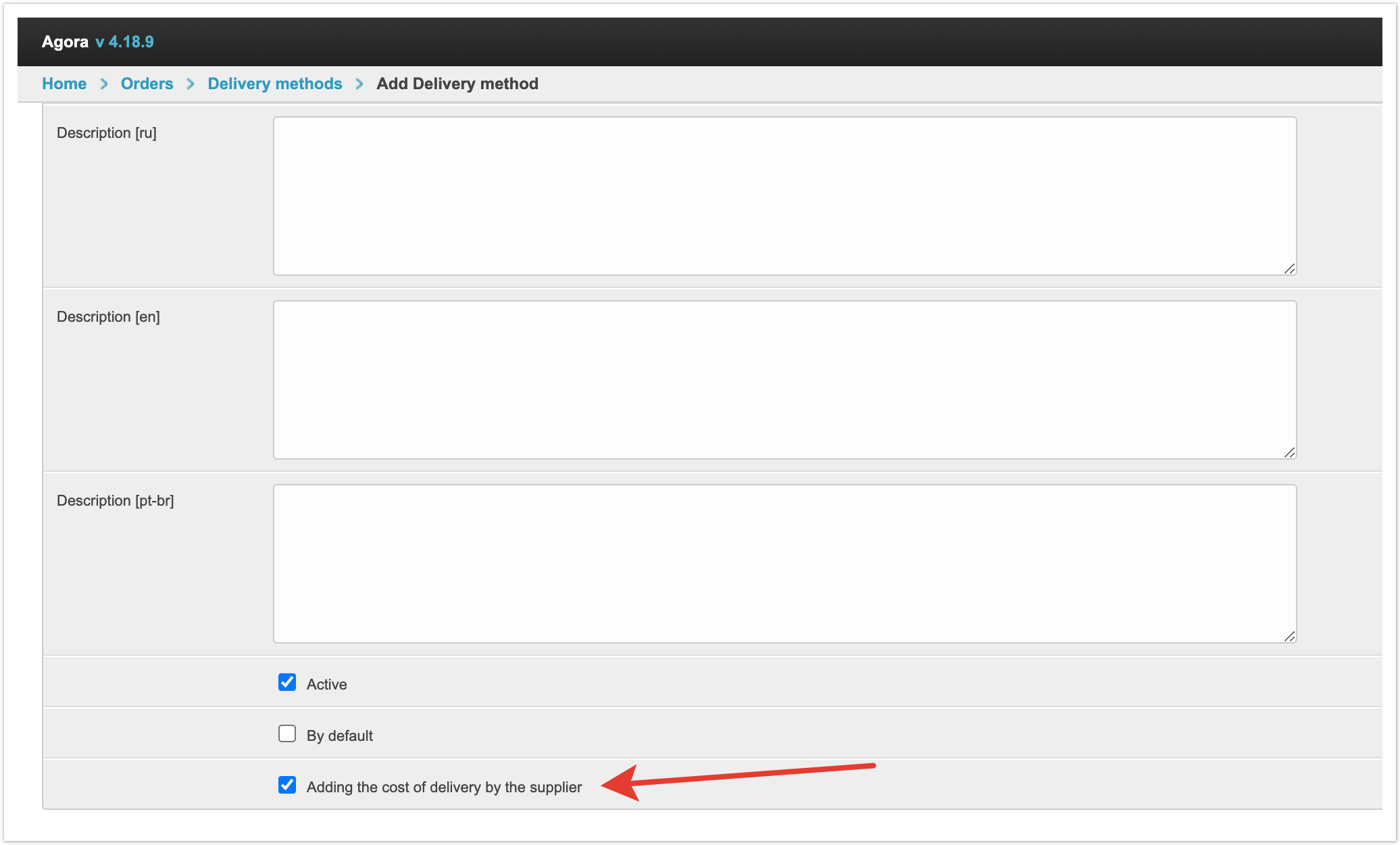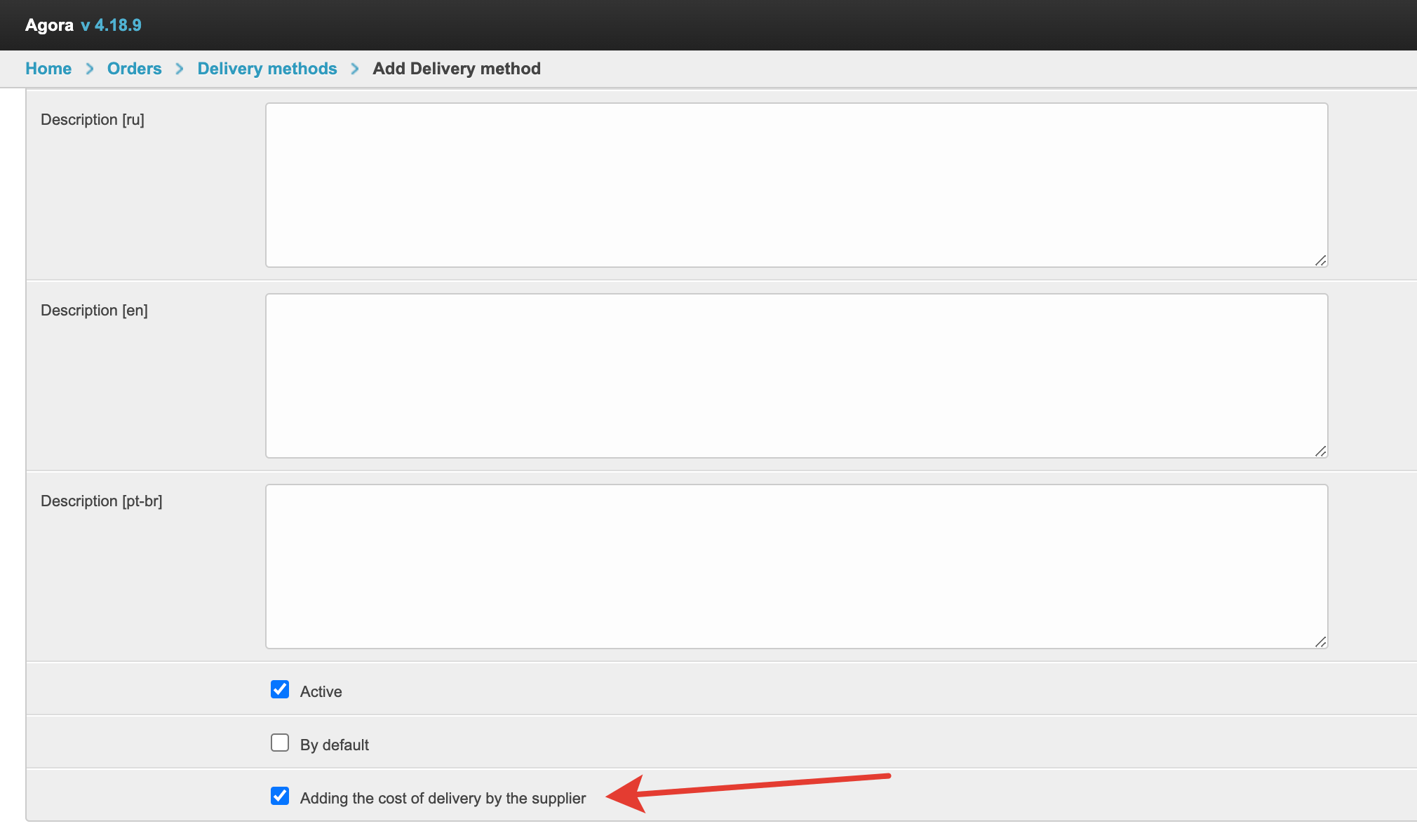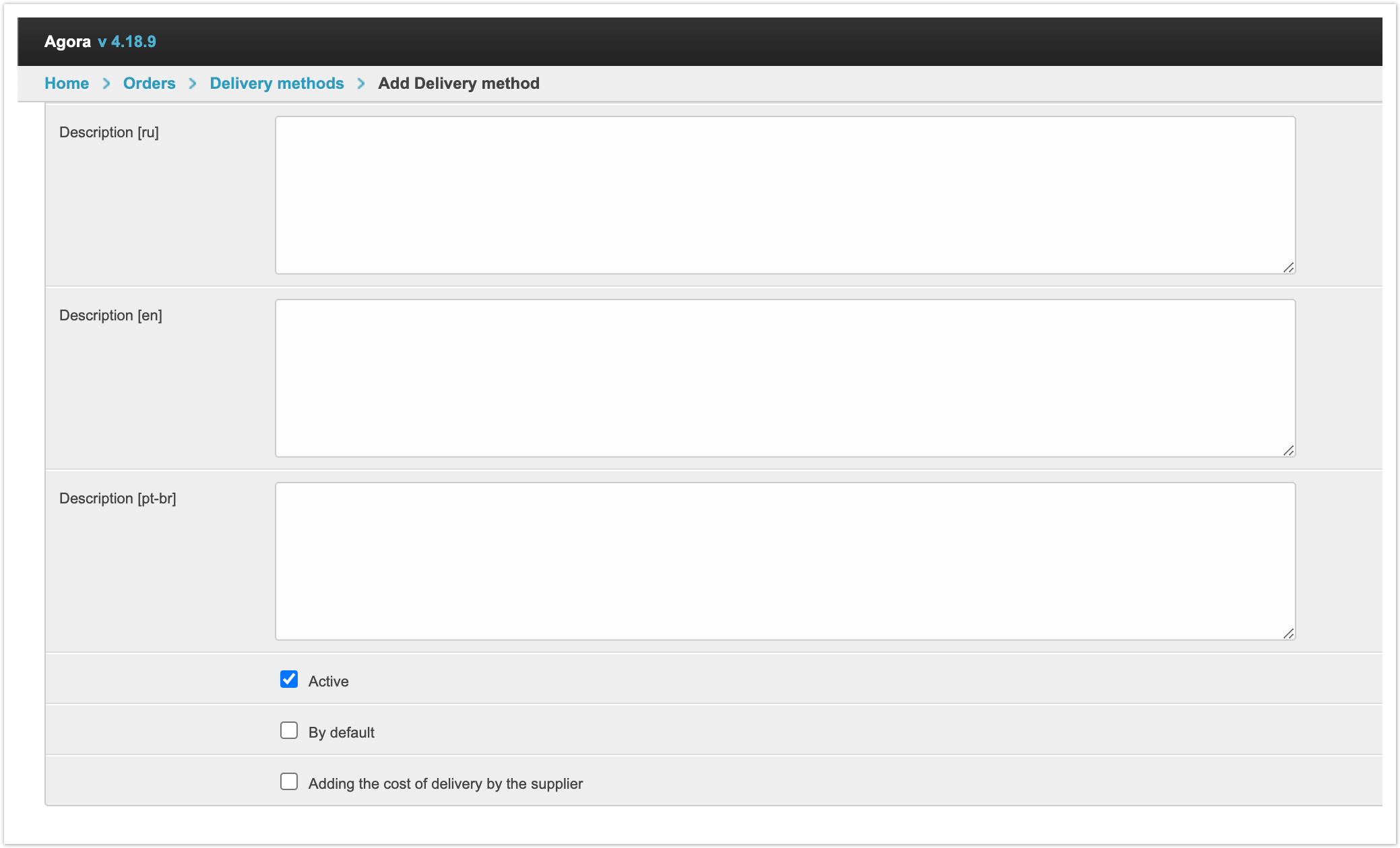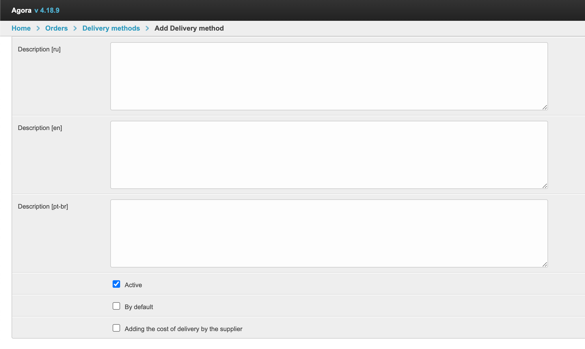 Selecting a shipping method in the shopping cartIf the project uses several delivery methods and their choice is available to the buyer, then the selection field will be displayed in the shopping cart when placing an order. Next, let's look at the process of setting up shipping methods. Adding a Shipping MethodThere is a separate section in the admin panel to set up Delivery Methods. Inside the section, you can see previously entered delivery methods and their status. The Active column allows you to understand which delivery methods are currently used on the platform when placing an order. The By default column indicates which of the shipping methods will be selected in the cart by default. If you need to delete a delivery method, just select it, and then select Delete selected delivery methods from the drop-down list at the bottom left. Also on the page there is a button Add Delivery Method for setting up a new shipping method. After clicking on it, the add form will open. Here you need to fill in the Title. It will be displayed to the buyer when placing an order. The title can be specified in different languages for platforms using multilingualism. The Gateway field is required. It has 4 values: Without delivery(self delivery), CDEK, Catapult and Other. The CDEK and Catapult options are used to set up integration with delivery calculation services. The option Without delivery is used for pickup. If none of the described options is suitable, then you can select the Other value. Below, a field is displayed for specifying the Description also in several languages, if multilingualism is enabled. Description can be used for additional explanations. Then we check that the Active setting is enabled so that this delivery method can be used to place an order. You can also enable the By default setting, then this shipping method will be set by default when placing an order. For correct operation, it is better to choose one default shipping method. After all the required data has been filled in, you need to click on the Save button and the delivery method will be added. Adding shipping costs by the supplierWhen setting up a shipping method, there is also a setting Adding the cost of delivery by the supplier. This setting allows the supplier to independently add shipping costs to the order. In order for the functionality to work in the supplier settings in the admin panel, you must also enable Add the shipping cost setting. After enabling these settings, a separate field will appear in the supplier's personal account in the order card to indicate the cost of delivery for each individual item. The shipping cost will be added to the order amount, and the buyer will see it and be able to pay. This functionality allows you to add shipping costs to the order amount and make it more convenient for the buyer to pay. Integration with logistics servicesFor delivery methods, there are ready-made integrations with CDEK and Catapult. If necessary, integration with other logistics services can be configured as an individual solution. Integration with CDEK works in such a way that after placing an order, the buyer will be redirected to the page of the CDEK service to arrange delivery. Integration with Catapulto works in a similar way. After placing an order, the buyer will see a shipping calculation form, where they will need to fill in the shipping and receiving address, as well as the type of shipment. Next, fill in the parameters for size, weight and additional settings. After clicking on the calculation button, all available delivery options and their cost will be offered. You can choose any suitable option. In more detail, the work of Catapulto with is described on the page.