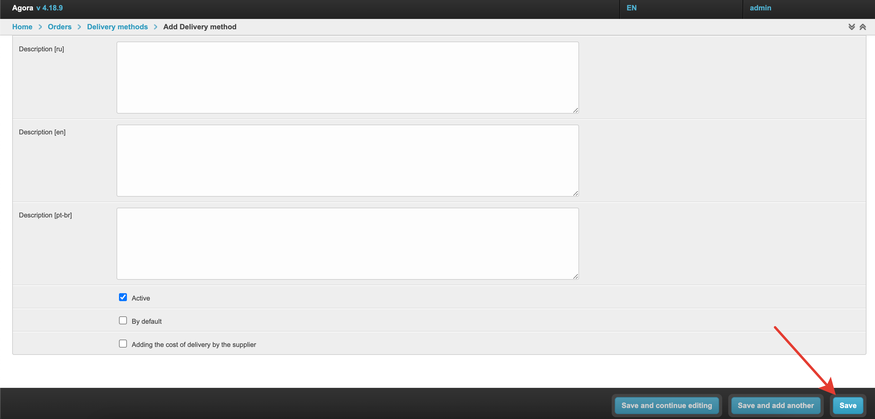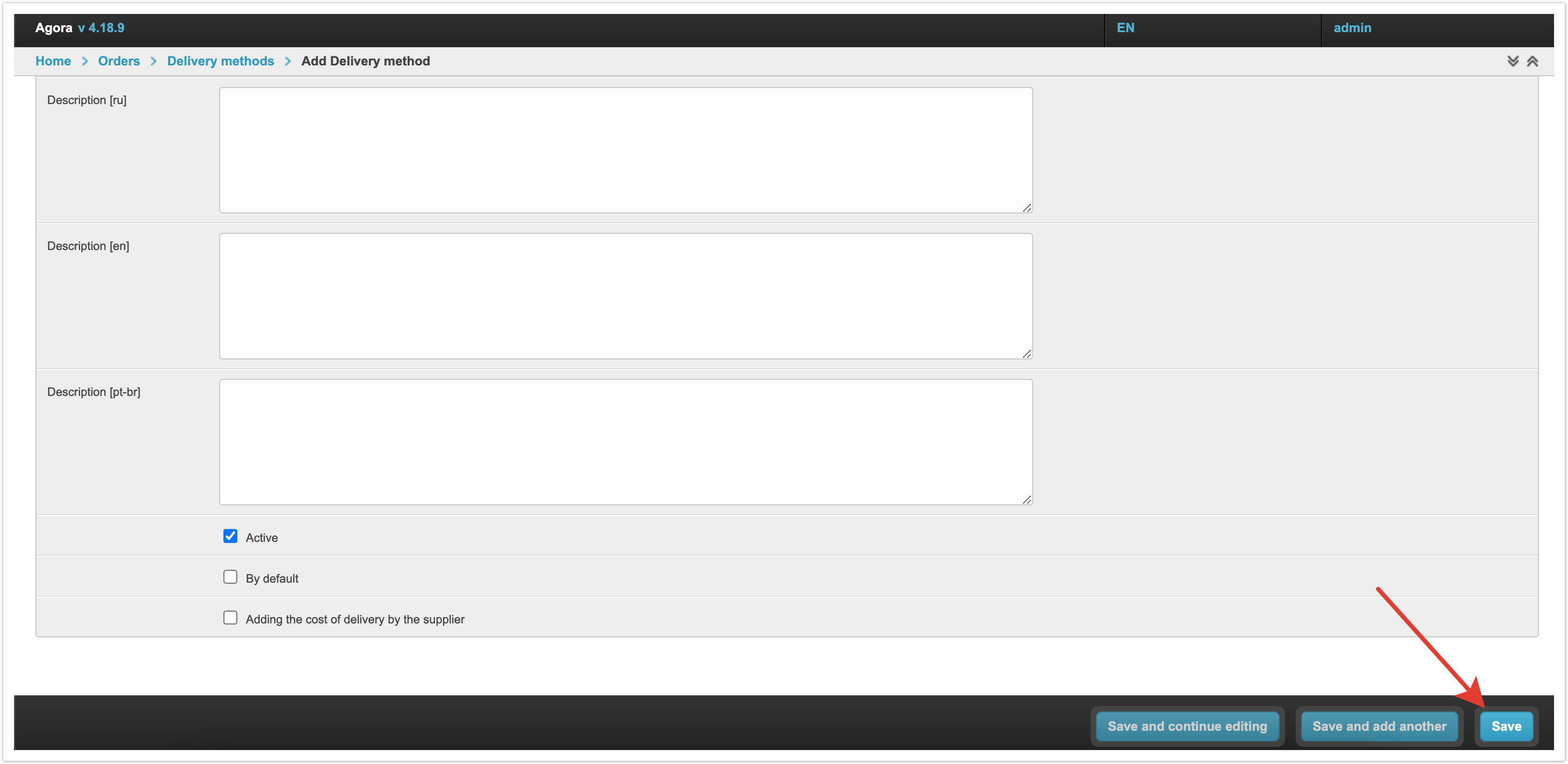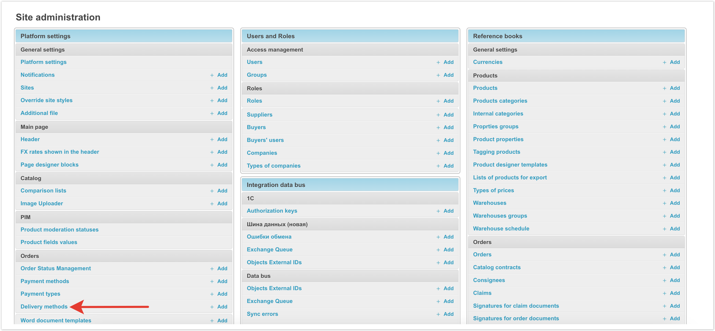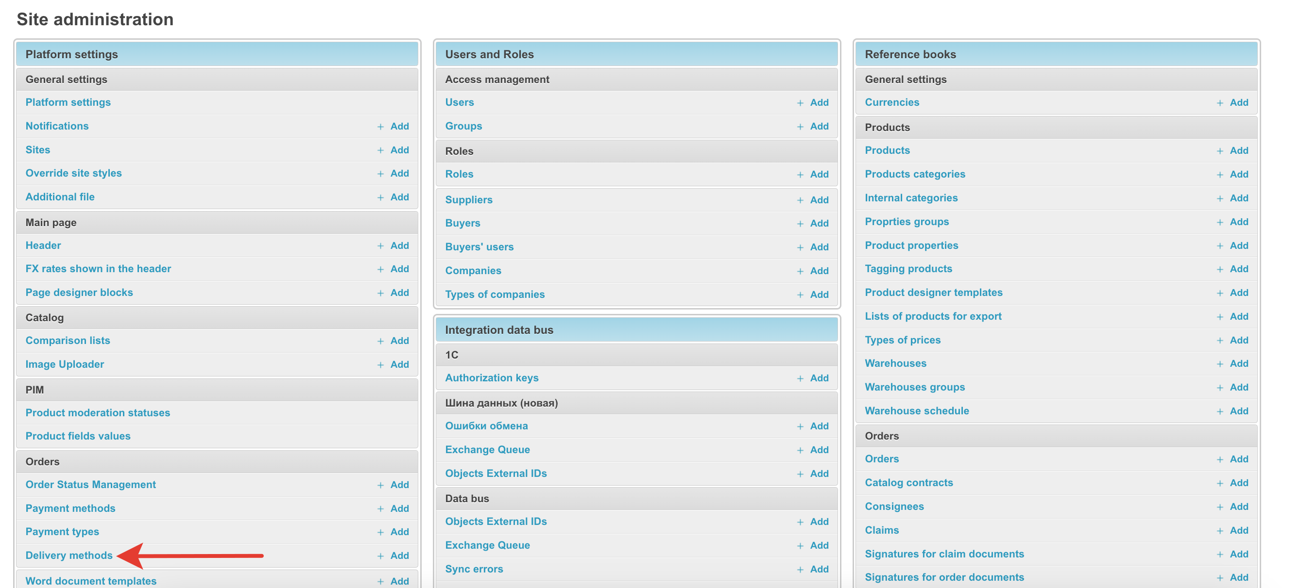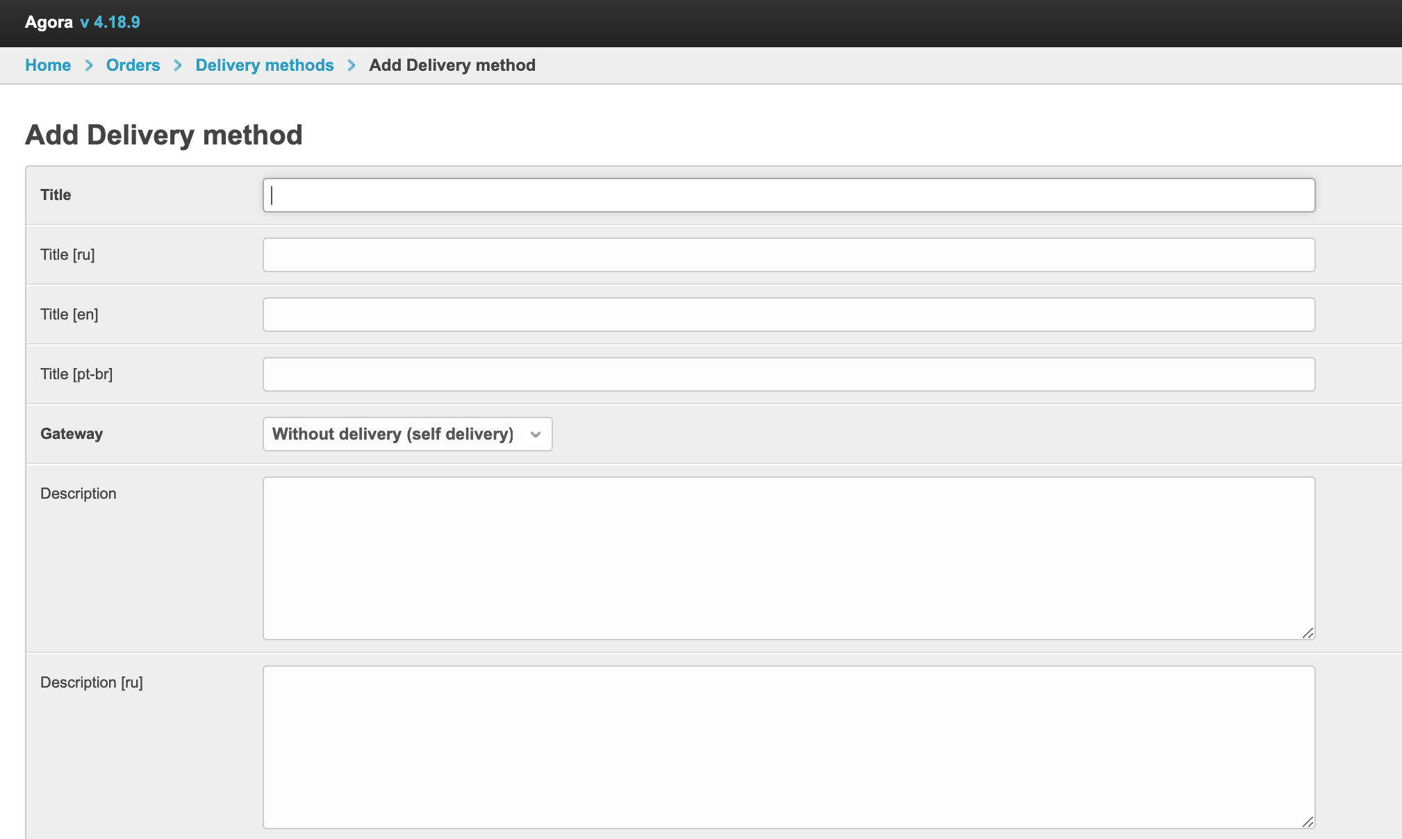 Selecting a shipping method in the shopping cartIf the project uses several delivery methods and their choice is available to the buyer, then the selection field will be displayed in the shopping cart when placing an order. Next, let's look at the process of setting up shipping methods. Adding a Shipping MethodThere is a separate section in the admin panel to set up Delivery Methods. Inside the section, you can see previously entered delivery methods and their status. The Active column allows you to understand which delivery methods are currently used on the platform when placing an order. The By default column indicates which of the shipping methods will be selected in the cart by default. If you need to delete a delivery method, just select it, and then select Delete selected delivery methods from the drop-down list at the bottom left. Also on the page there is a button Add Delivery Method for setting up a new shipping method. After clicking on it, the add form will open. Here you need to fill in the Title. It will be displayed to the buyer when placing an order. The title can be specified in different languages for platforms using multilingualism. The Gateway field is required. It has 4 values: Without delivery(self delivery), CDEK, Catapult and Other. The CDEK and Catapult options are used to set up integration with delivery calculation services. The option Without delivery is used for pickup. If none of the described options is suitable, then you can select the Other value. Below, a field is displayed for specifying the Description also in several languages, if multilingualism is enabled. Description can be used for additional explanations. Then we check that the Active setting is enabled so that this delivery method can be used to place an order. You can also enable the By default setting, then this shipping method will be set by default when placing an order. For correct operation, it is better to choose one default shipping method. After all the required data has been filled in, you need to click on the Save button and the delivery method will be added. Adding shipping costs by the supplierWhen setting up a shipping method, there is also a setting Adding the cost of delivery by the supplier. This setting allows the supplier to independently add shipping costs to the order. In order for the functionality to work in the supplier settings in the admin panel, you must also enable Add the shipping cost setting. After enabling these settings, a separate field will appear in the supplier's personal account in the order card to indicate the cost of delivery for each individual item. The shipping cost will be added to the order amount, and the buyer will see it and be able to pay. This functionality allows you to add shipping costs to the order amount and make it more convenient for the buyer to pay. Integration with logistics servicesFor delivery methods, there are ready-made integrations with CDEK and Catapult. If necessary, integration with other logistics services can be configured as an individual solution. Integration with CDEK works in such a way that after placing an order, the buyer will be redirected to the page of the CDEK service to arrange delivery. Integration with Catapulto works in a similar way. After placing an order, the buyer will see a shipping calculation form, where they will need to fill in the shipping and receiving address, as well as the type of shipment. Next, fill in the parameters for size, weight and additional settings. After clicking on the calculation button, all available delivery options and their cost will be offered. You can choose any suitable option. In more detail, the work of Catapulto with is described on the page.
