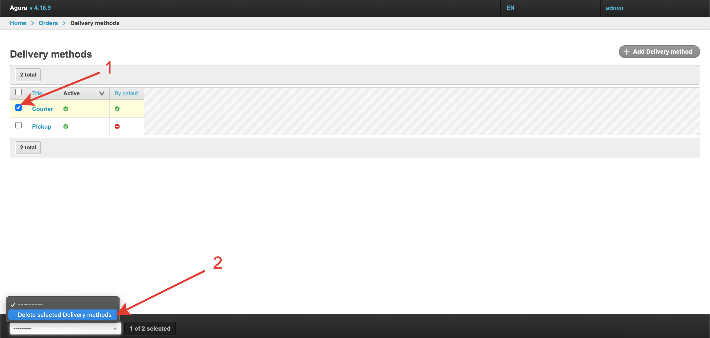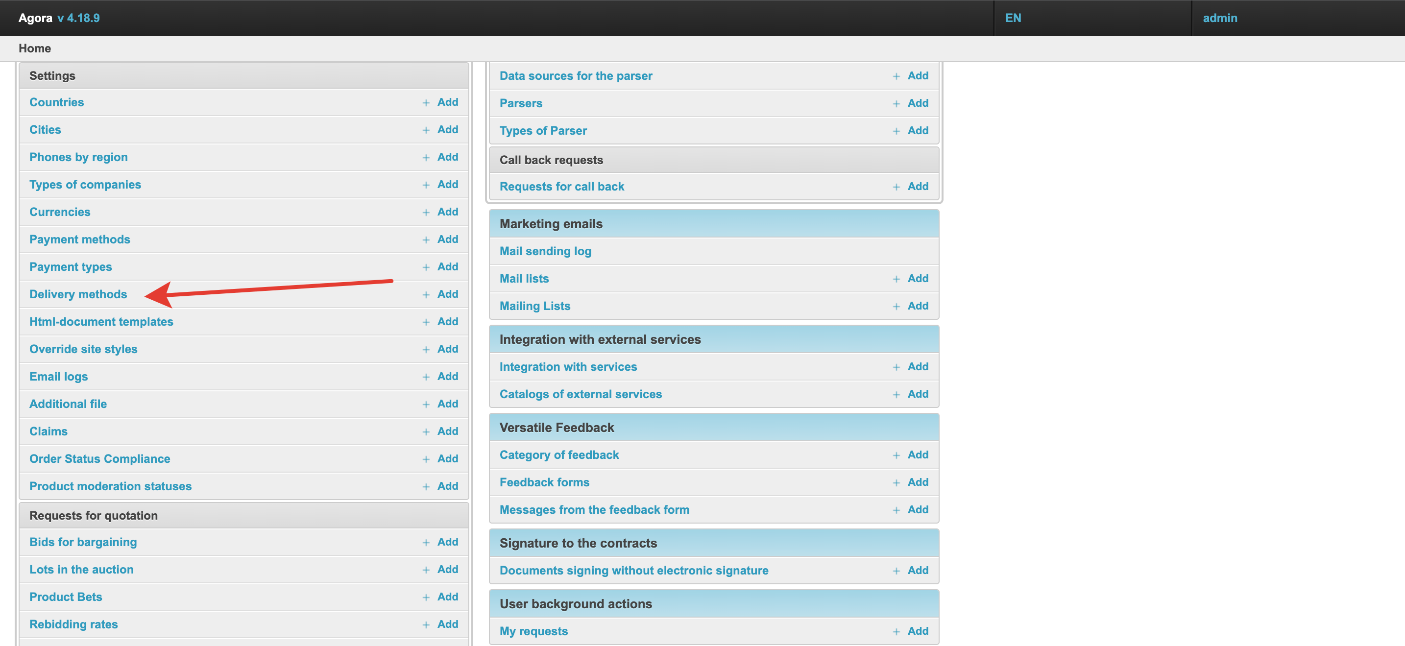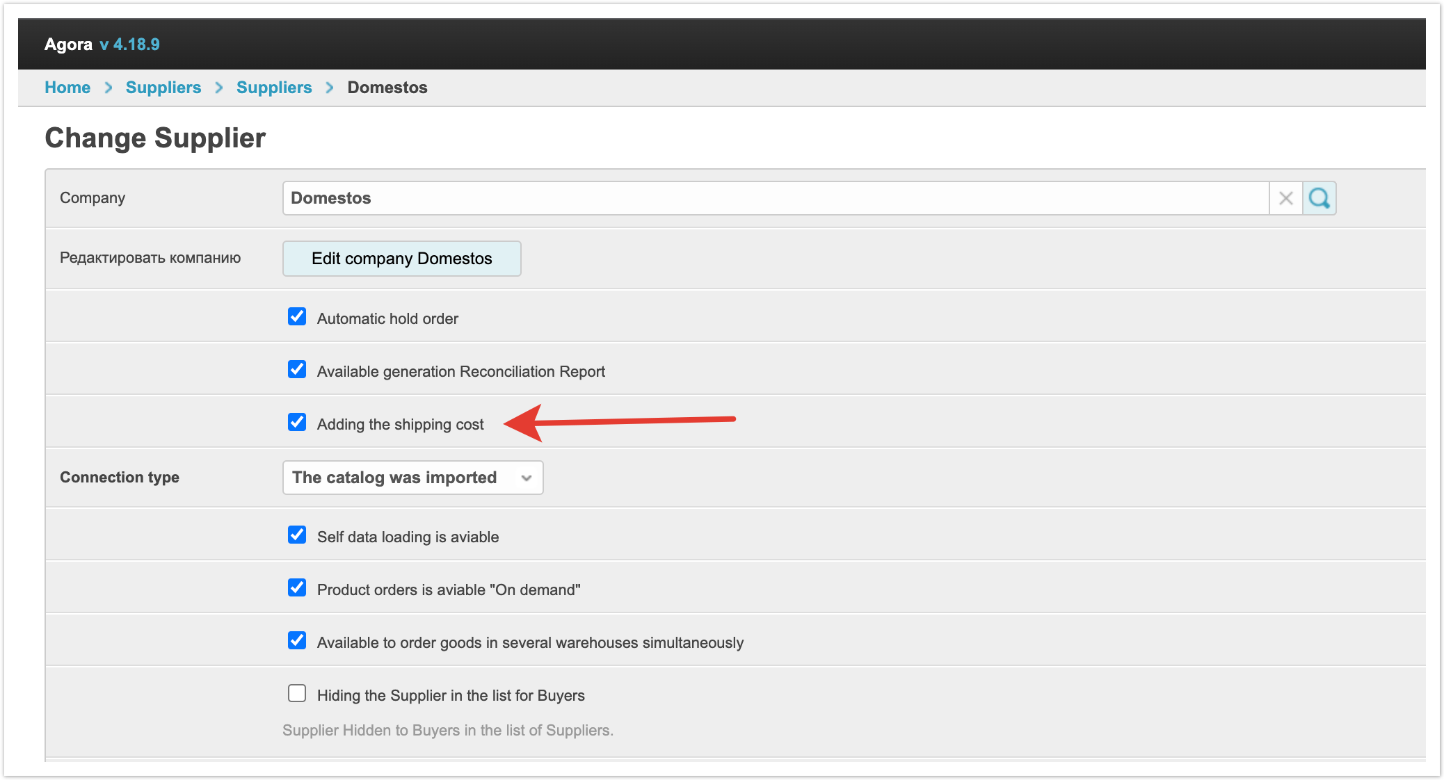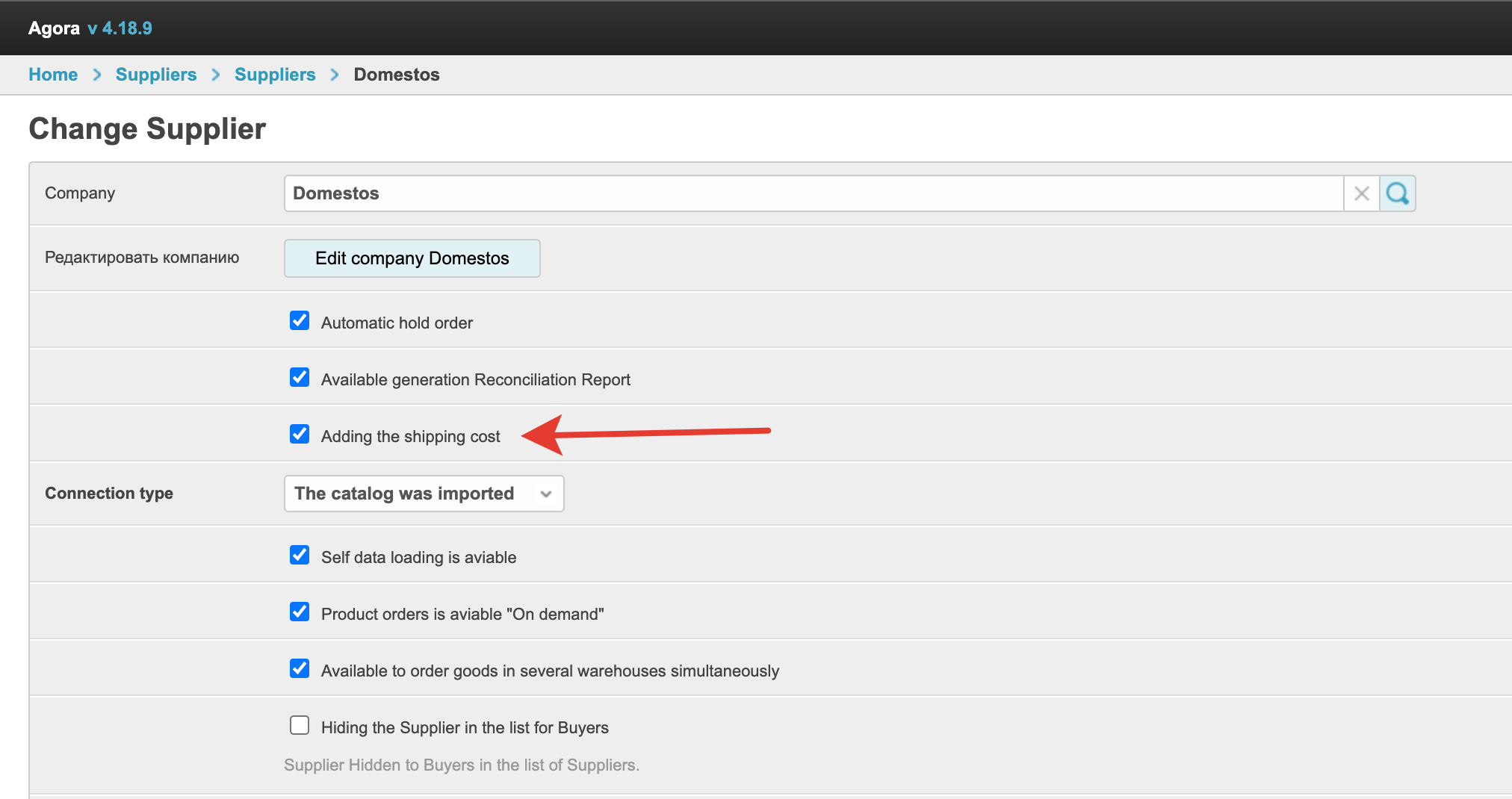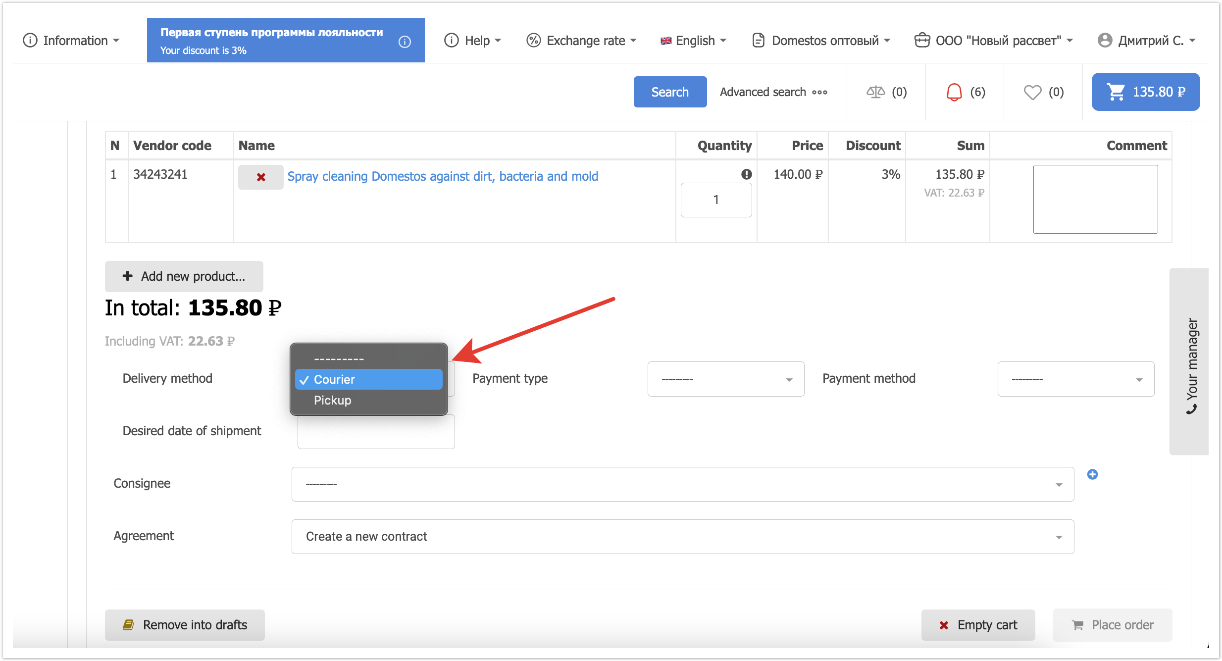Selecting a shipping method in the shopping cartIf the project uses several delivery methods and their choice is available to the buyer, then the selection field will be displayed in the shopping cart when placing an order. Next, let's look at the process of setting up shipping methods. Adding a Shipping MethodThere is a separate section in the admin panel to set up Delivery Methods. Inside the section, you can see previously entered delivery methods and their status. The Active column allows you to understand which delivery methods are currently used on the platform when placing an order. The By default column indicates which of the shipping methods will be selected in the cart by default. If you need to delete a delivery method, just select it, and then select Delete selected delivery methods from the drop-down list at the bottom left. Also on the page there is a button Add Delivery Method for setting up a new shipping method. After clicking on it, the add form will open. Here you need to fill in the Title. It will be displayed to the buyer when placing an order. The title can be specified in different languages for platforms using multilingualism. The Gateway field is required. It has 4 values: Without delivery(self delivery), CDEK, Catapult and Other. The CDEK and Catapult options are used to set up integration with delivery calculation services. The option Without delivery is used for pickup. If none of the described options is suitable, then you can select the Other value. Below, a field is displayed for specifying the Description also in several languages, if multilingualism is enabled. Description can be used for additional explanations. Then we check that the Active setting is enabled so that this delivery method can be used to place an order. You can also enable the By default setting, then this shipping method will be set by default when placing an order. For correct operation, it is better to choose one default shipping method. After all the required data has been filled in, you need to click on the Save button and the delivery method will be added. Adding shipping costs by the supplierWhen setting up a shipping method, there is also a setting Adding the cost of delivery by the supplier. This setting allows the supplier to independently add shipping costs to the order. In order for the functionality to work in the supplier settings in the admin panel, you must also enable Add the shipping cost setting. After enabling these settings, a separate field will appear in the supplier's personal account in the order card to indicate the cost of delivery for each individual item. The shipping cost will be added to the order amount, and the buyer will see it and be able to pay. This functionality allows you to add shipping costs to the order amount and make it more convenient for the buyer to pay. Integration with logistics servicesFor delivery methods, there are ready-made integrations with CDEK and Catapult. If necessary, integration with other logistics services can be configured as an individual solution. Integration with CDEK works in such a way that after placing an order, the buyer will be redirected to the page of the CDEK service to arrange delivery. Integration with Catapulto works in a similar way. After placing an order, the buyer will see a shipping calculation form, where they will need to fill in the shipping and receiving address, as well as the type of shipment. Next, fill in the parameters for size, weight and additional settings. After clicking on the calculation button, all available delivery options and their cost will be offered. You can choose any suitable option. In more detail, the work of Catapulto with is described on the page.