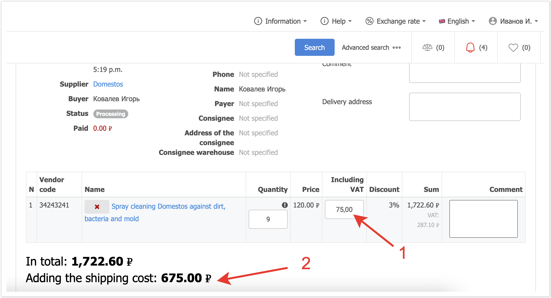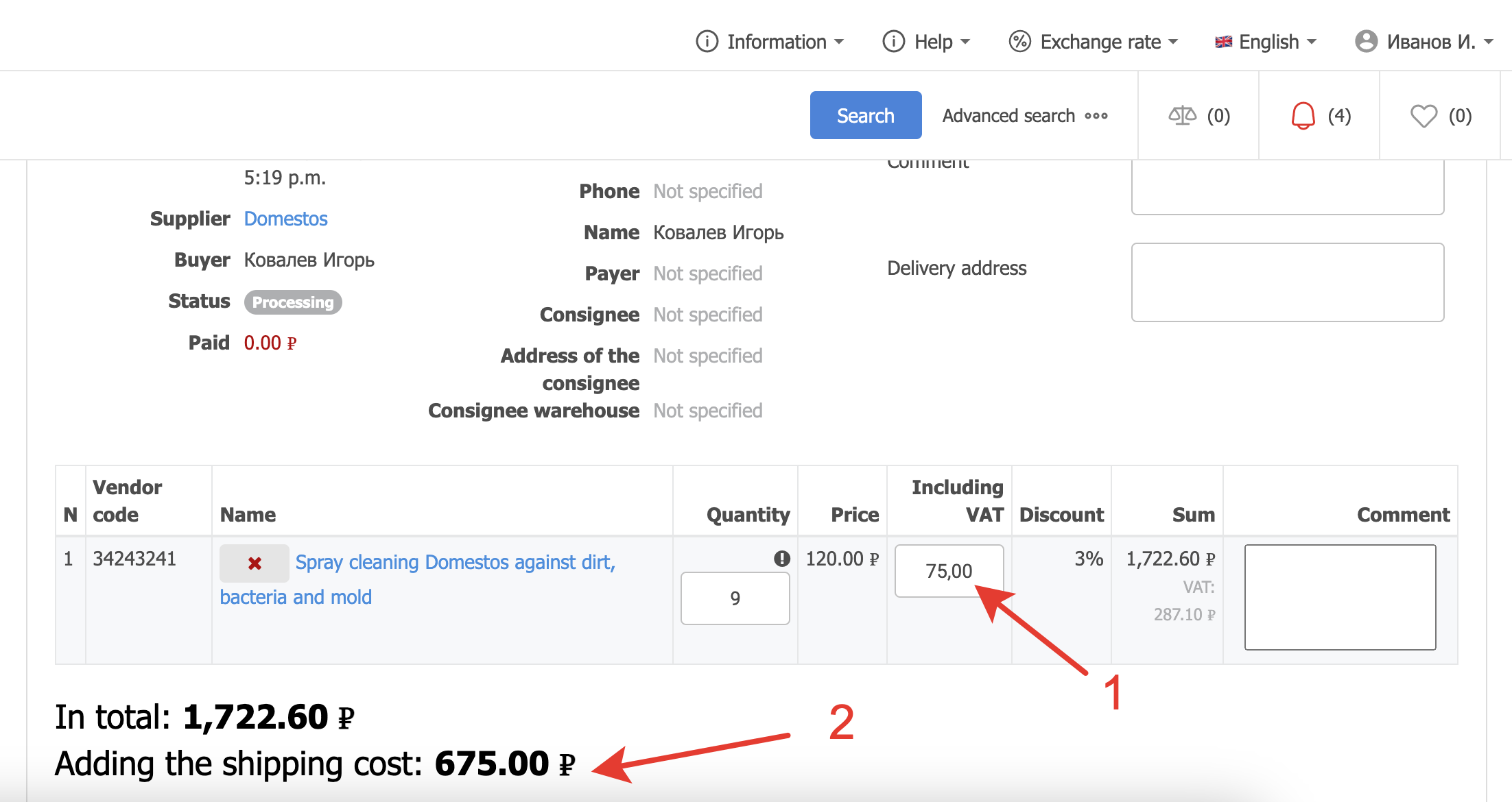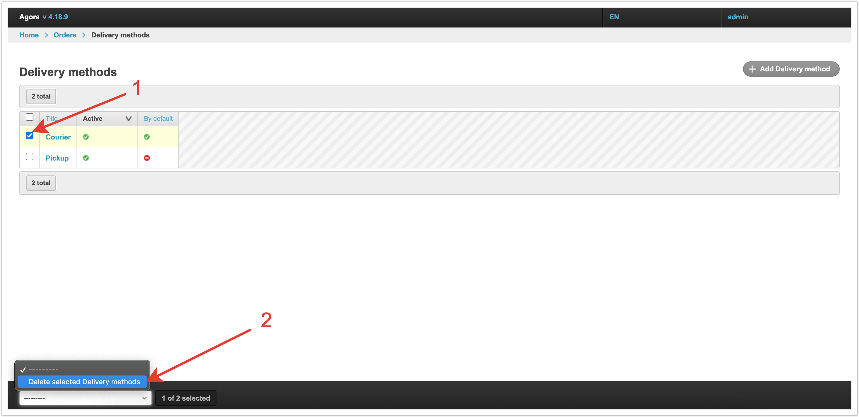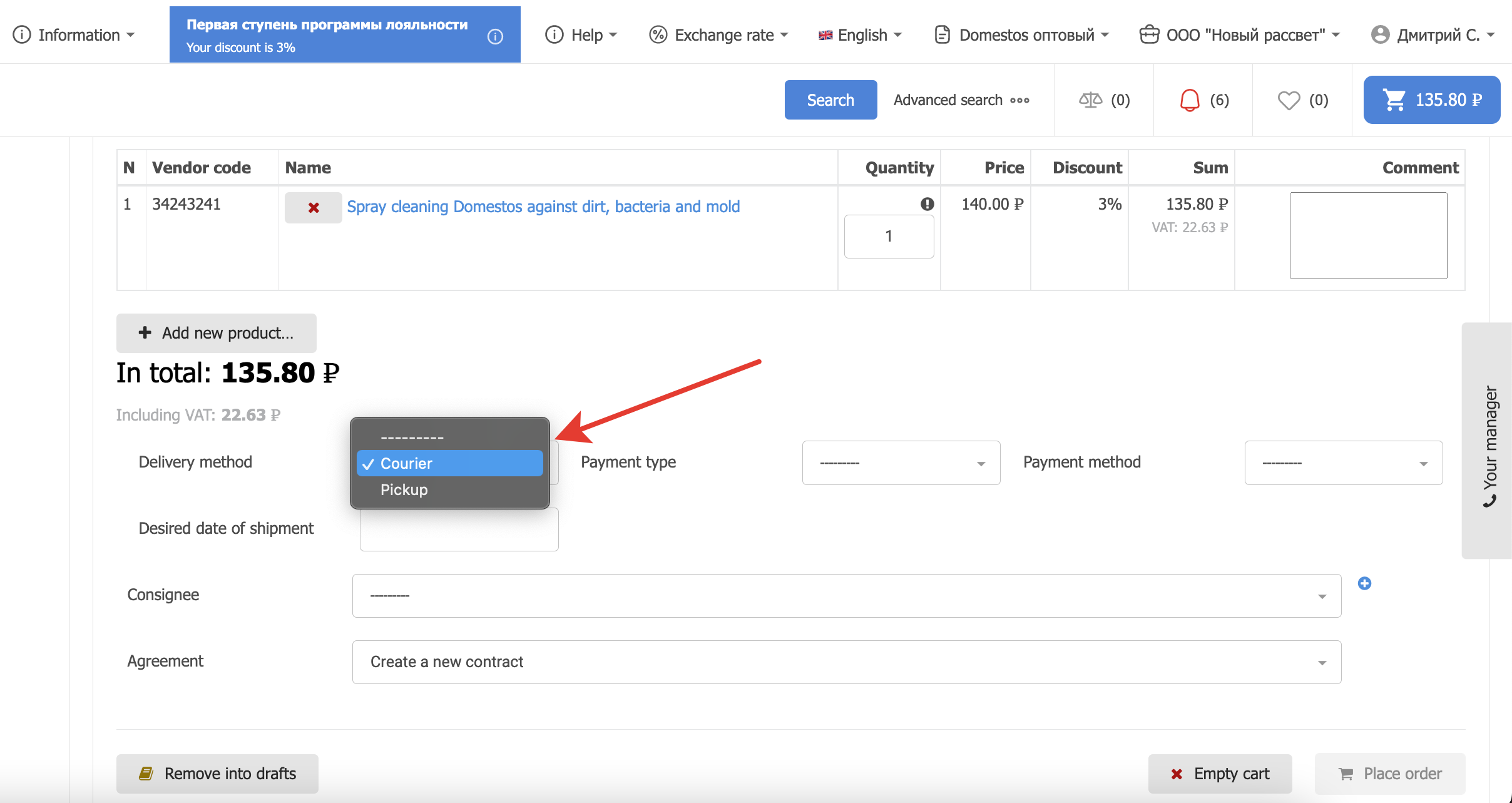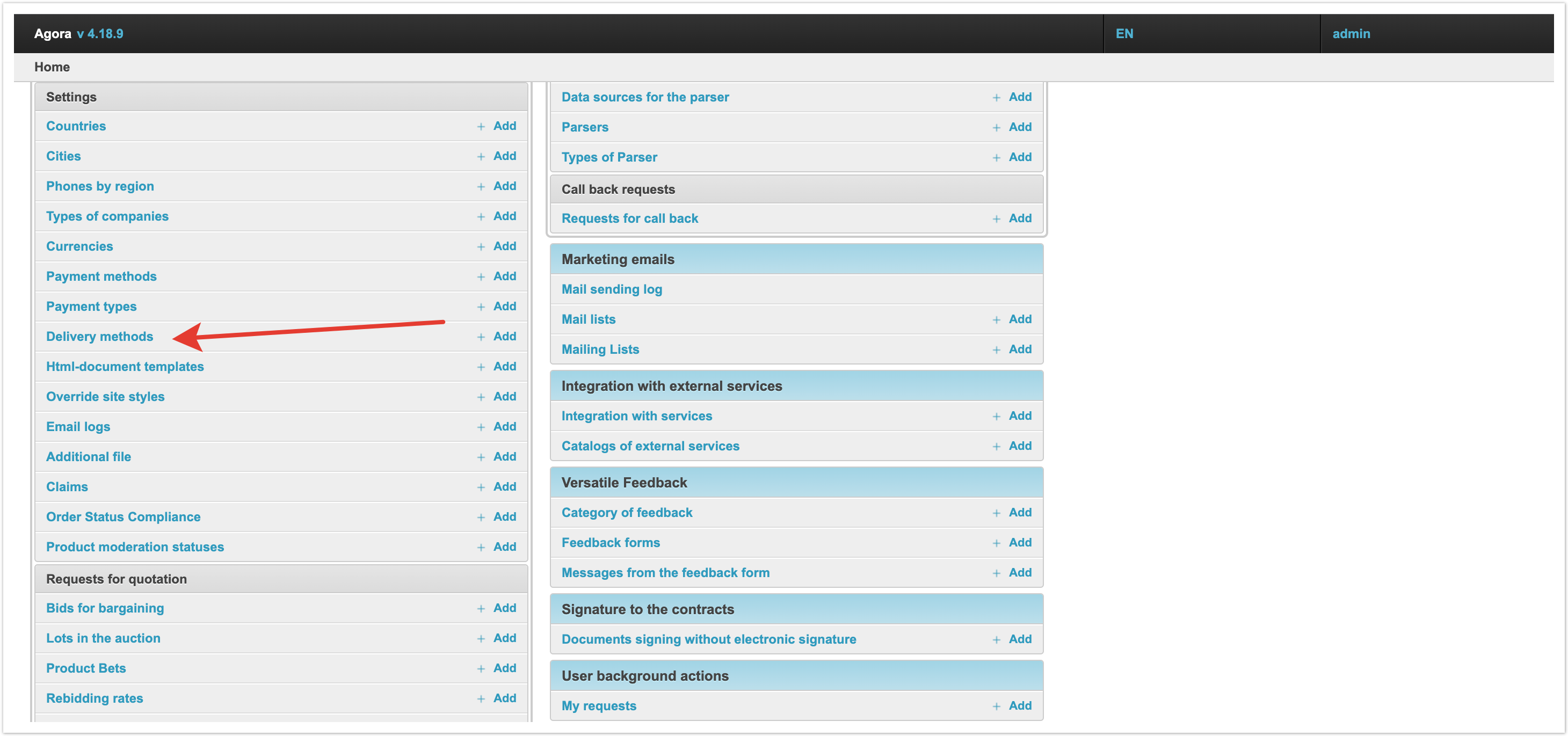 Selecting a shipping method in the shopping cartIf the project uses several delivery methods and their choice is available to the buyer, then the selection field will be displayed in the shopping cart when placing an order. Next, let's look at the process of setting up shipping methods. Adding a Shipping MethodThere is a separate section in the admin panel to set up Delivery Methods. Inside the section, you can see previously entered delivery methods and their status. The Active column allows you to understand which delivery methods are currently used on the platform when placing an order. The By default column indicates which of the shipping methods will be selected in the cart by default. If you need to delete a delivery method, just select it, and then select Delete selected delivery methods from the drop-down list at the bottom left. Also on the page there is a button Add Delivery Method for setting up a new shipping method. After clicking on it, the add form will open. Here you need to fill in the Title. It will be displayed to the buyer when placing an order. The title can be specified in different languages for platforms using multilingualism. The Gateway field is required. It has 4 values: Without delivery(self delivery), CDEK, Catapult and Other. The CDEK and Catapult options are used to set up integration with delivery calculation services. The option Without delivery is used for pickup. If none of the described options is suitable, then you can select the Other value. Below, a field is displayed for specifying the Description also in several languages, if multilingualism is enabled. Description can be used for additional explanations. Then we check that the Active setting is enabled so that this delivery method can be used to place an order. You can also enable the By default setting, then this shipping method will be set by default when placing an order. For correct operation, it is better to choose one default shipping method. After all the required data has been filled in, you need to click on the Save button and the delivery method will be added. Adding shipping costs by the supplierWhen setting up a shipping method, there is also a setting Adding the cost of delivery by the supplier. This setting allows the supplier to independently add shipping costs to the order. In order for the functionality to work in the supplier settings in the admin panel, you must also enable Add the shipping cost setting. After enabling these settings, a separate field will appear in the supplier's personal account in the order card to indicate the cost of delivery for each individual item. The shipping cost will be added to the order amount, and the buyer will see it and be able to pay. This functionality allows you to add shipping costs to the order amount and make it more convenient for the buyer to pay. Integration with logistics servicesFor delivery methods, there are ready-made integrations with CDEK and Catapult. If necessary, integration with other logistics services can be configured as an individual solution. Integration with CDEK works in such a way that after placing an order, the buyer will be redirected to the page of the CDEK service to arrange delivery. Integration with Catapulto works in a similar way. After placing an order, the buyer will see a shipping calculation form, where they will need to fill in the shipping and receiving address, as well as the type of shipment. Next, fill in the parameters for size, weight and additional settings. After clicking on the calculation button, all available delivery options and their cost will be offered. You can choose any suitable option. In more detail, the work of Catapulto with is described on the page.
