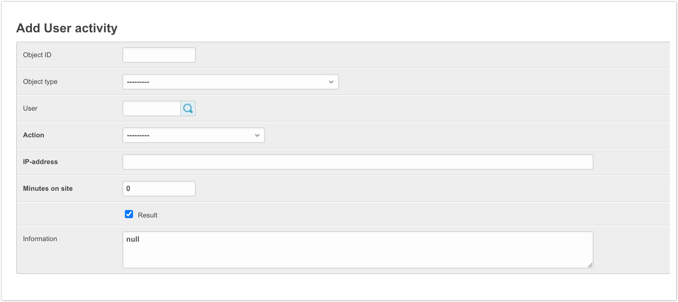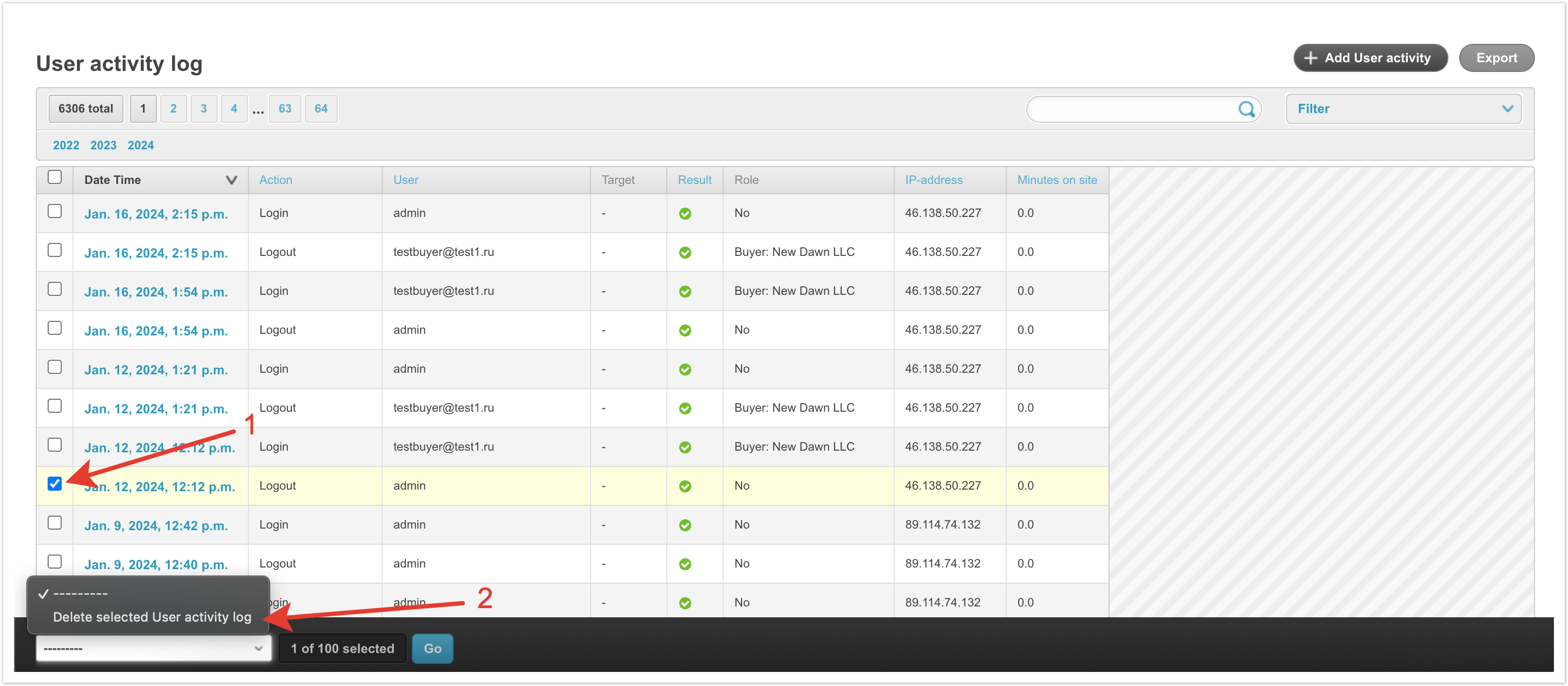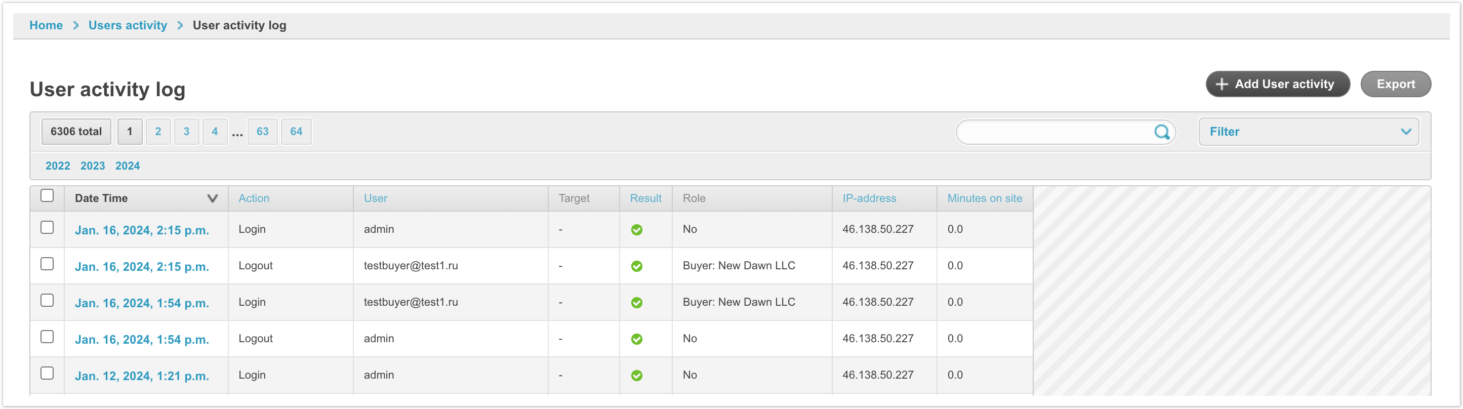 If you need to add a new action, click the Add User activity button. Object id, Object type. User - user login. Action - select user actions IP address - IP address of the user who performed the action. Minutes on site - time spent on the site. Result - if the checkbox is selected, then the action was completed successfully. Information - information about user actions You can also export the received data to an .XLS file by clicking the Export button. To delete actions, select the checkbox to the right of the date and time of the action and from the drop-down list at the bottom of the table select Delete selected User activity log. |