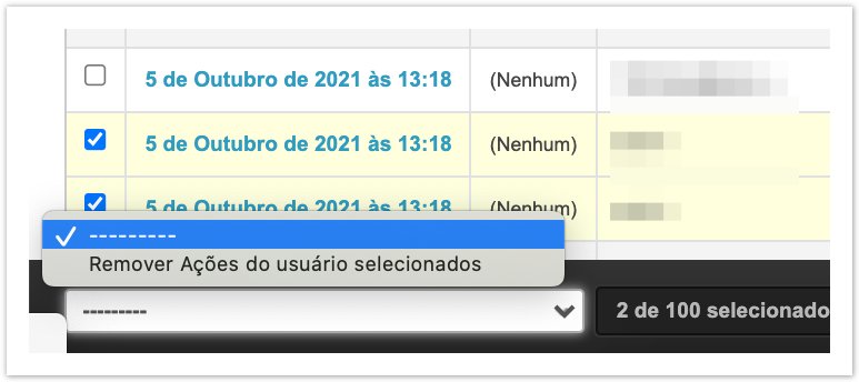 Você também pode exportar os dados resultantes para um . XLS clicando no botão Exportar. Para excluir as ações, selecione a caixa de seleção à direita da data e hora da ação e, na lista de retirada na parte inferior da tabela, selecione Remover ações do usuário selecionadas.