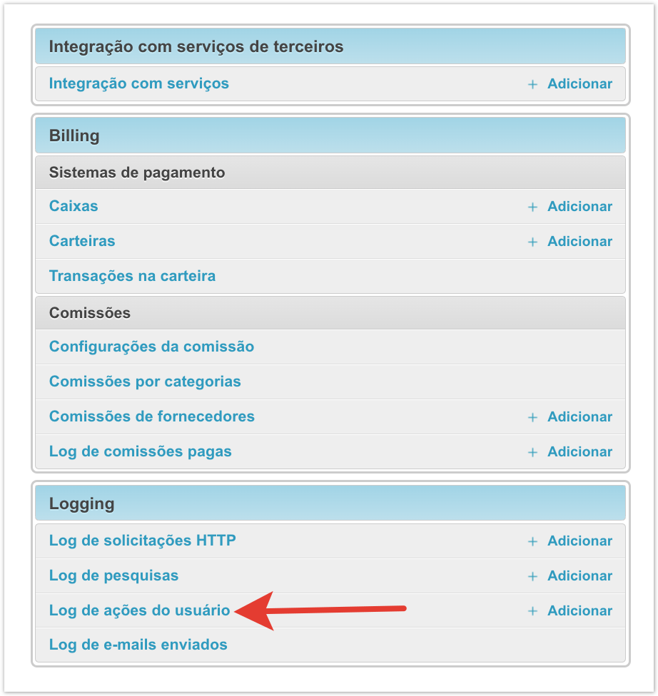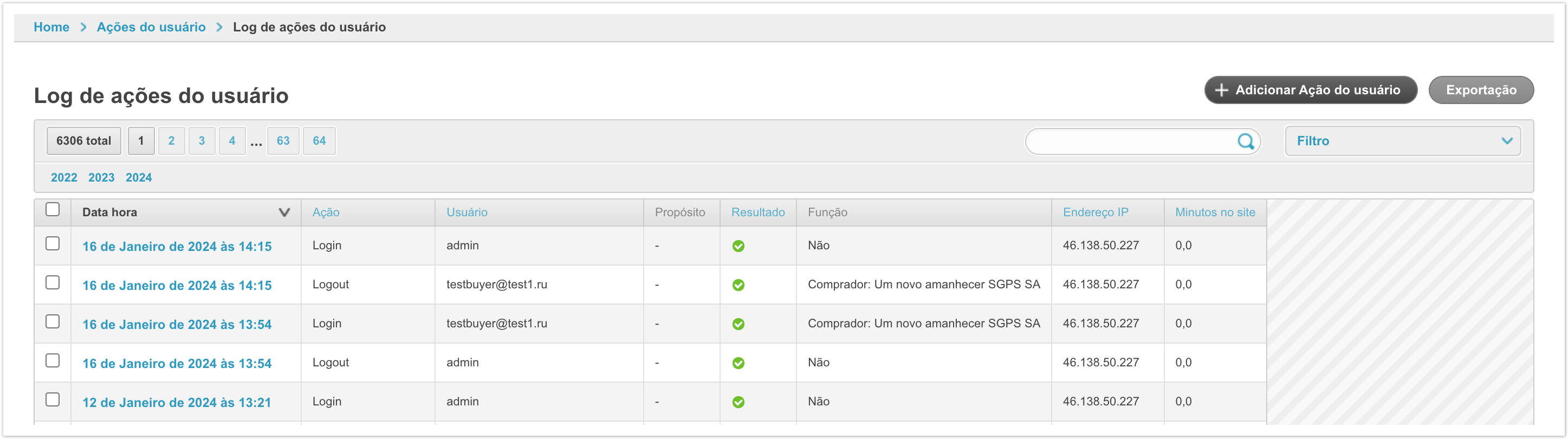A seção Log de ações do Usuário permite que o administrador do sistema visualize um relatório sobre a atividade do usuário no portal e exporte-o para o formato XLS. O painel administrativo está disponível apenas para usuários com privilégios administrativos. |