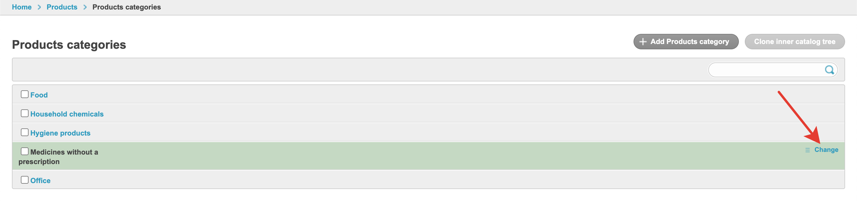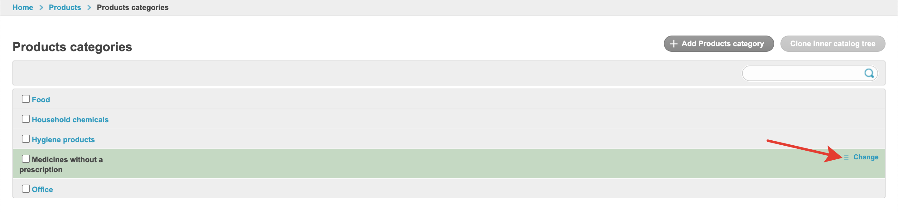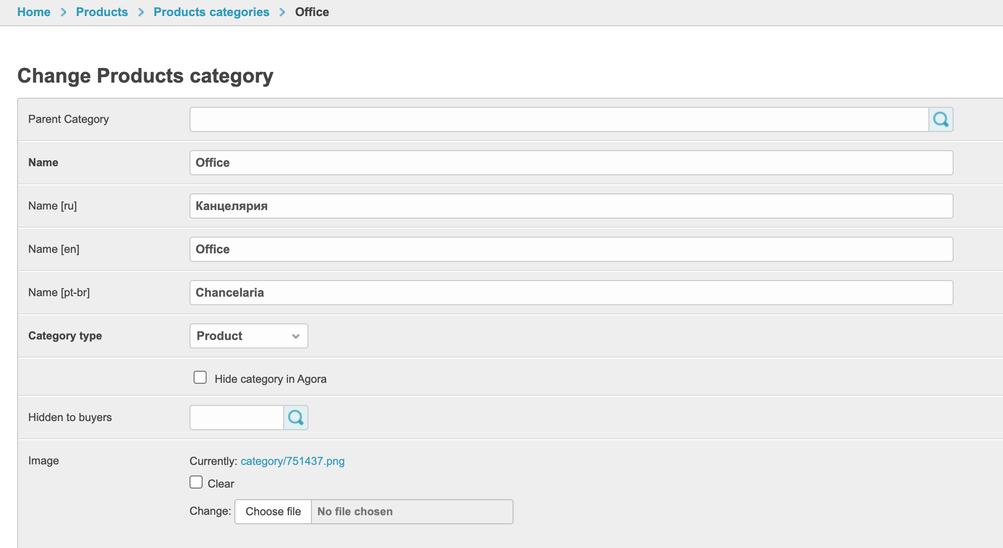 Page title, Signature of page, Seo text, Extras. information - This data can be filled in to improve the quality of search results. The completed data will not be displayed on the platform, but will be used for SEO optimization. Parent category - in this field you can specify which parent category the generated category belongs to. Filling in this field is relevant if a nested category is created that has a parent. If a top-level category is being created, then this field is not required. Name - this field contains the name of the category. It can be specified in different languages for platforms using multilingualism. The name of the category will be displayed in the personal accounts of users. Category type - in the drop-down list there are two values Product and Service. The category type determines what objects it will include - products or services. Hide category in Agora - this setting allows you to hide the product category from all users of the platform. If the setting is enabled, then the category itself and all products in this category will be hidden from buyers and suppliers. Hidden to buyers - in this field you can select specific buyers for whom the category will be hidden. This setting is used if the category should not be hidden from everyone, but only from some customers. Image - in this field you can upload an image that will be displayed next to the category in the Catalog tab in the center of the page. Inactive icon - in this field you can upload an image for an icon that will be displayed in the list of categories on the left side of the Catalog page. Active icon - in this field you can upload an image for the icon that will be displayed in the list of categories on the left side of the Catalog page, when this category is selected. Users - in this field, you can specify the users for whom the category will be available. This setting works in a similar way to the hide category setting, but the difference is that it saves time on hiding if you only need to display the category for a few users. Sap code - code for integration with SAP. Min. order price - in this field you can specify the minimum amount for ordering goods from this category. The buyer will not be able to order goods from this category for an amount less than specified in the field. Email for order notifications - in this field you can specify the email addresses to which notifications will be sent when ordering a product from this category. If you need to send notifications to several email addresses, then each address must be specified on a new line. Column pop-up sidebar - this setting is currently deprecated and will be removed in a future update. Serial number of the category - this field can display the category serial number, if it has one. This field is used when the functionality for generating internal SKUs works. Next comes the settings block with SEO parameters. In this settings block, you can specify data for search engine optimization of a product category: Meta-title, Meta-keywords, Meta-description, Page title, Signature of page, Seo text, Extras. information. This data can be filled in to improve the quality of search results. The completed data will not be displayed on the platform, but will be used for SEO optimization. After filling in all the necessary parameters, you need to save the new category. To do this, click the Save button in the lower right corner of the page. After saving, the new category will appear in the list. Changing categoriesAny category can be changed if necessary. To do this, you need to hover over the line with the category, then the Change button will appear on the right side of the line, you need to click on this button.changed if necessary. To do this, click on the category title. After that, a category card will open in which you can make changes. The available category settings were discussed above in more detail. In addition to changing the settings of the category itself, you can also change their order using the Drag-and-Drop functionality. To do this, you need to hover over the line with the category. After that, a button with three horizontal stripes will appear on the right side, just drag it your cursor over the arrow symbol and move the category to a new location. Removing categoriesTo delete a product category, select it, and then select Delete selected Products Categories from the drop-down list at the bottom left of the page. In addition to deletion, you can also Download in XLS format. After that, an XLS file with the selected categories will be generated. Categories can be configured by the platform owner through the admin panel. However, the supplier from his personal account can also perform category settings, for example, adjust their correspondence. For more information about setting up categories on the supplier side, see a separate page.