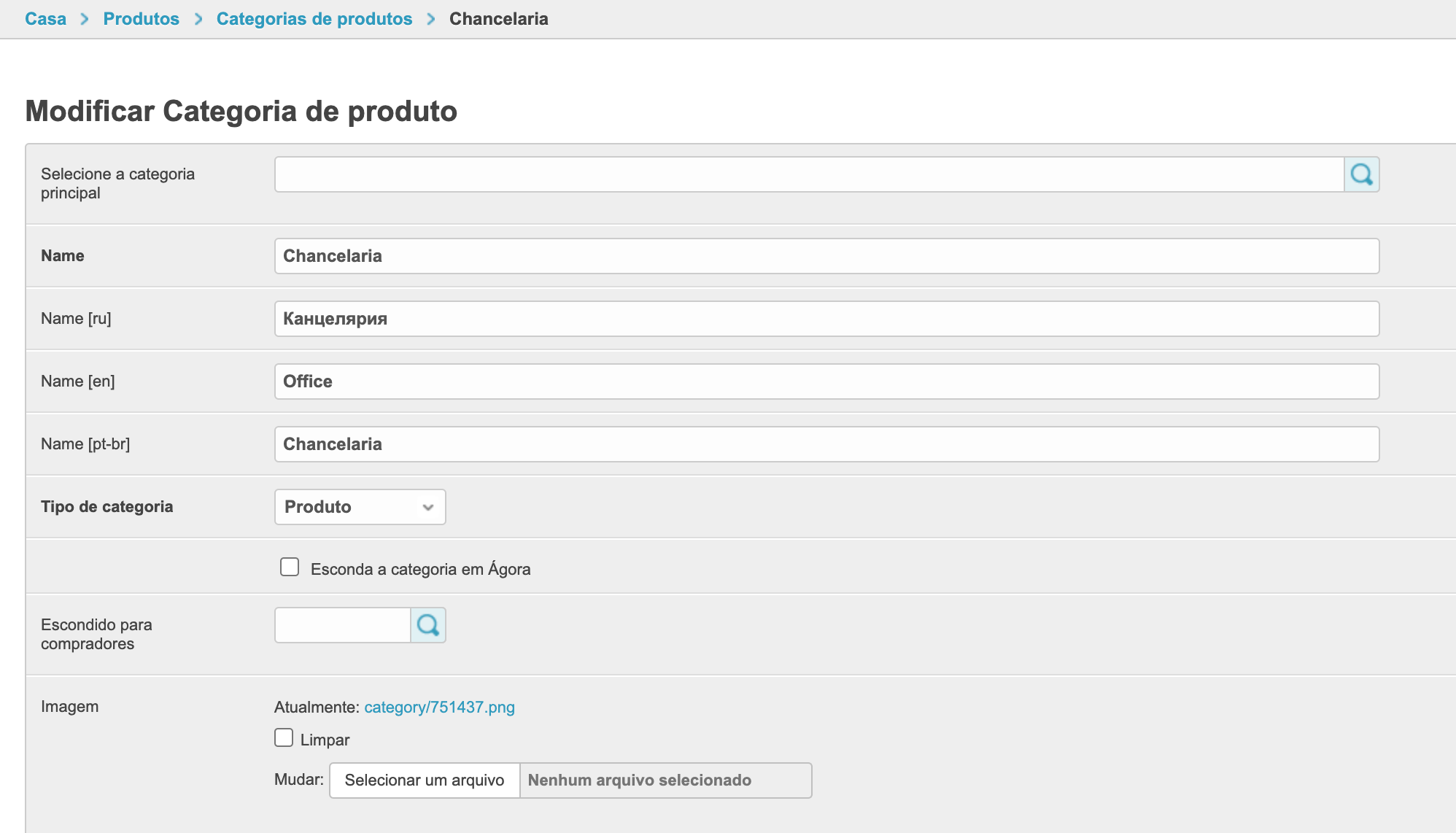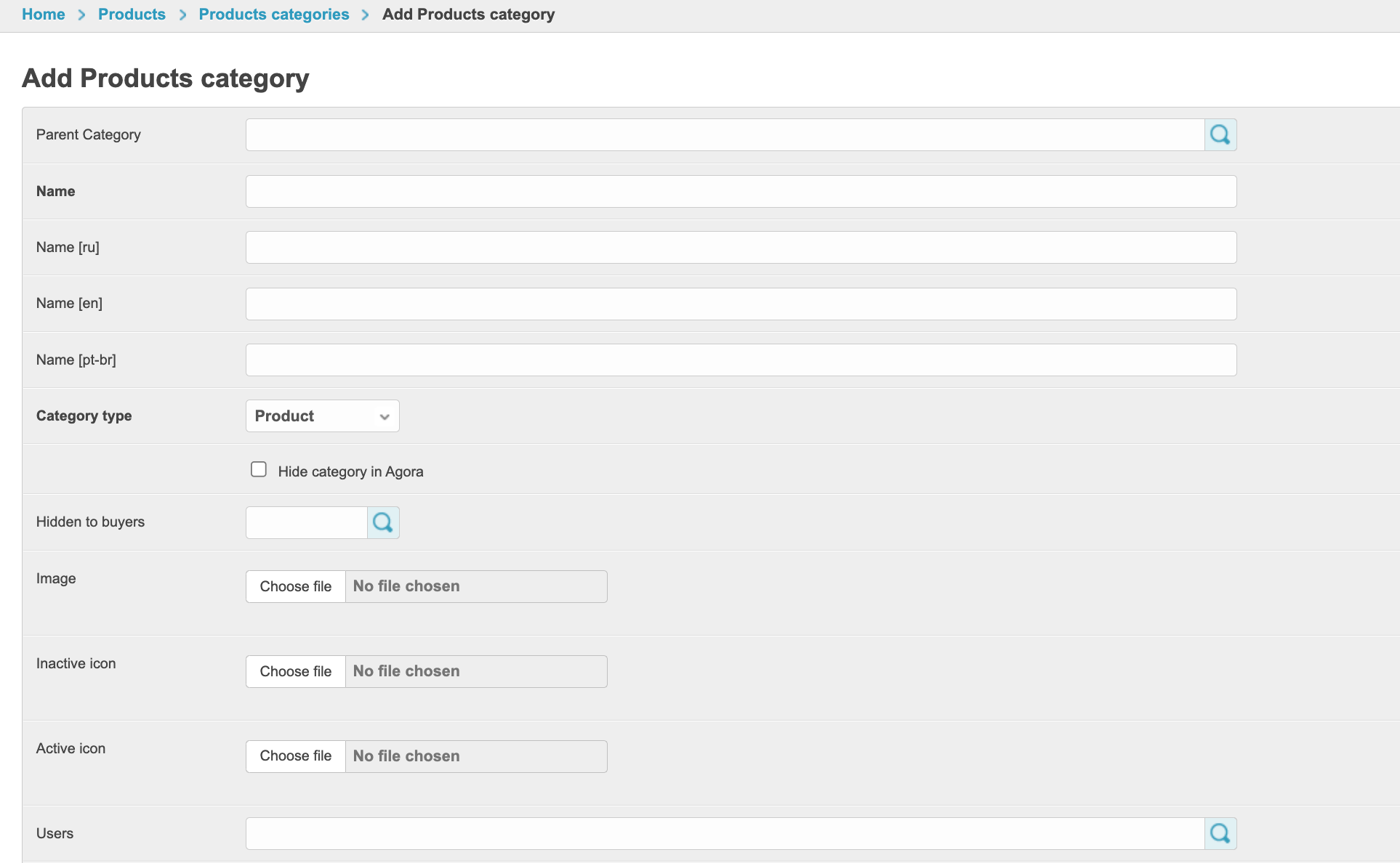 Selecione a categoria principal - neste campo você pode especificar a qual categoria pai a categoria que você está inserindo pertence. O preenchimento desse campo é relevante se você estiver criando uma categoria aninhada que tenha um pai. Se você criar uma categoria de nível superior, não será necessário preencher esse campo. Name - este campo especifica o nome da categoria. Pode ser especificado em diferentes línguas para plataformas que utilizam o multilinguismo. O nome da categoria será exibido nas contas pessoais dos usuários. Tipo de categoria - na lista suspensa há dois valores Produto e Serviço. O tipo de categoria determina quais objetos ela incluirá - bens ou serviços. Esconda a categoria em Ágora - essa configuração permite ocultar a categoria de produtos de todos os usuários da plataforma. Se a configuração estiver habilitada, a categoria em si e todos os produtos dessa categoria serão ocultados de compradores e fornecedores. Escondido para compradores - neste campo você pode selecionar compradores específicos para os quais a categoria será ocultada. Essa configuração será usada se a categoria não deve ser ocultada de todos, mas apenas de alguns compradores. Imagem - neste campo você pode carregar uma imagem que será exibida perto da categoria na guia Catálogo no centro da página. Ícone inativo - neste campo você pode carregar uma imagem para o ícone, que será exibida na lista de categorias no lado esquerdo da página Catálogo. Ícone ativo - neste campo você pode carregar uma imagem para o ícone, que será exibida na lista de categorias no lado esquerdo da página Catálogo, ao selecionar esta categoria. Usuários - Nesse campo, você pode especificar os usuários para os quais a categoria estará disponível. Essa configuração funciona de maneira semelhante à configuração de ocultação de categoria, mas a diferença é que ela economiza tempo na ocultação se você precisar mostrar apenas uma categoria para alguns usuários. Quantidade mínima de pedido - neste campo você pode especificar o valor mínimo para encomendar mercadorias desta categoria. O comprador não poderá encomendar mercadorias desta categoria por um valor inferior ao indicado no campo. E-mail para alertas de pedidos - neste campo, você pode especificar os endereços de e-mail para os quais as notificações serão enviadas ao encomendar mercadorias desta categoria. Se você quiser enviar alertas para vários endereços de email, cada endereço deverá ser listado em uma nova linha. Coluna da barra lateral pop-up - essa configuração não é relevante no momento e será removida em atualizações futuras. Número seqüencial de categoria - neste campo pode ser exibido o número de série da categoria, se tiver um. Esse campo é usado quando a funcionalidade para gerar artigos internos funciona. Em seguida, há um bloco de configurações com parâmetros de SEO. Neste bloco de configurações, você pode especificar dados para otimização de mecanismo de pesquisa da categoria de produto: Meta title, Palavra-chave, Meta descrição, Título da Página, Assinatura da Página, Texto Seo, Informações adicionais. Esses dados podem ser preenchidos para melhorar a qualidade dos resultados da pesquisa. Os dados preenchidos não serão exibidos na plataforma, mas serão usados para otimização de SEO. Depois de preencher todos os parâmetros necessários, você precisa salvar a nova categoria. Para fazer isso, clique no botão Salvar no canto inferior direito da página. Depois de salvar, a nova categoria aparece na lista. Alterar categoriasQualquer categoria pode ser alterada, se necessário. Para fazer isso, você precisa passar o cursor sobre a linha com a categoria, então o botão Editar aparecerá no lado direito da linha, você precisa clicar neste botão. Isso abrirá um cartão de categoria no qual você pode fazer alterações. As configurações de categoria disponíveis foram discutidas em mais detalhes acima. Além de alterar as configurações da própria categoria, você também pode alterar sua ordem usando a funcionalidade Arrastar e soltar. Para fazer isso, você precisa passar o cursor sobre a linha com a categoria. Depois disso, um botão com três barras horizontais aparecerá na parte direita, basta puxá-lo e mover a categoria para um novo lugar. Excluir categoriasPara excluir uma categoria de produto, selecione-a e, na lista suspensa no canto inferior esquerdo da página, selecione Remover categorias de produtos selecionadas. Além de desinstalar, você também pode Download em formato XLS. Depois disso, um arquivo XLS com as categorias selecionadas será gerado. A categorização pode ser realizada pelo proprietário da plataforma por meio do painel de administração. No entanto, o fornecedor de sua conta pessoal também pode executar configurações de categoria, por exemplo, configurar sua conformidade. Saiba mais sobre como configurar categorias no lado do fornecedor em uma página separada.