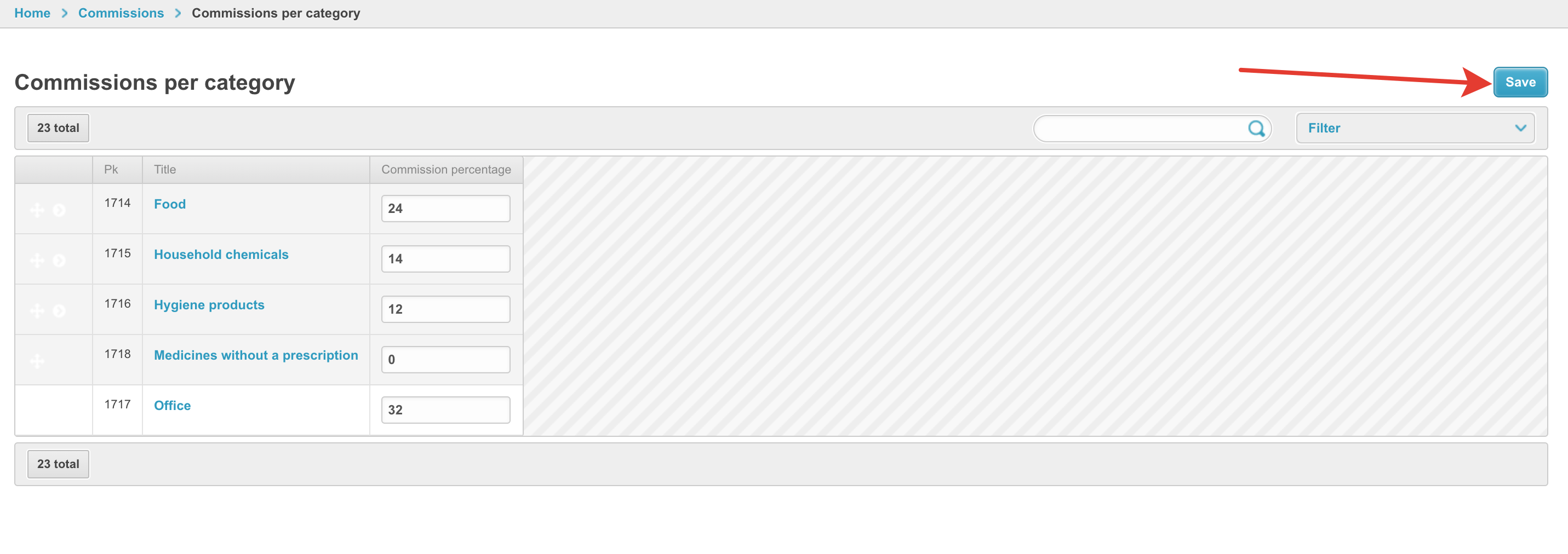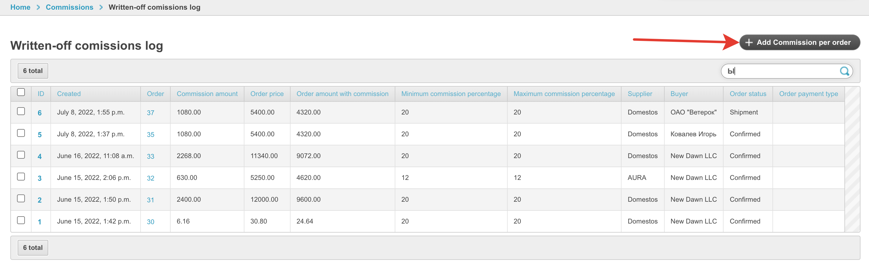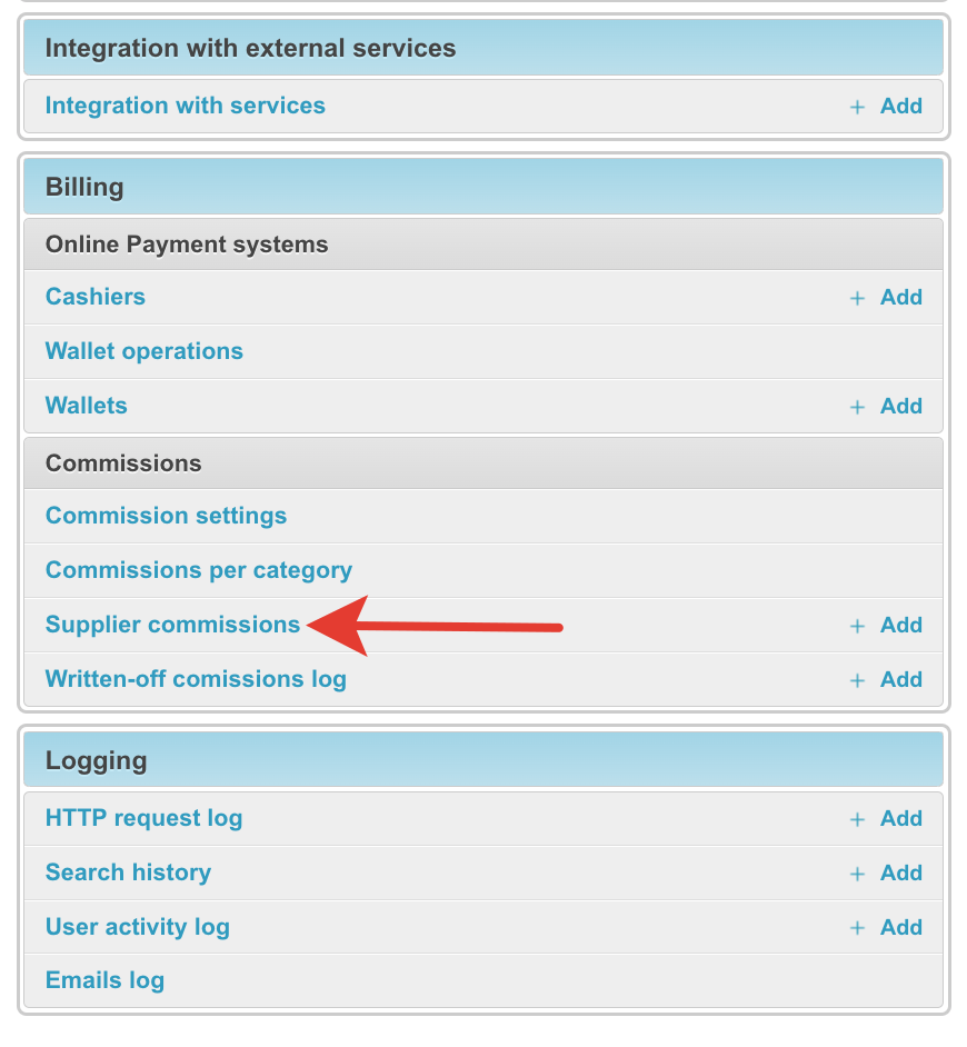 Save your changes. Staging is also available. Commission settings per categoryIf you want to set different commissions for certain product categories, go to Commissions → Commission per category. Enter the commission percentage for each category, and then click Save. Commissions from this category are given higher priority than general commissions. Suppliers' commissionsVendor commissions take precedence over all others. You can assign personal commissions for suppliers in the Commissions → Supplier commissions section. Inside it, you'll see providers that already have commissions set up, as well as an Add Supplier commission button. When you click on it, a window for creating a new commission will open. You can also access this form by clicking the Add button next to the Suppliers' commissions section. Next, using the button , you need to select a supplier, Percentage of commission on goods in the order and Save commission. If the commission for any supplier ceases to be relevant, it can be removed in the Suppliers' commissions section. Write-off comissions logIn the section Commissions → Write-off comissions log, the entire history of debited commissions is displayed. The necessary information is presented in the form of a table. ID — commission identifier. Created — the date the commission was created. Order — the number of the order for which the commission was charged. Commissions amount — the total amount of the commission on the order. Order price — the amount without taking into account the commission. Order amount with commission — the total amount payable. Minimum commission percentage — if there are different commissions for the goods in the order, the minimum percentage is indicated. Maximum percentage of commission — if there are different commissions for the goods in the order, the maximum percentage is indicated. Supplier — the user from whom the commission will be charged. Customer — the user who placed the order. To order status — what is the status of the order at the moment. Order payment type — the payment method approved when placing the order. If you want to create a log log manually, click on the Add commission per order button. In the form that opens, fill in the date and time the commission was created, attach it to the order, and then click Save — a new entry in the written-off commission log will appear in the written-off commission log. You can Delete extra log entries inside the Write-off journal section.