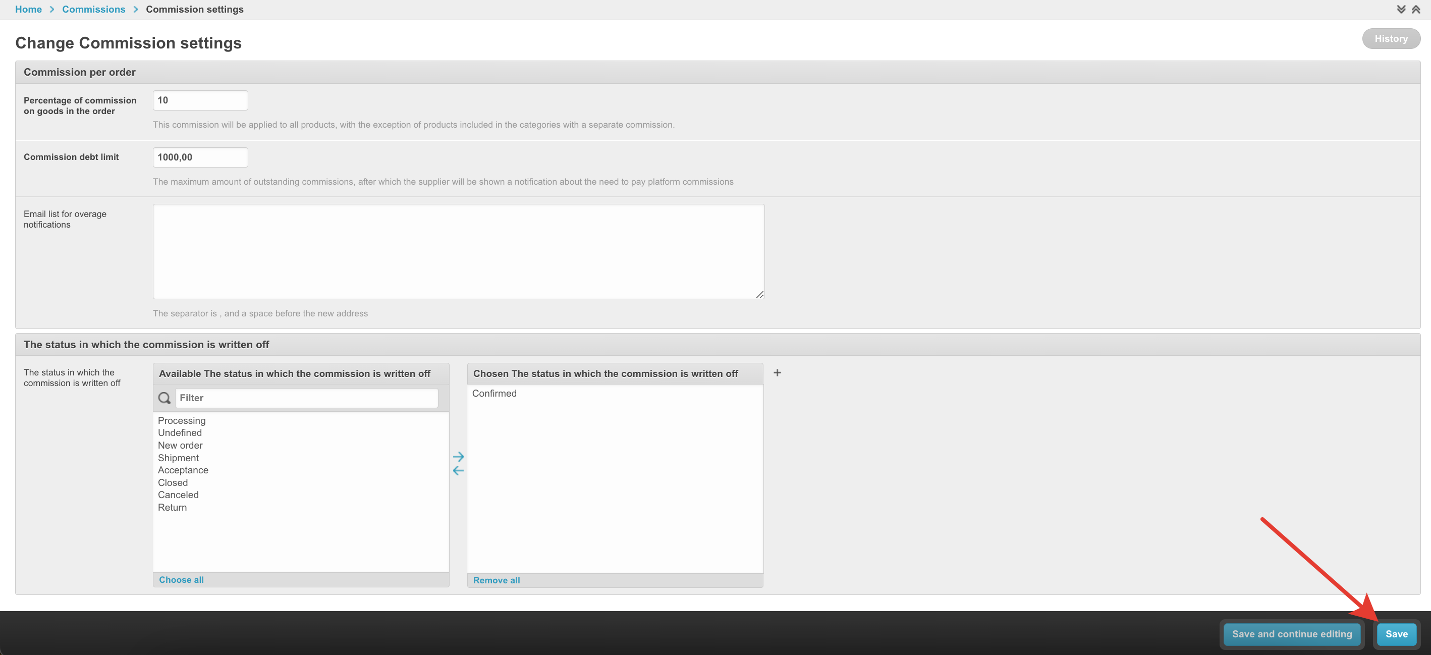 General commission settingsThe main commission settings are made in the Commissions → Commission settings section. After clicking on the link, a commission setting form will open, fill it out. Percentage of commission on goods in the order — a single commission percentage for all suppliers for all products in the catalog. Commission debt limit — if the amount is exceeded, a notification will be sent to pay the arrears of commission. Email list for over-debt notifications — a list of suppliers in arrears of commissions that have exceeded the arrears limit will be sent to the specified email addresses. Status in which the commission is written off — you need to select the order statuses in which the commission will be written off. To do this, move them to the right column. If the project has several payment types, statuses must be selected for each status.