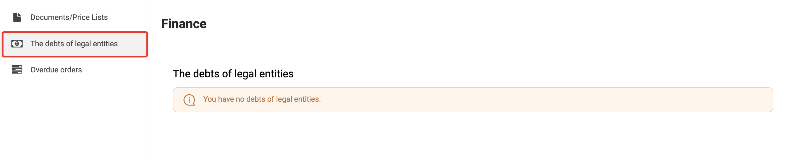 To open the Finance section, click the button in the menu on the left: After going to this section, the following tabs will be available: Documents/Prices This tab is used to download documents from 1C, for example, product certificates/specifications or price lists of goods with a company seal. Legal debts persons The tab contains information about the available credit limit and receivables to the supplier. Late Overdue orders The tab contains information about orders that were not paid within the time allotted by the supplier. After payment, these orders will disappear from the list of overdue ones. |