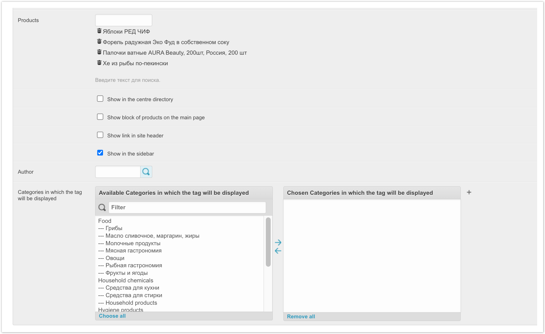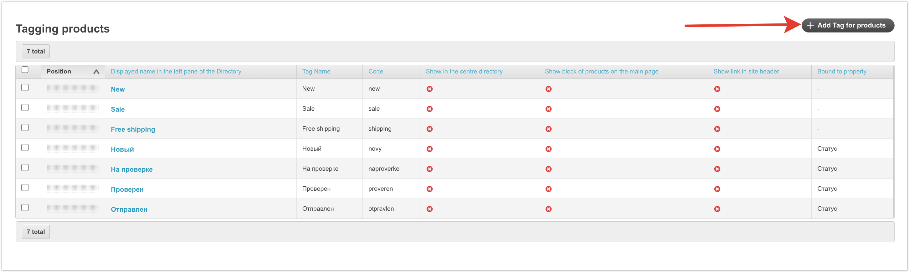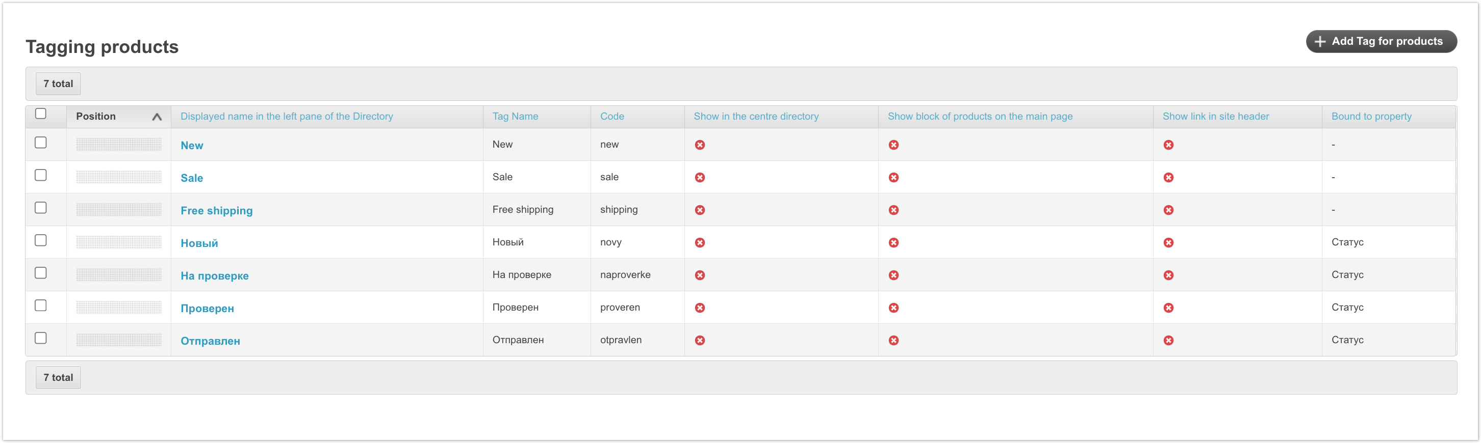 In the administrative panel located at project_name.agora.ru/admin, go to the Tagging products section. The page displays all tags for products configured on the platform. Position - the order in which tags are displayed. Using the drag-and-drop functionality, you can drag the tag to any location. The displayed name in the left panel of the Directory is the name of the tag that will be displayed in the user directory. Tag name - the name of the tag. Code - a unique code for the tag. Show in the center of the catalog - check whether the tag will be displayed in the center of the catalog page. - is displayed,- is not displayed. Show block of products on the main page - a checkbox indicating whether the tag will be displayed on the main page. - is displayed, - is not displayed. Show link in site header - check whether the link will be displayed in the site header. - is displayed, - is not displayed. Linked Bound to property - linking the tag with a specific product property. To change a tag, click on the name of the tag being changed, which will open a page with data in which you can: