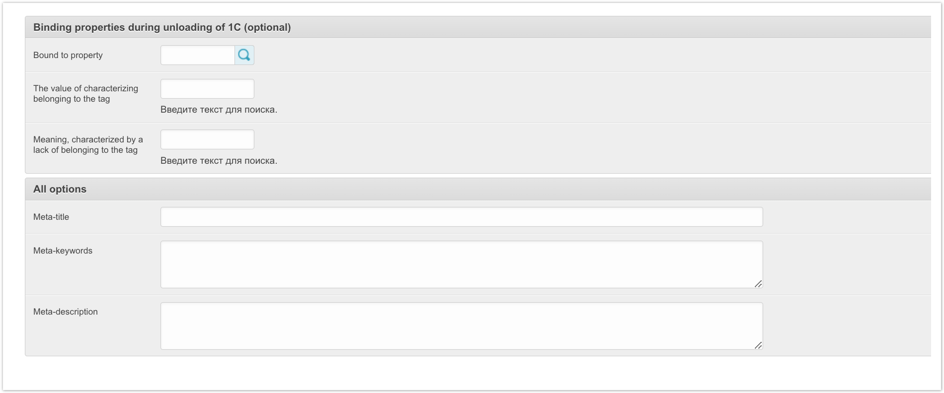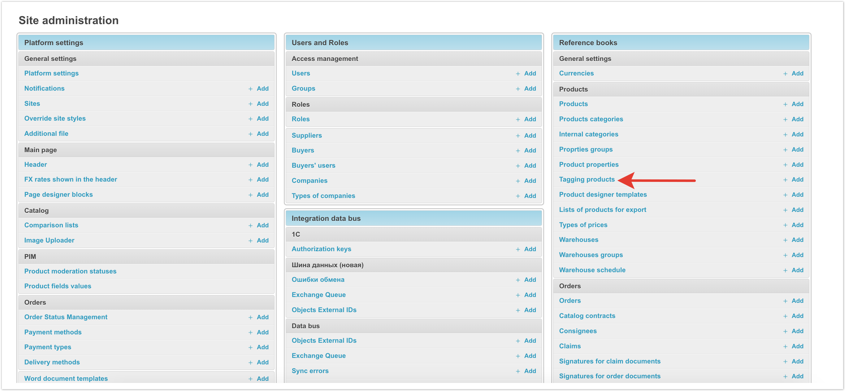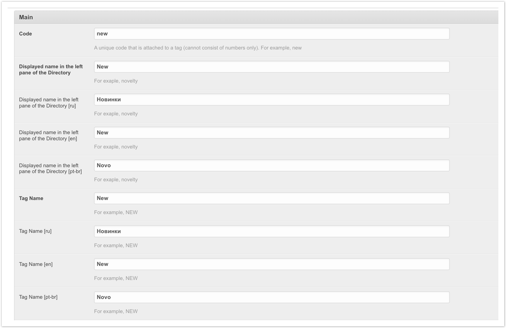 In the administrative panel located at project_name.agora.ru/admin, go to the Tagging products section. The page displays all tags for products configured on the platform. Position - the order in which tags are displayed. Using the drag-and-drop functionality, you can drag the tag to any location. The displayed name in the left panel of the Directory is the name of the tag that will be displayed in the user directory. Tag name - the name of the tag. Code - a unique code for the tag. Show in the center of the catalog - check whether the tag will be displayed in the center of the catalog page. - is displayed,- is not displayed. Show block of products on the main page - a checkbox indicating whether the tag will be displayed on the main page. - is displayed, - is not displayed. Show link in site header - check whether the link will be displayed in the site header. - is displayed, - is not displayed. Linked Bound to property - linking the tag with a specific product property. To change a tag, click on the name of the tag being changed, which will open a page with data in which you can: