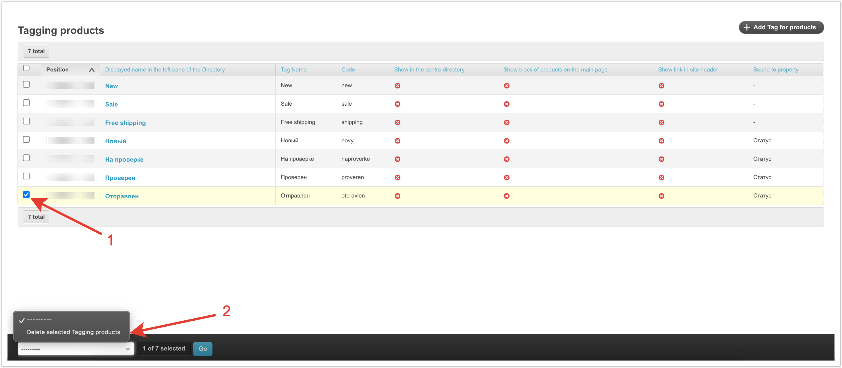 After making changes, you need to Save them. To add a new tag, click on the Add Tag for Products button. Next, you need to fill in the parameters described above. After adding or changing a product tag, these tags will appear in product cards, and folders with the names of all created tags will be displayed in the left pane of the catalog. To delete tags that are no longer relevant, you need to select them, and then select Delete selected Product Tagging products in the menu at the bottom of the page. |