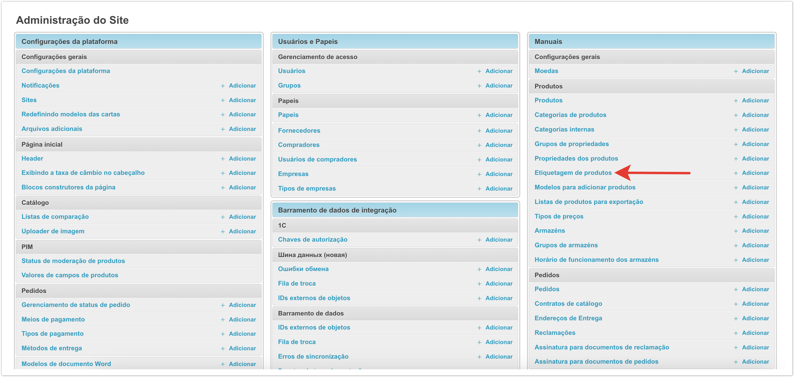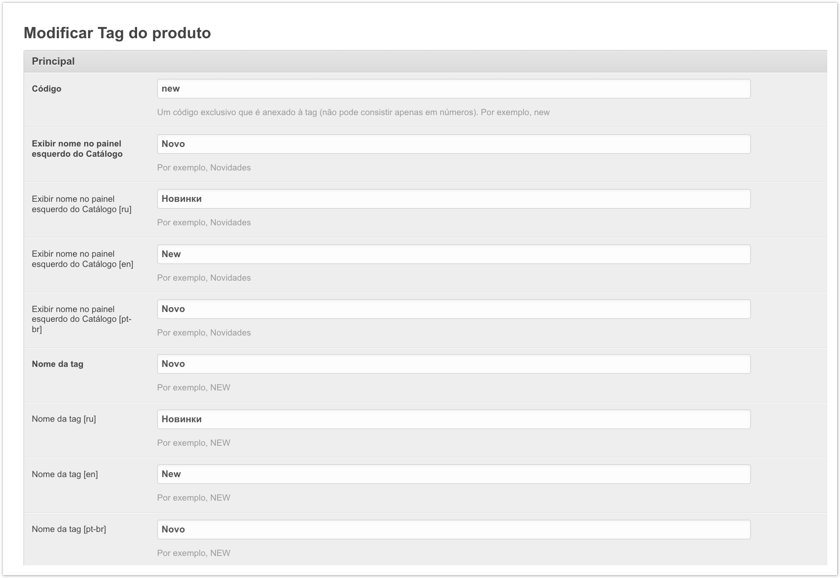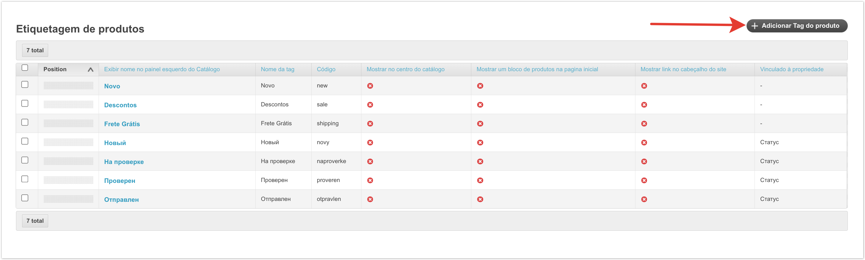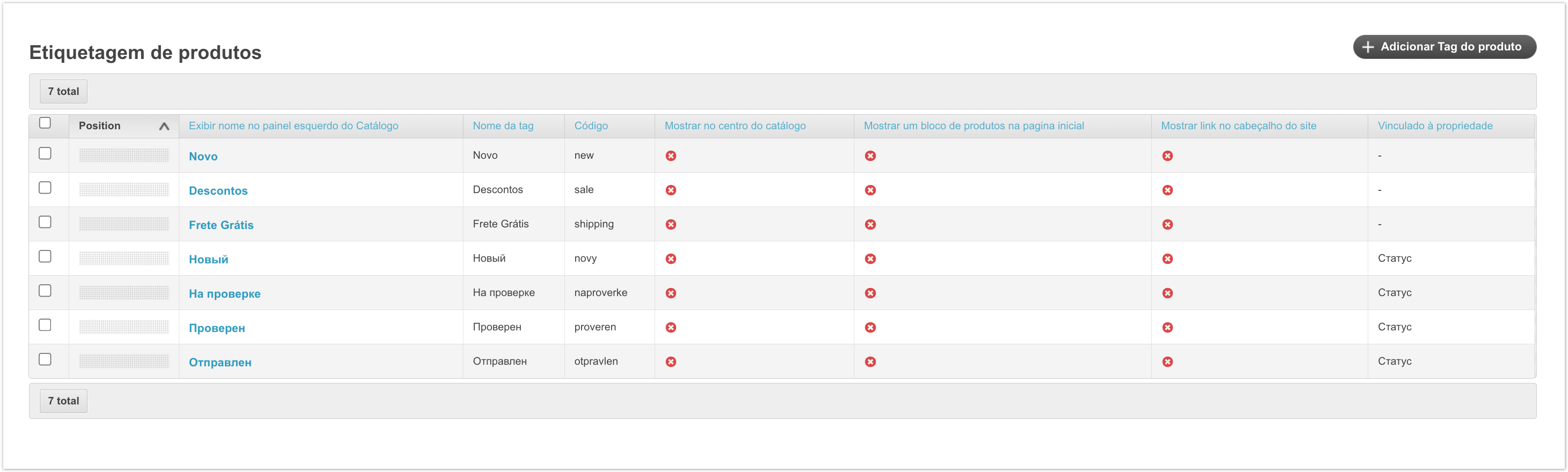No painel de administração localizado em project_name.agora.ru/admin, vá para a seção Etiquetagem de produtos. A página exibe todas as tags dos produtos configurados na plataforma. Position - a ordem em que as tags são exibidas. Com a funcionalidade de arrastar e soltar, você pode arrastar e soltar uma tag em qualquer local. O nome para exibição no painel esquerdo do Catálogo é o nome da marca que será exibida no diretório do usuário. Nome da tag - O nome da tag. Código - um código exclusivo para a tag. Mostrar na central de catálogos - verifique se a tag será exibida no centro da página do catálogo. - Saída, - Não retirado. Mostrar bloco de produto na página principal - verifique se a tag será exibida na página principal. - Saída, - Não retirado. Mostrar link no cabeçalho do site - uma marca sobre se o link será exibido no cabeçalho do site. - Saída, - Não retirado. Vinculado a uma propriedade - o link da tag para uma propriedade específica dos produtos. Para editar uma tag, clique no nome da tag que você deseja editar, que abrirá uma página com dados onde você pode: