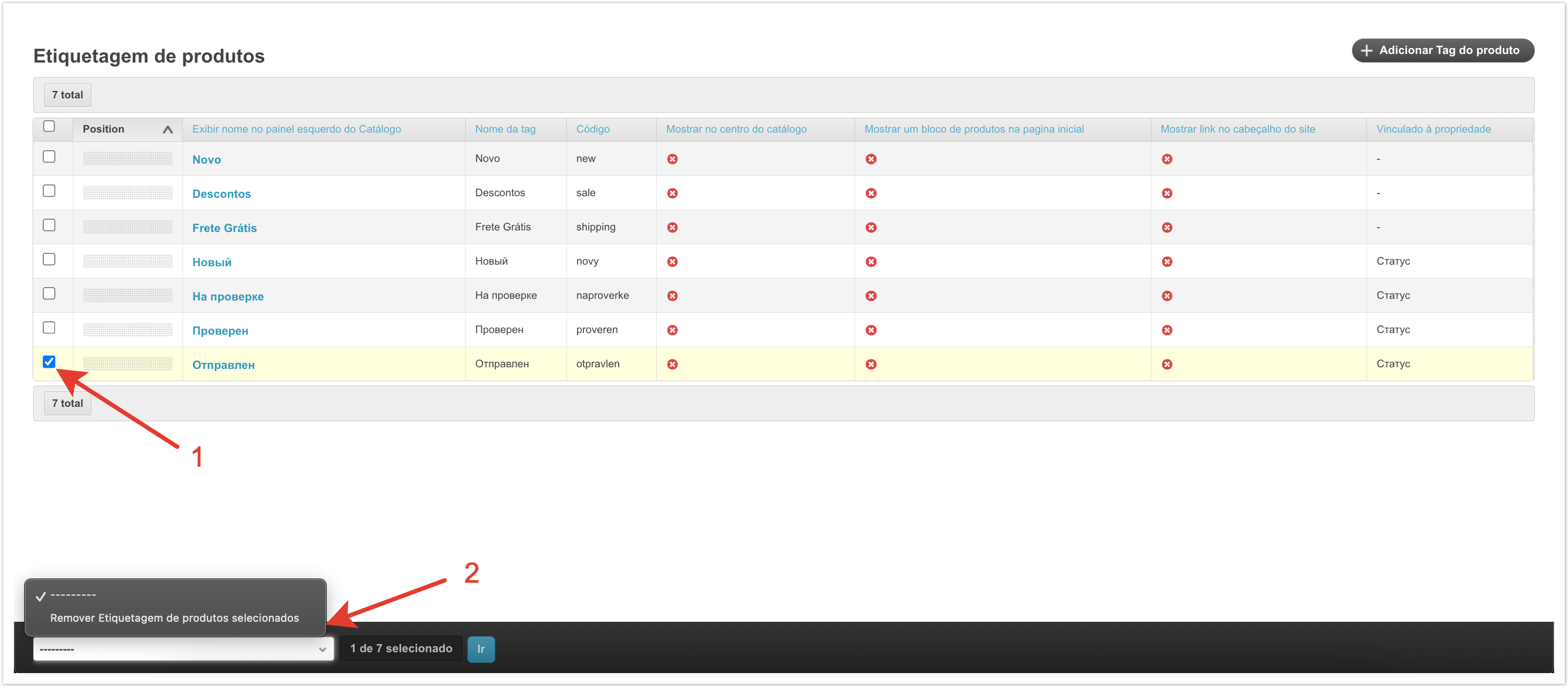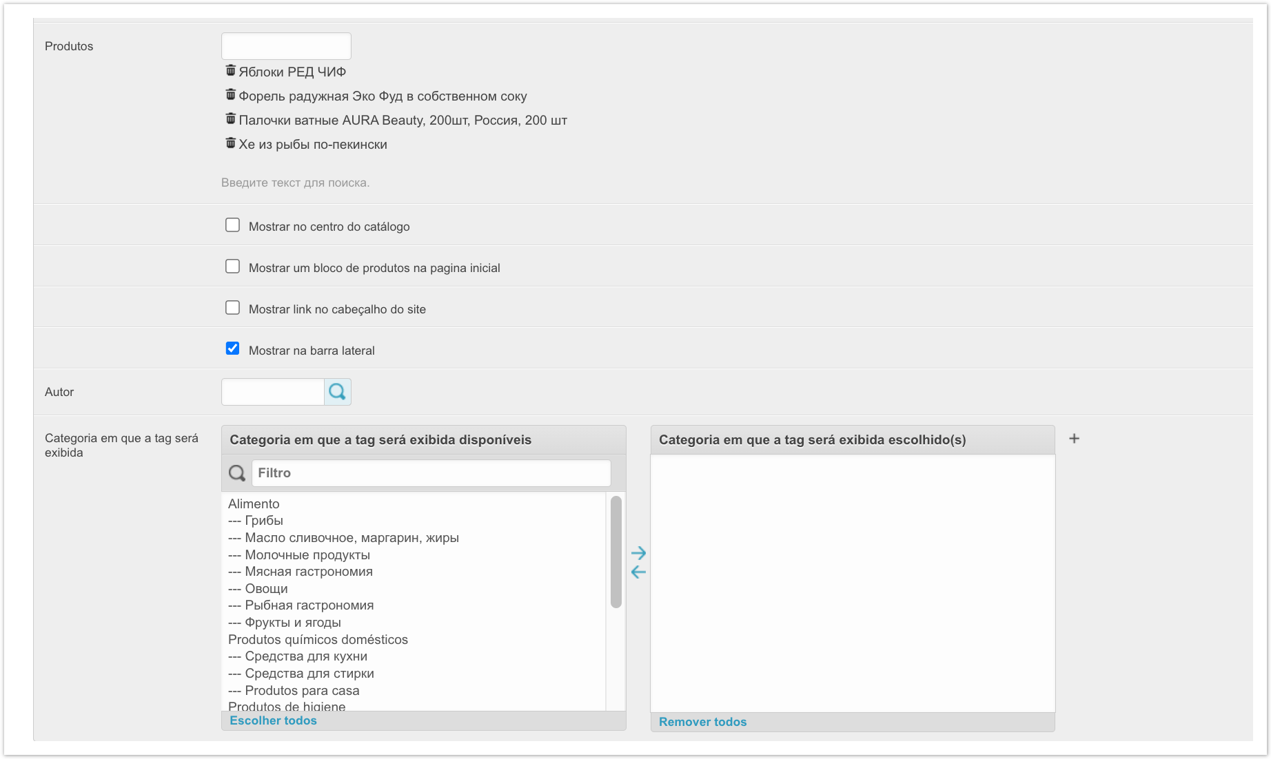 Depois de fazer alterações, você precisa salvá-las. Para adicionar uma nova tag, clique no botão Adicionar tag do produto. Em seguida, você precisa preencher os parâmetros descritos acima. Depois de adicionar ou alterar uma tag de produto, essas tags aparecerão nos cartões de produto e as pastas com os nomes de todas as tags criadas serão exibidas no painel esquerdo do catálogo. Para excluir tags irrelevantes, selecione-as e selecione Remover Etiquetagem de produto selecionada no menu na parte inferior da página. |