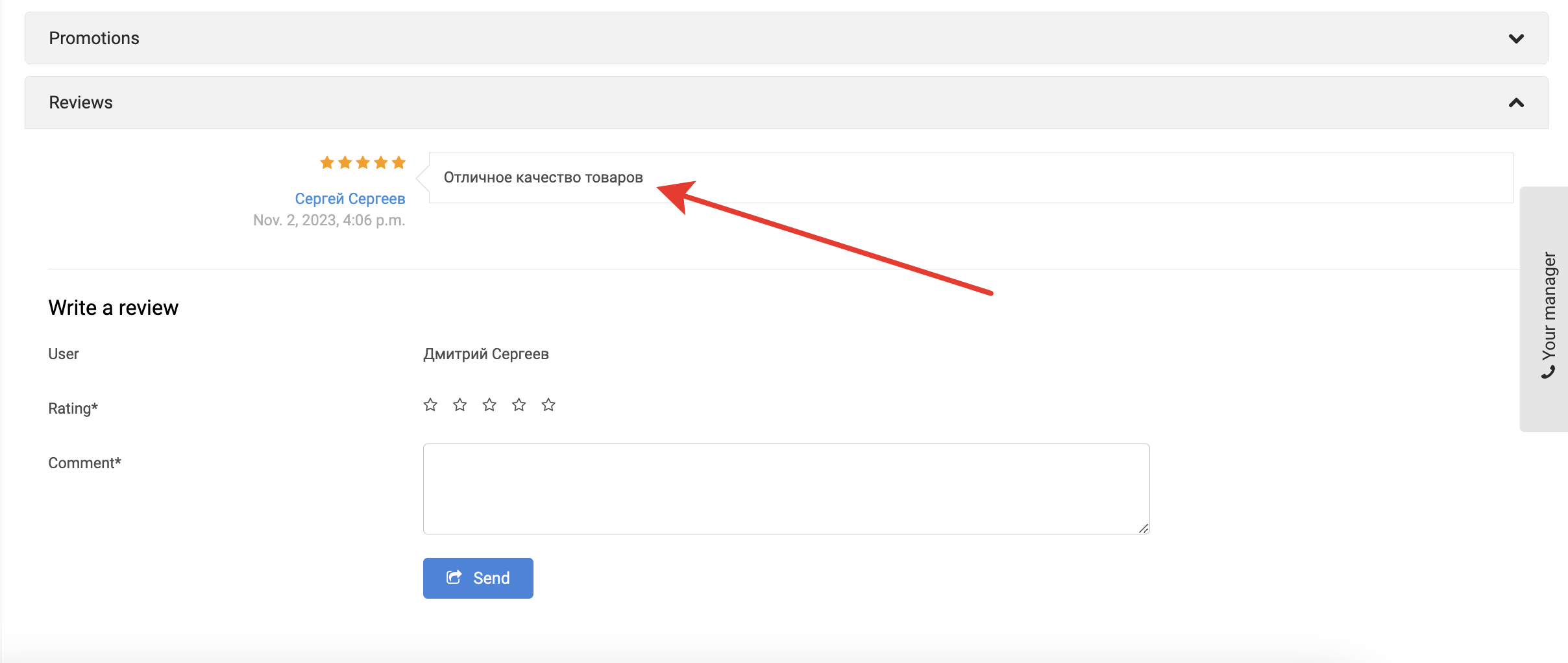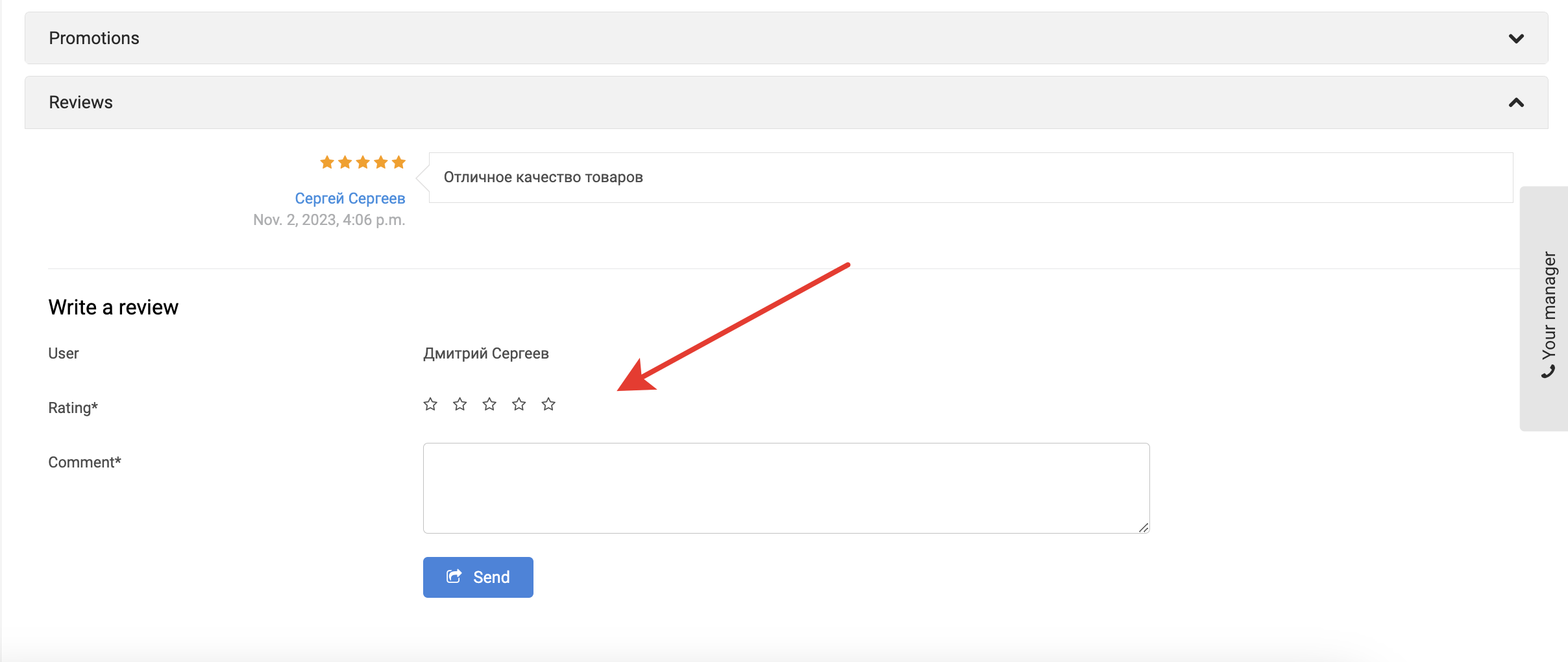 View supplier ratingsTo view a supplier's rating, the buyer must go to his personal account, open the Suppliers section, and click on the name of the supplier of interest. The Reviews field displays the rating given to the supplier. Rating the supplier1. The buyer can rate the supplier and write a comment in his personal account in the Suppliers section (you must click on the name of the supplier company and go to the Reviews tab). 2. The buyer can also give a rating when ordering the product. To do this, in the Orders section, open the desired order and at the bottom of the order, put a rating and write a comment (the ability to set a rating for each order status is configured in the administrative panel in the Manage order statuses section). 3. The buyer can leave a comment on the product by going to the card of the desired product: 4. The rating of the supplier company can also be set by the System administrator in the administrative panel. Go to the Suppliers section, select the required supplier by clicking on its name, in the window that opens, go to the Supplier Profile section and find the Rating field. In this field, set the rating value from 1 to 5: 1 is 1 star, 5 is 5 stars. |