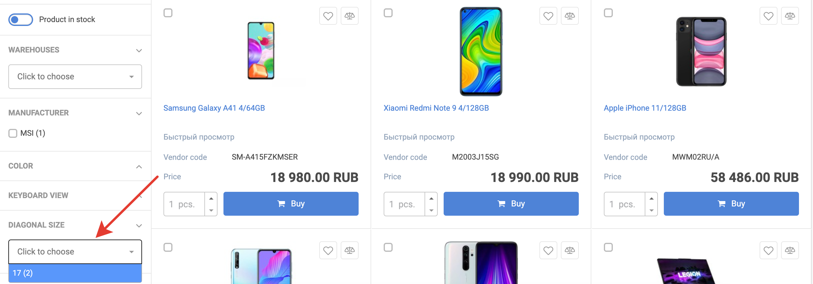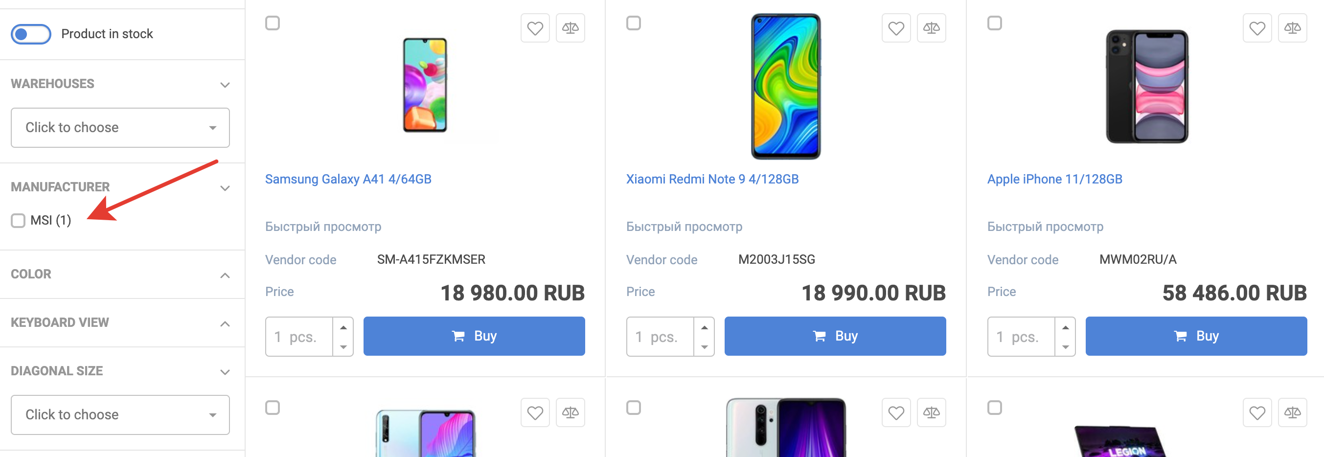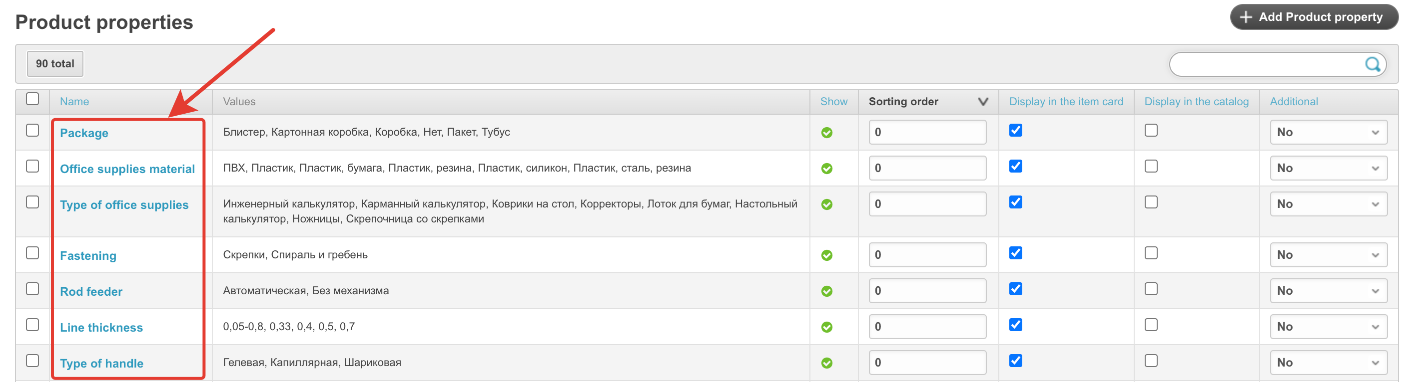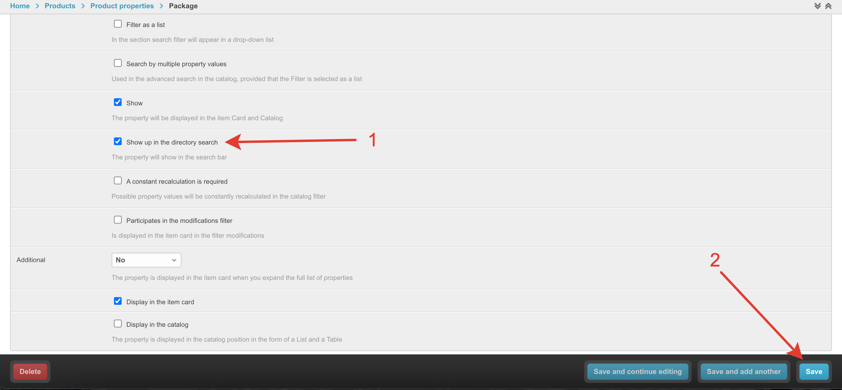 3. I have many product properties. Can I add them to my advanced search criteria?Yes, you can use any product property to configure advanced search filtering conditions. In order to add your product property as an advanced search criterion, you need to log in to the project administrative panel. After authorization, you must go to the section Product Properties. The window that opens will contain all the properties of the products that have been uploaded to the portal. To go to the settings for a specific product property, click on its name: In the window that opens, go to the bottom of the page and mark the check box Show up in the directory search: To save the changes made, just click on the Save button located at the bottom of the page. After you save your changes, the property you added will be displayed in the advanced portal search: