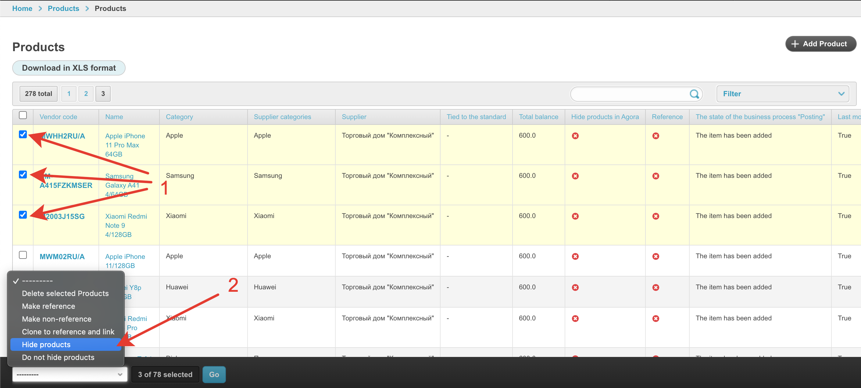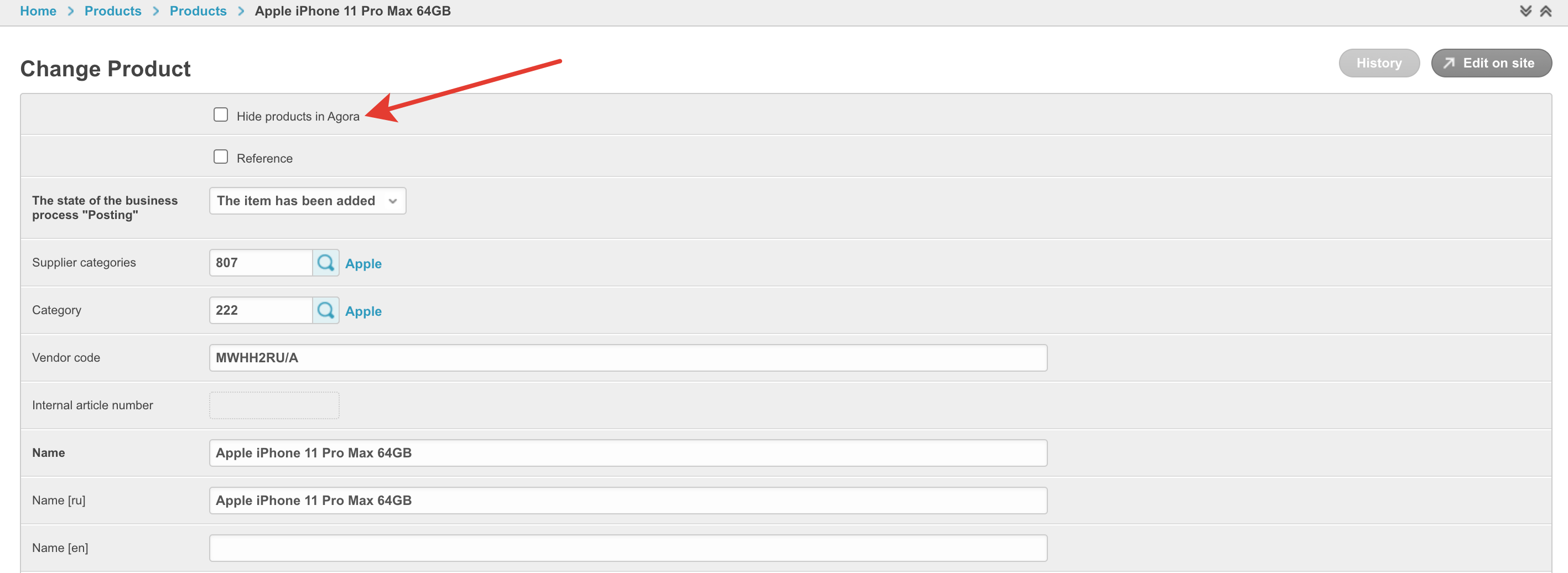 4. How can I hide the products from customers?To hide the product(s) from customers, you need to log in to the administrative panel of the project and go to the Products section. In the window that opens, a list of all the products uploaded to the portal will be available. To hide a specific product, just click on its name. In the opened product card, it is enough to note the check box Hide product in Agora: After that, just click the Save button located at the bottom of the page to save the changes. If you need to hide several products at once, then in the Products section of the administrative part of the portal, just check the checkboxes next to the name of the necessary products and select Hide products in the drop-down list of actions (at the bottom of the page)