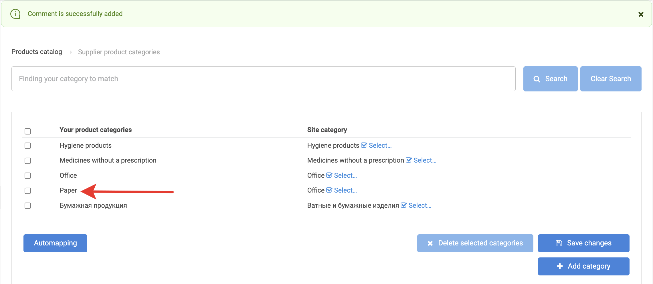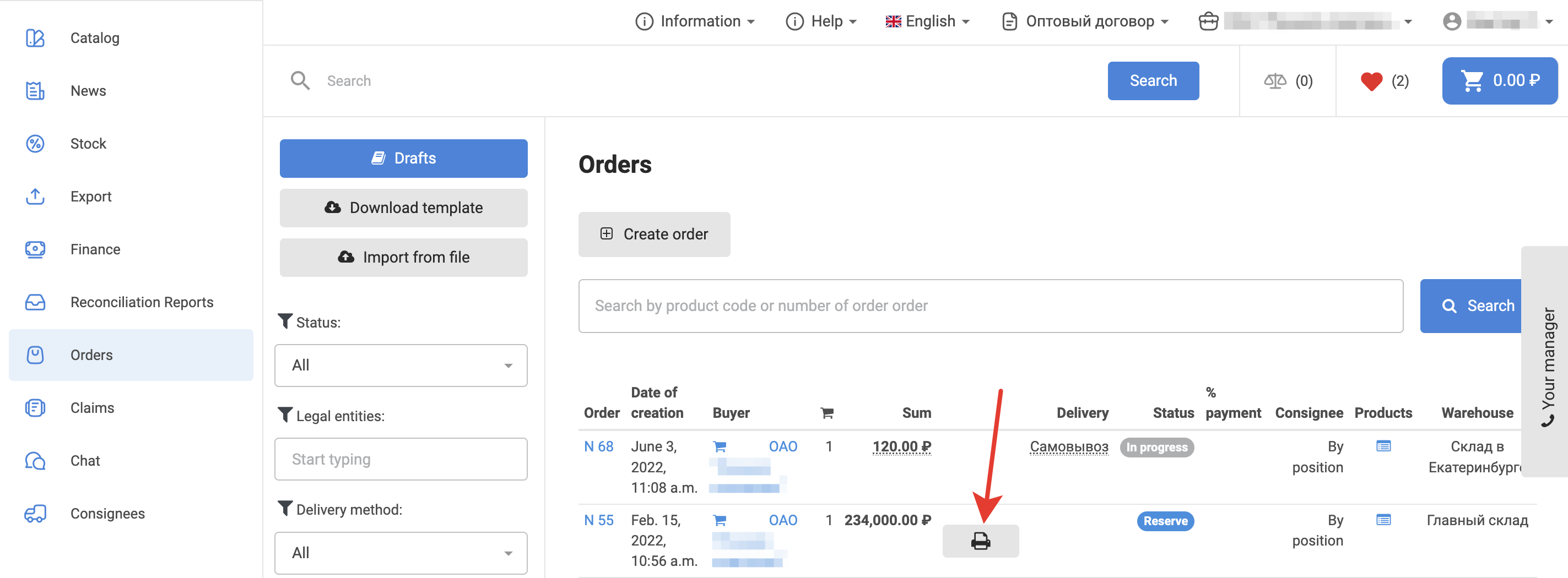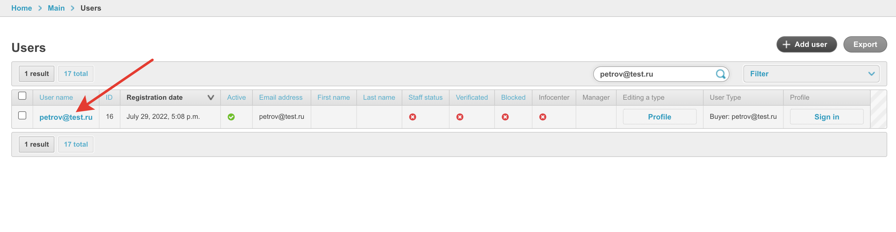 5. How to manually add an image of the added product to the catalog?To download the image, you need to log in to the supplier’s personal account and, in the My catalog section, go to editing the card for the necessary product by clicking on the icon displayed next to the product name or in the product card itself: In the window that opens, all product properties will be available for editing. At the bottom of the page that opens, find the Images section and click on the Add file button to upload an image. Next, you need to select a file from the local storage and after all the images are added, click the Save button located on the left side of the page. After these steps, the image will be uploaded for the product and displayed in the catalog. Please note that when using product moderation, the changed product may be sent to the Awaiting moderation status if the Image field is selected as the fields for re-moderation. 6. Why can’t I print out the invoice?The ability to print an invoice appears if the reserve order status is reached or the next in the status line. However, through the Order Status Complience settings in the admin panel, you can configure the ability to print an invoice for any status in the line. To print/view an account, just log in to your account and go to the Orders section: In the window that opens, a list of all previously placed orders will be available. To print an invoice, just click on the print icon By clicking on the print invoice icon, the invoice form opens, which can be printed: 7. How to manually add a new category of products and assign part of the products to it?You need to log in to your provider account. Open the My Catalog section and click the Products categories button. The page with the current vendor categories opens. On this page, click the Add category button. After that, a window will open with the addition of a new category. It is necessary to fill in Name of category field, as well as in the Site category field on the site, immediately assign a match for a new category, or in other words, match it. Matching the category of the supplier with the category on the site is a prerequisite for its display in the buyer's catalog. If a category is not matched, then it will not be displayed in the catalog. The Parent category field is populated as needed when a nested category is created. After the fields are filled in, click the Save button. After saving the changes made, the category will appear in the list and if it has been matched, it will be displayed on the platform and the buyer will see the products in this category from his Personal Account. 8. Error registering. E-Mail Address/TIN is already in use.When registering a user, errors occur that E-Mail address or TIN is already used. Error example: These errors occur due to the fact that the TIN/e-mail data was specified during registration on the portal earlier. To resolve the issue, it is necessary to find the User who registered with this data earlier and restore access to it. To search for a user by e-mail, go to the administration panel in the Users section: A list of users will open on the page that opens and a search box will be available in which you can specify the desired e-mail and click on the search button: As a result, you will find the User you need and will be able to restore access for this Personal Account: Search by TIN can be carried out as follows: In the administrative panel, go to the Buyers section: A list of all Buyers will be presented on the page that opens and it is possible to specify the TIN in the search box: As a result, you will find an organization that is a Buyer and can be found using the name of this company in the Buyers section: Restoring access to the account is carried out similarly to the algorithm described in paragraph 1. 9. How to configure sending notifications of new orders to a specific e-mail?To do this, go to the Supplier’s personal account and go to its Settings: In the Settings section, you can specify the e-mail to which you need to send notifications of new orders. After saving the settings, notifications of new orders will be sent to the specified email. 10. What order notifications can be sent to the Customer.The Customer can set up the following notifications in his Personal Account: