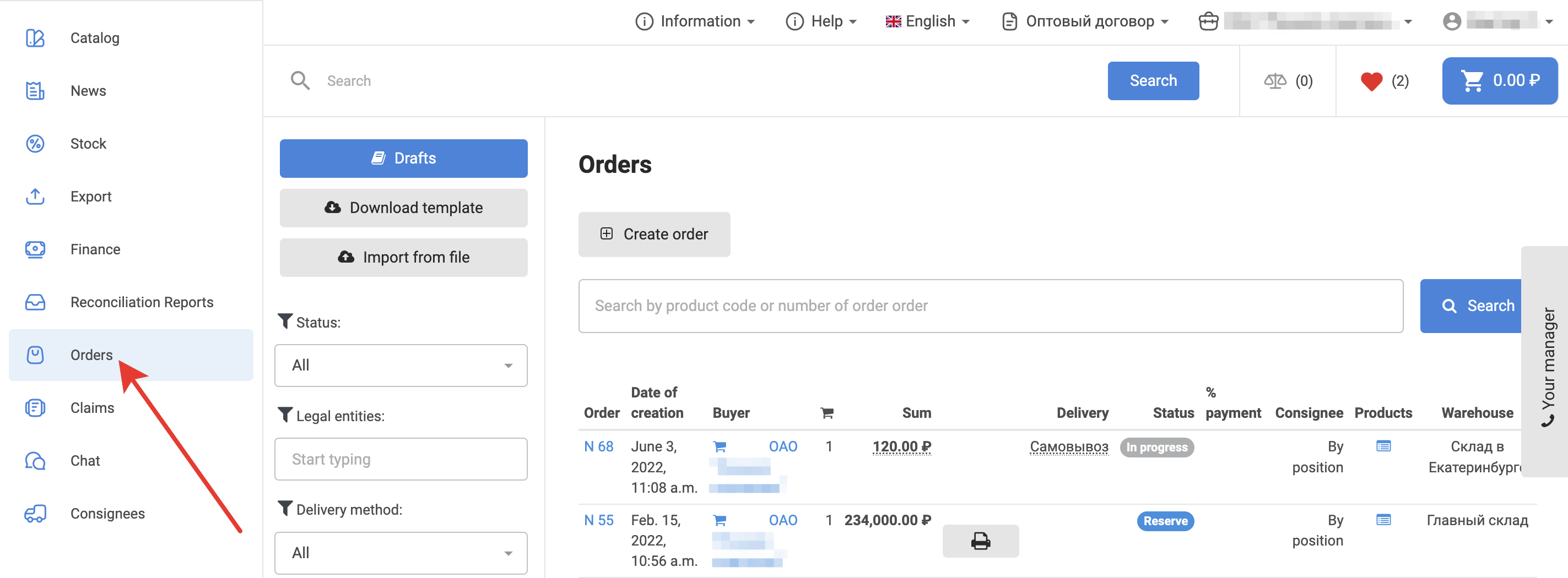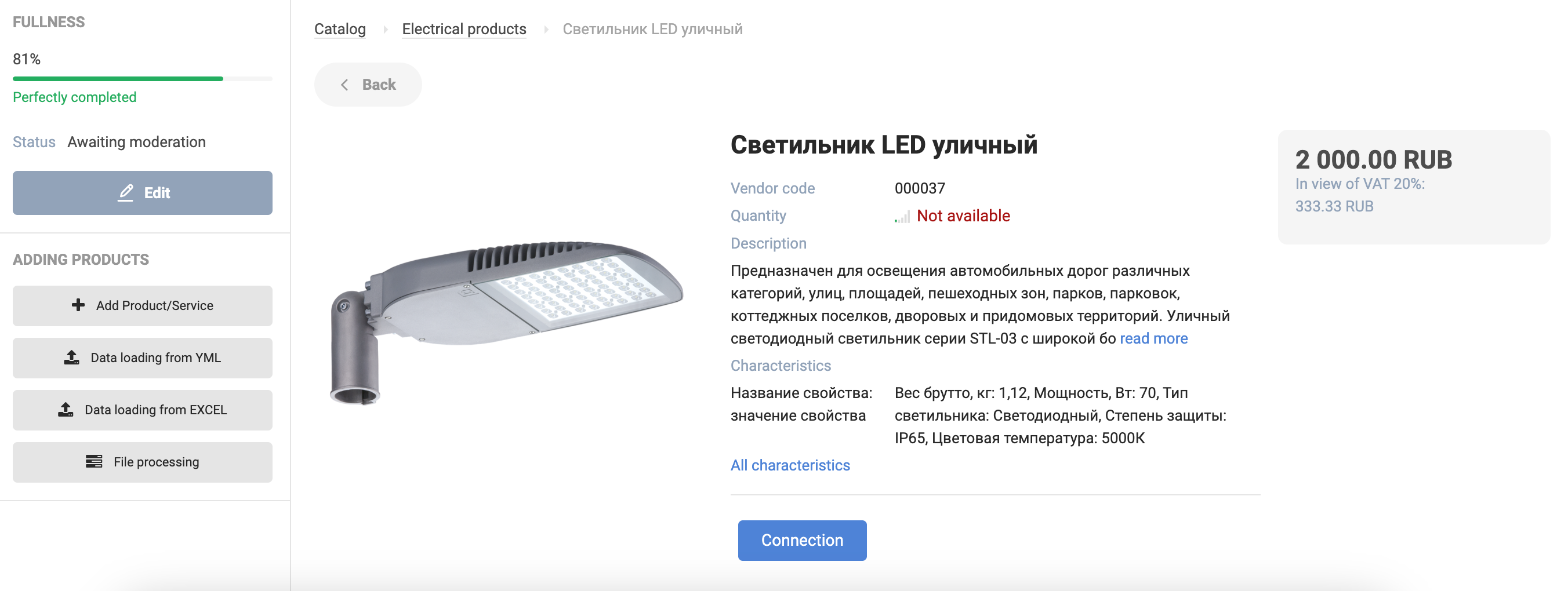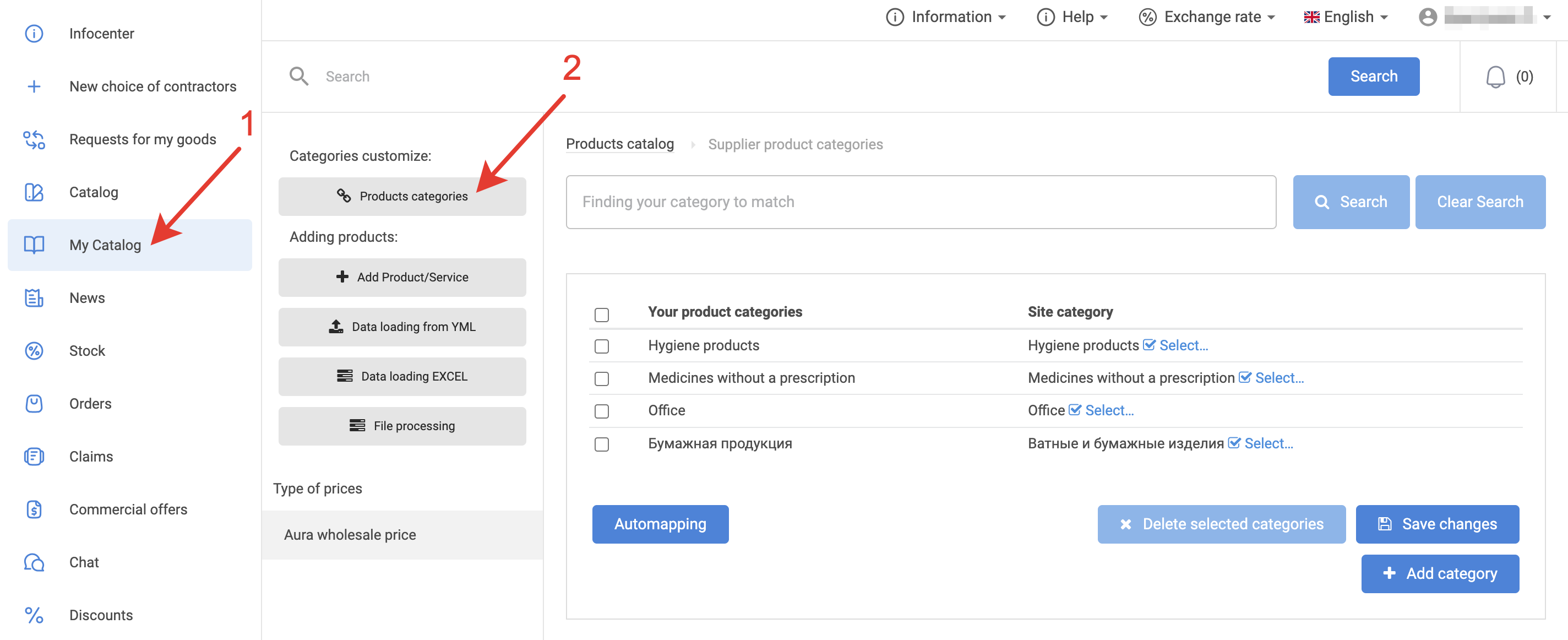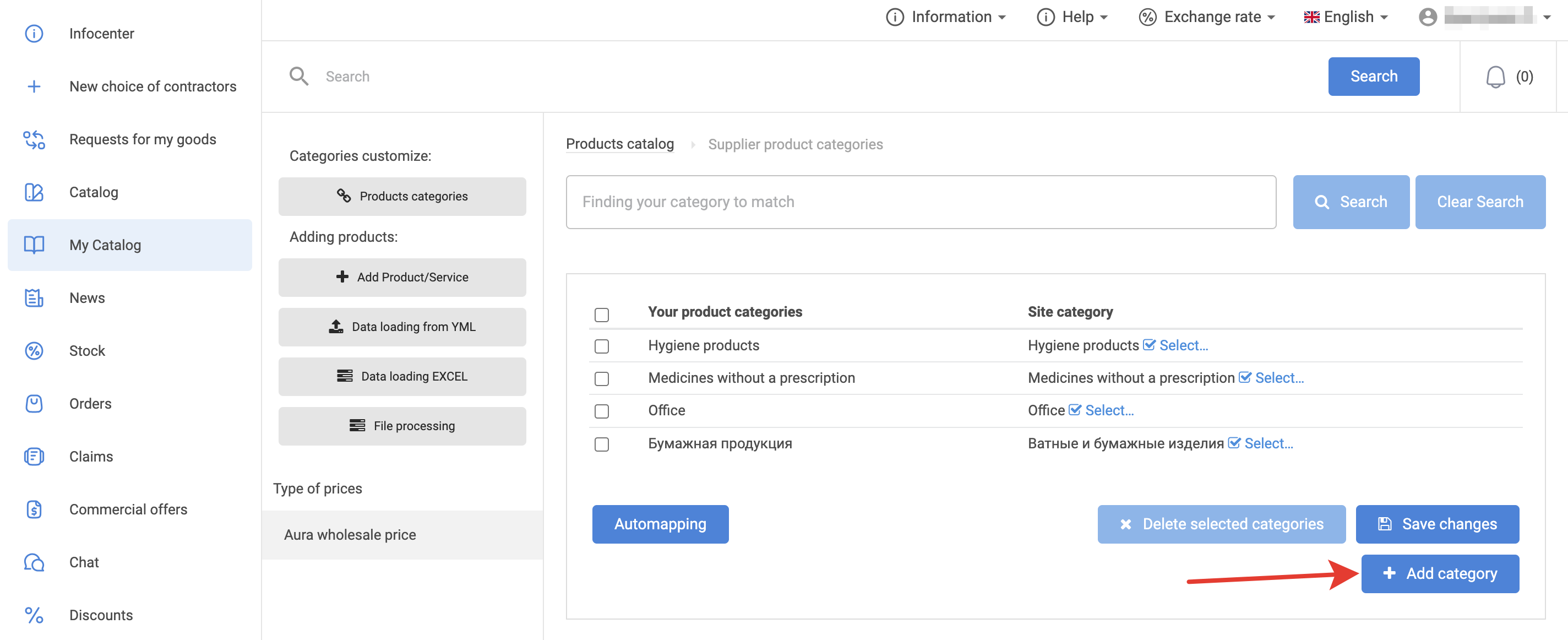 5. How to manually add an image of the added product to the catalog?To download the image, you need to log in to the supplier’s personal account and, in the My catalog section, go to editing the card for the necessary product by clicking on the icon displayed next to the product name or in the product card itself: In the window that opens, all product properties will be available for editing. At the bottom of the page that opens, find the Images section and click on the Add file button to upload an image. Next, you need to select a file from the local storage and after all the images are added, click the Save button located on the left side of the page. After these steps, the image will be uploaded for the product and displayed in the catalog. Please note that when using product moderation, the changed product may be sent to the Awaiting moderation status if the Image field is selected as the fields for re-moderation. 6. Why can’t I print out the invoice?The ability to print an invoice appears if the reserve order status is reached or the next in the status line. However, through the Order Status Complience settings in the admin panel, you can configure the ability to print an invoice for any status in the line. To print/view an account, just log in to your account and go to the Orders section: In the window that opens, a list of all previously placed orders will be available. To print an invoice, just click on the print icon By clicking on the print invoice icon, the invoice form opens, which can be printed: 7. How to manually add a new category of products and assign part of the products to it?You need to log in to your provider account. Open the My Catalog section and click the Products categories button. The page with the current vendor categories opens. On this page, click the Add category button. After that, a window will open with the addition of a new category. It is necessary to fill in Name of category field, as well as in the Site category field on the site, immediately assign a match for a new category, or in other words, match it. Matching the category of the supplier with the category on the site is a prerequisite for its display in the buyer's catalog. If a category is not matched, then it will not be displayed in the catalog. The Parent category field is populated as needed when a nested category is created. After the fields are filled in, click the Save button. After saving the changes made, the category will appear in the list and if it has been matched, it will be displayed on the platform and the buyer will see the products in this category from his Personal Account. 8. Error registering. E-Mail Address/TIN is already in use.When registering a user, errors occur that E-Mail address or TIN is already used. Error example: These errors occur due to the fact that the TIN/e-mail data was specified during registration on the portal earlier. To resolve the issue, it is necessary to find the User who registered with this data earlier and restore access to it. To search for a user by e-mail, go to the administration panel in the Users section: A list of users will open on the page that opens and a search box will be available in which you can specify the desired e-mail and click on the search button: As a result, you will find the User you need and will be able to restore access for this Personal Account: Search by TIN can be carried out as follows: In the administrative panel, go to the Buyers section: A list of all Buyers will be presented on the page that opens and it is possible to specify the TIN in the search box: As a result, you will find an organization that is a Buyer and can be found using the name of this company in the Buyers section: Restoring access to the account is carried out similarly to the algorithm described in paragraph 1. 9. How to configure sending notifications of new orders to a specific e-mail?To do this, go to the Supplier’s personal account and go to its Settings: In the Settings section, you can specify the e-mail to which you need to send notifications of new orders. After saving the settings, notifications of new orders will be sent to the specified email. 10. What order notifications can be sent to the Customer.The Customer can set up the following notifications in his Personal Account: