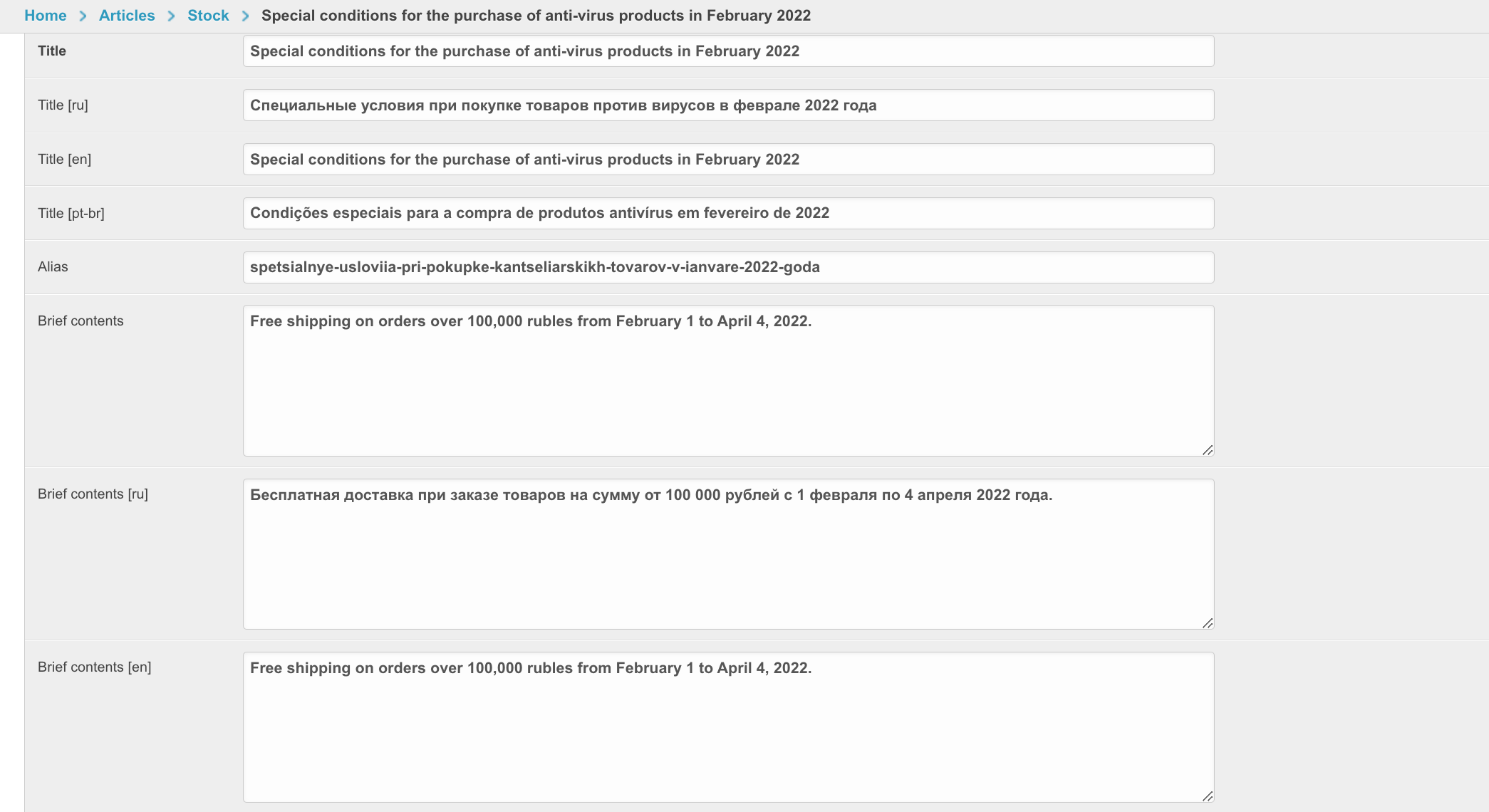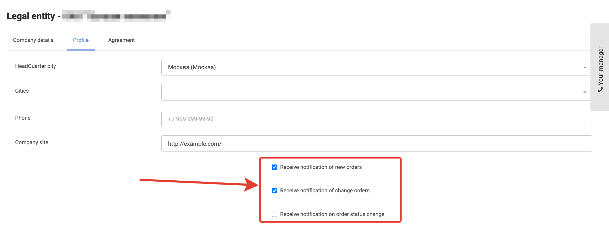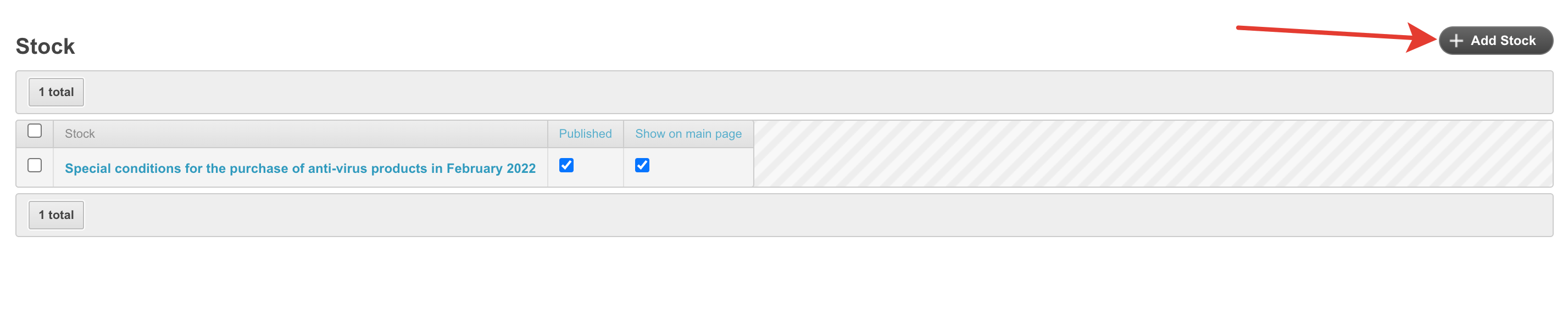 To configure the sending of notifications, you need to go to the Personal Account settings in the Profile section, it will be available if you go to the Legal entity setting. Next, go to the Profile tab and select the necessary alerts with checkboxes. After saving the settings, the selected notifications will be sent to the user's contact email. 11. How to get shares on the portal.In order to start a share, go to the administrative panel, in the Stock section: Next, click on the Add Stock button. For registration of the action you must fill in the following data: