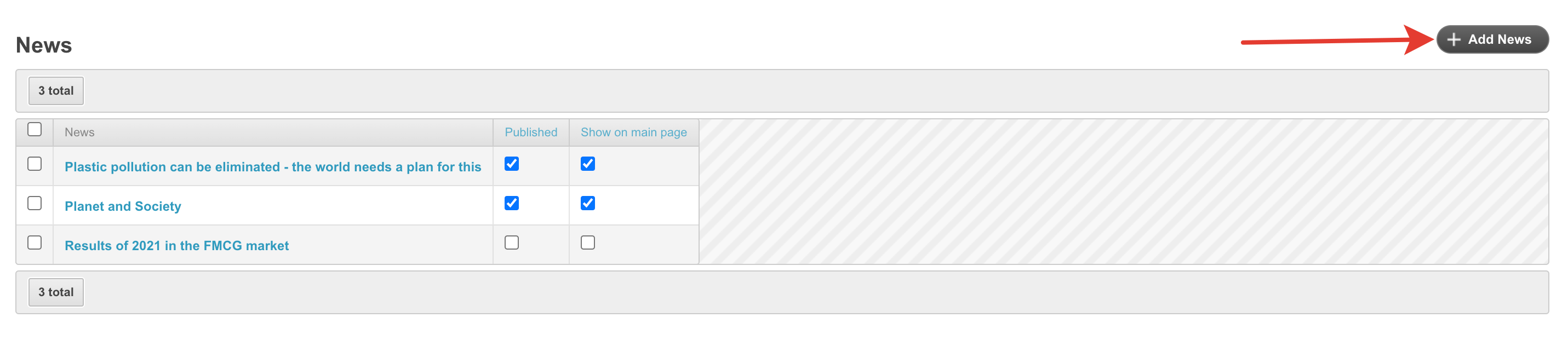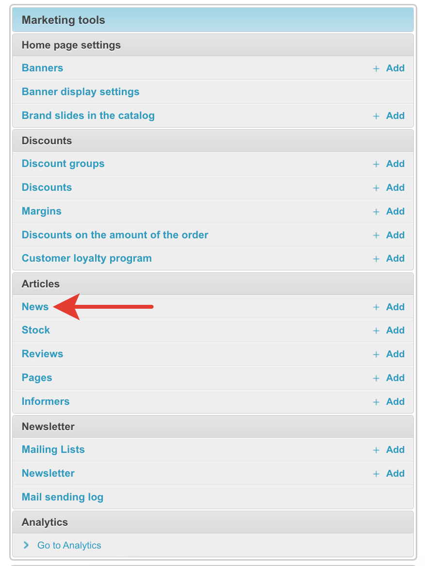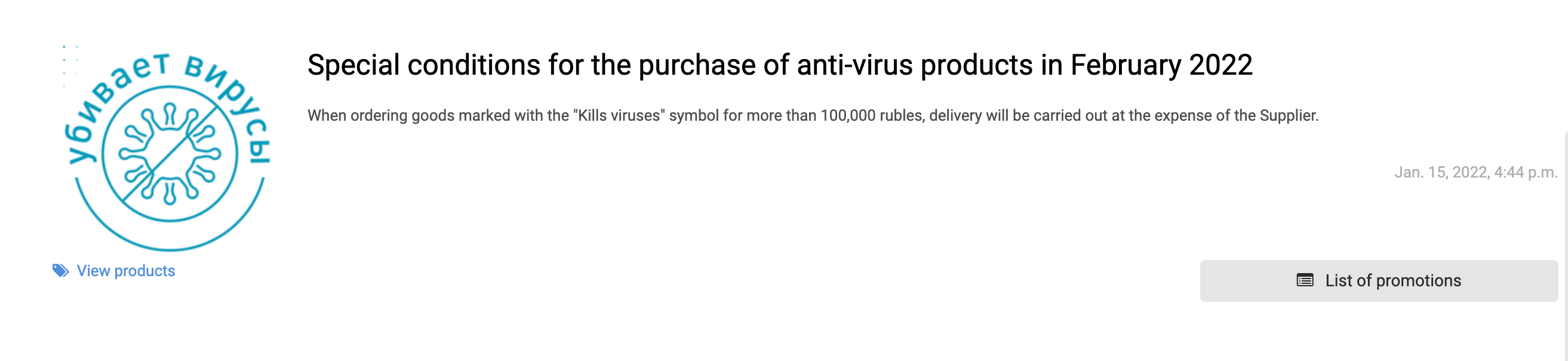 After that, it is necessary to mark the check box Published, then click the Save button. The promotion will be displayed in the customer’s account as follows: To view additional information on the promotion, the user needs to click on the name of the promotion. Inside the promotion, a View Products link will be displayed, which will lead to a catalog page with products linked to the promotion, which the buyer can immediately add to the cart. 12. How to add news on the portal.To post news on the portal, go to the News section. Next, you need to click on the Add News button: To create News, you must fill in the following data:
