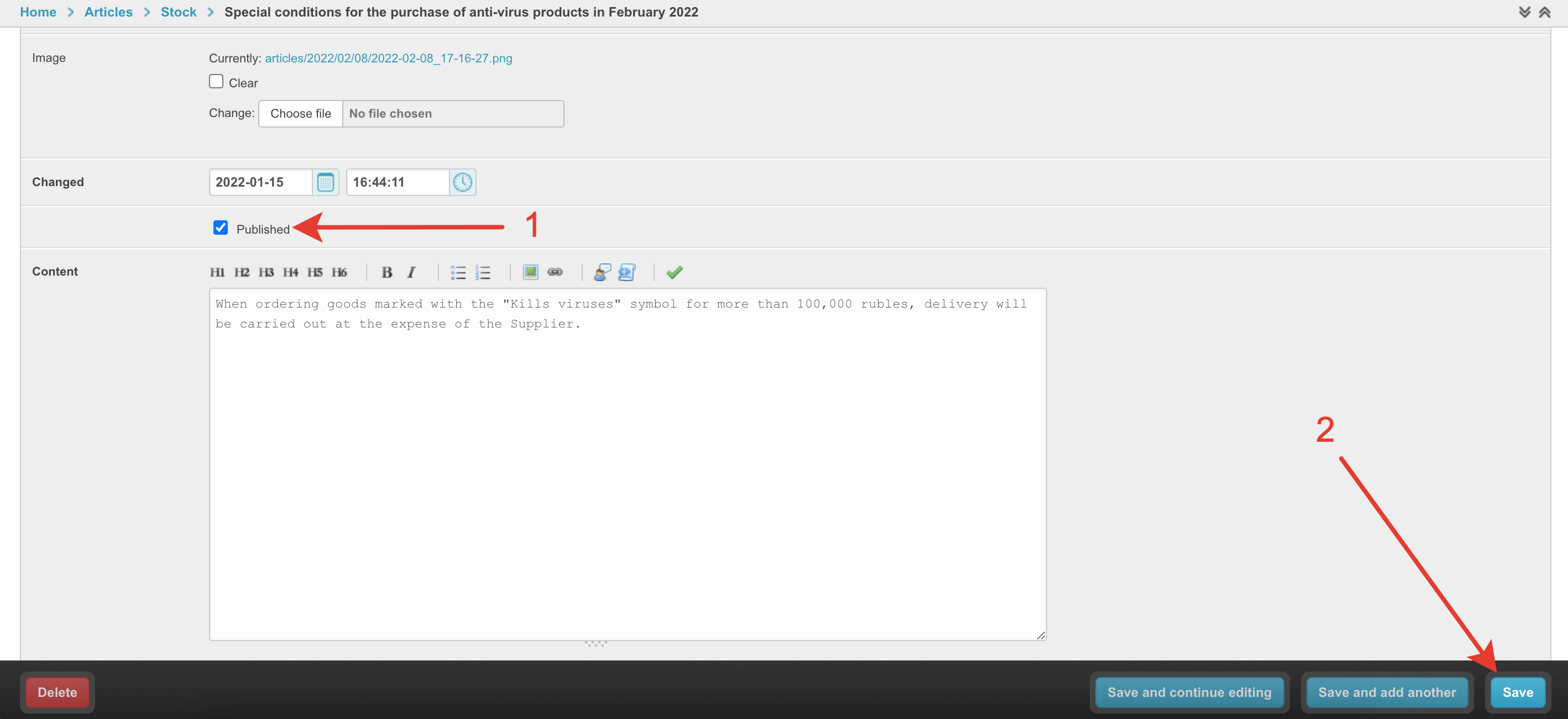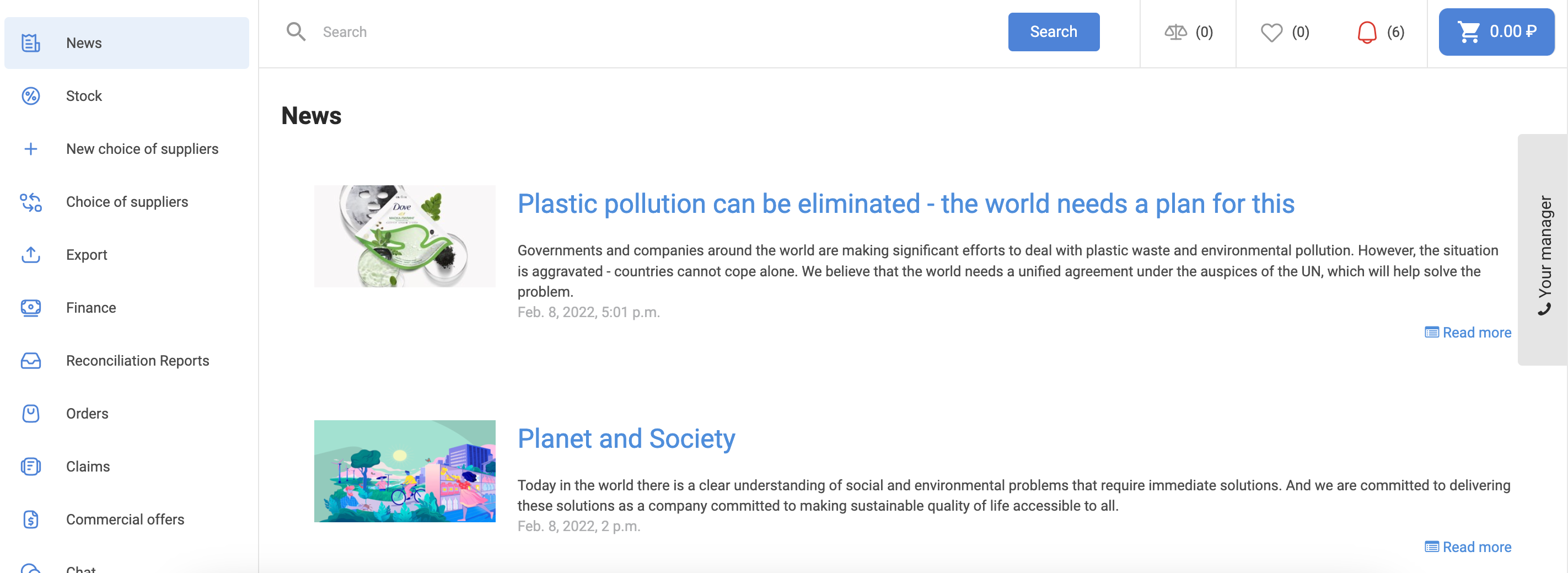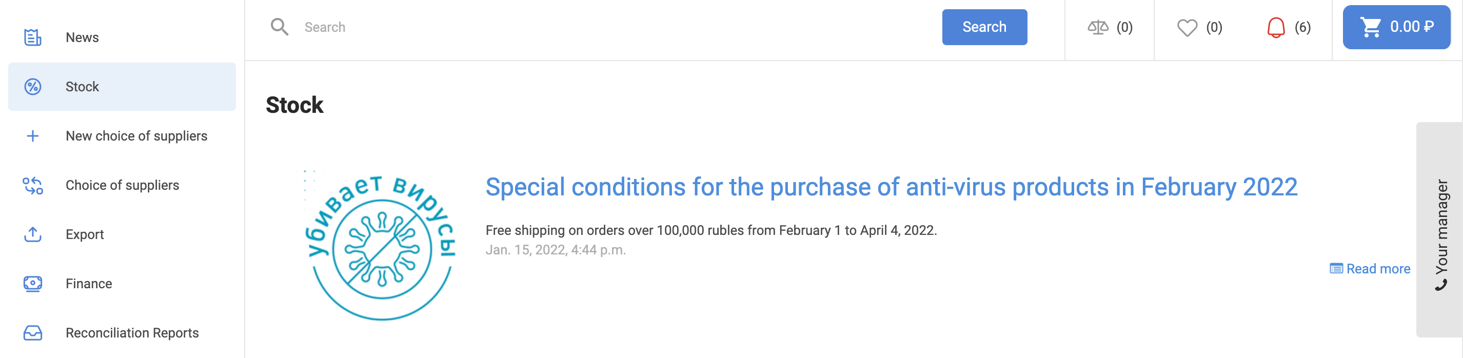 After that, it is necessary to mark the check box Published, then click the Save button. The promotion will be displayed in the customer’s account as follows: To view additional information on the promotion, the user needs to click on the name of the promotion. Inside the promotion, a View Products link will be displayed, which will lead to a catalog page with products linked to the promotion, which the buyer can immediately add to the cart. 12. How to add news on the portal.To post news on the portal, go to the News section. Next, you need to click on the Add News button: To create News, you must fill in the following data: